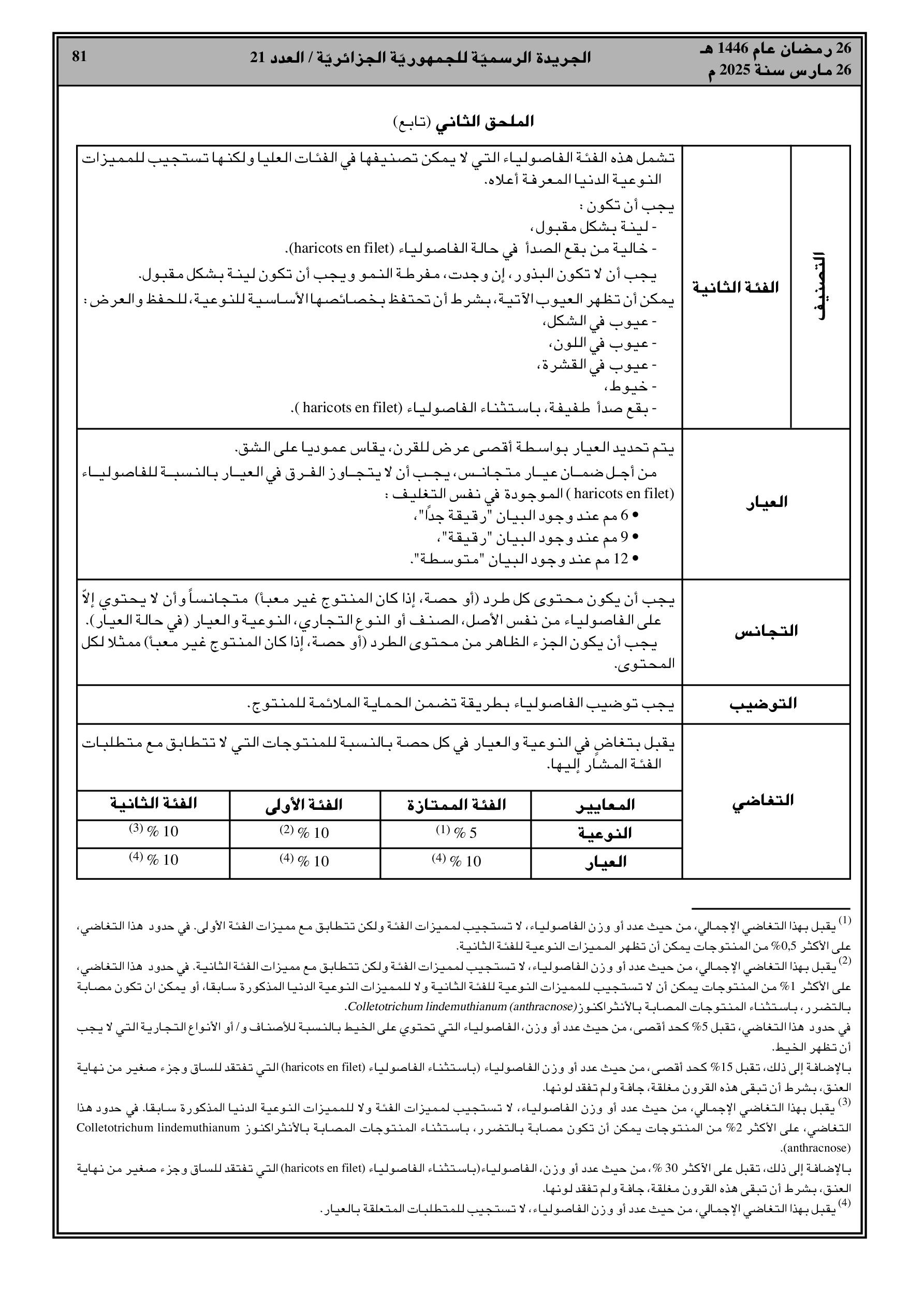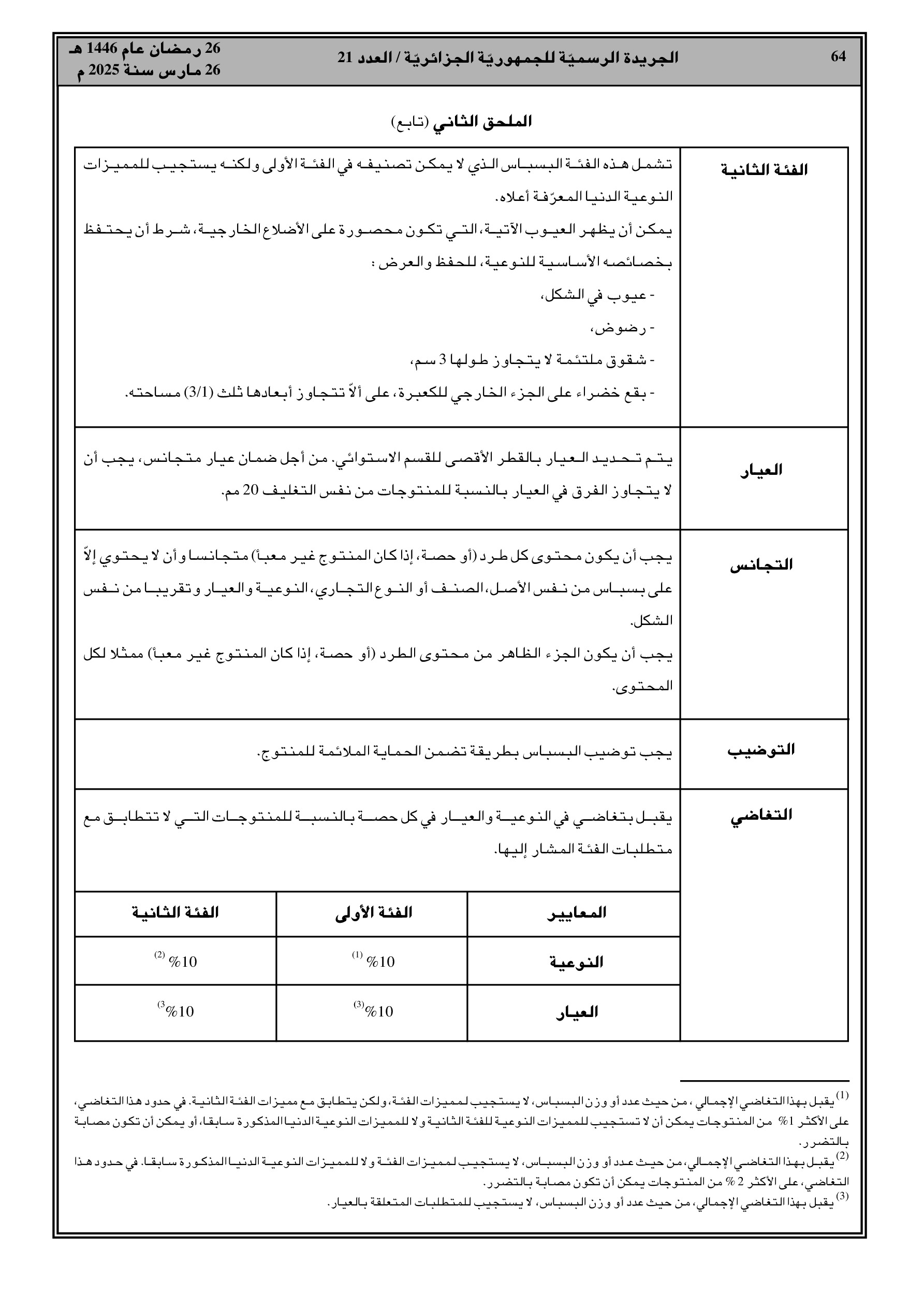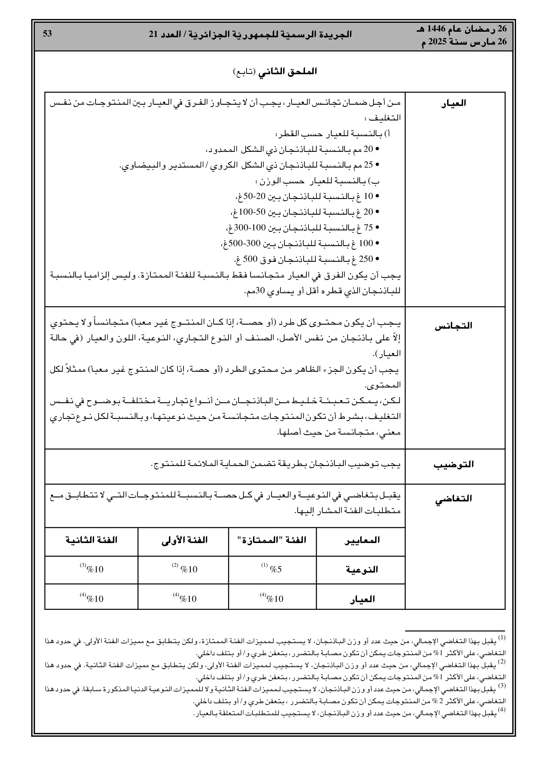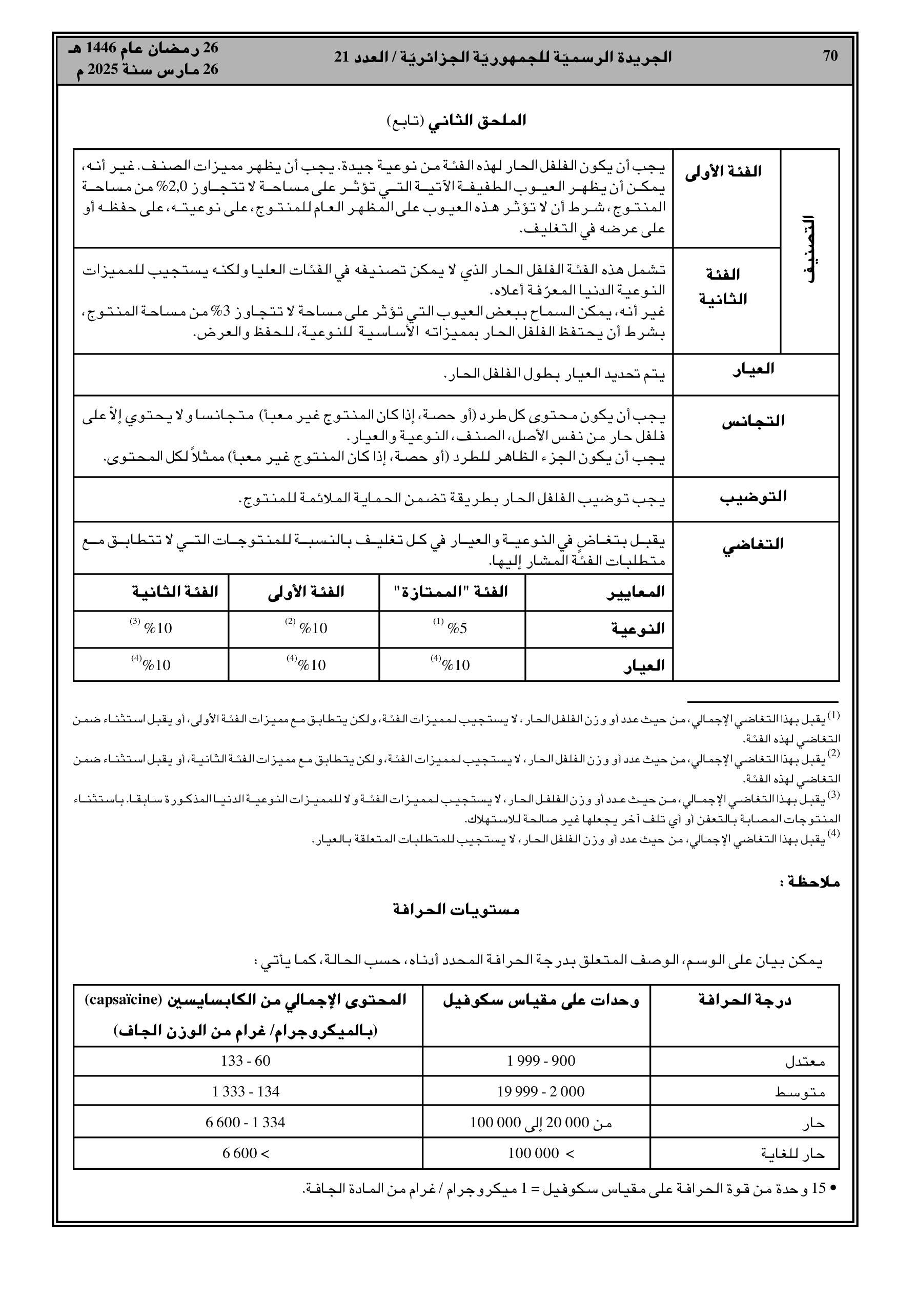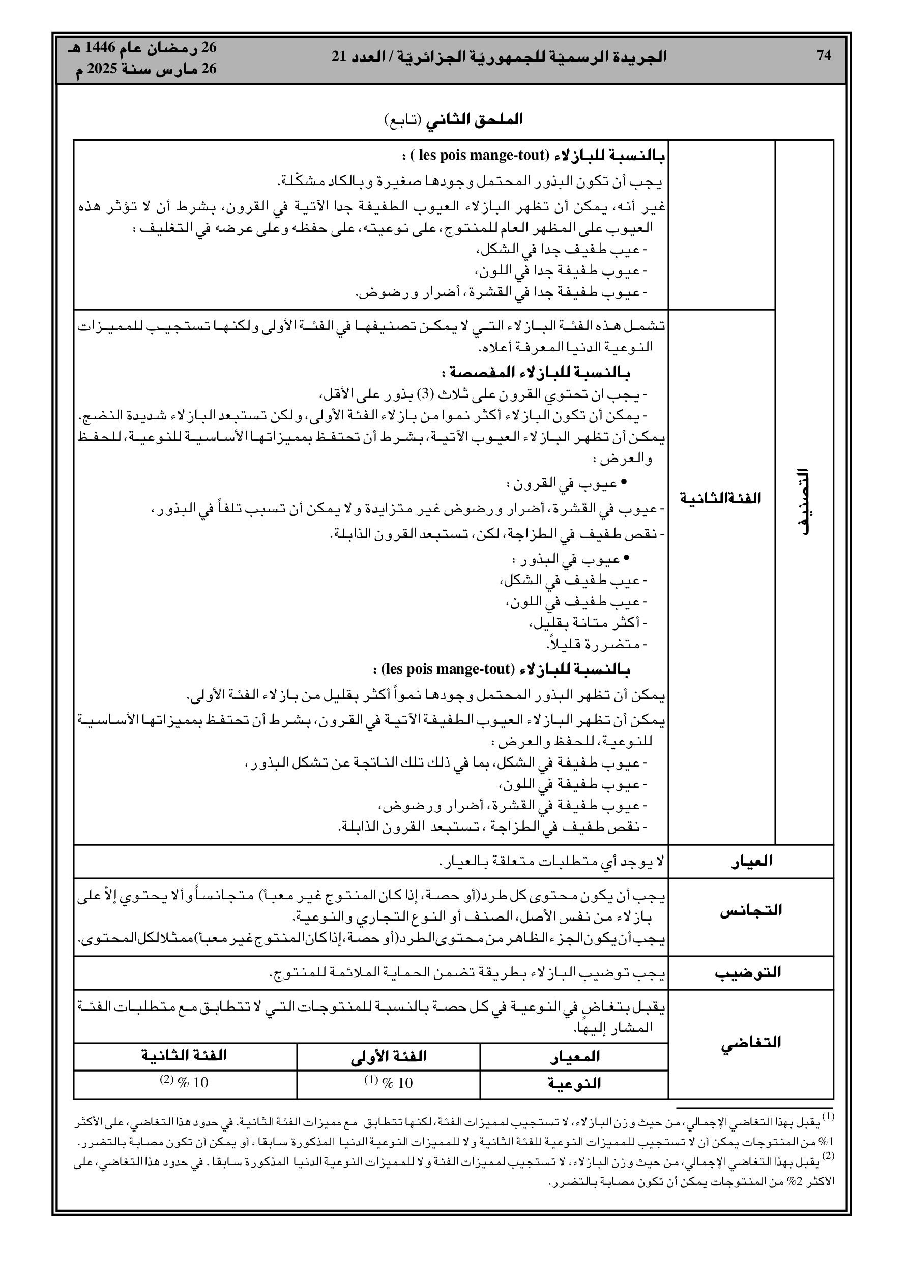 قرار وزاري مشترك يعتمد اللائحة الفنية التي تحدد المواصفات وشروط عرض الفواكه والخضر الطازجة الموجهة للاستهلاك البشري. يحدد المصطلحات الأساسية، متطلبات الجودة والنضج الدنيا، وشروط النقل، النظافة، والعرض. يحظر القرار المعالجات غير المصرح بها والتلوين الاصطناعي، ويحدد متطلبات التعبئة والتغليف والوسم. يلغي القرار المؤرخ في 8 يناير 1994، ويمنح مهلة امتثال لمدة عام واحد. الملحق الأول يפרّق الخصائص التفصيلية لعدة فواكه (مثل المشمش، الحمضيات، الخوخ، التفاح، العنب، الطماطم). الملحق الثاني يפרّق خصائص مختلف الخضروات (مثل الخرشوف، الجزر، القرنبيط، الباذنجان، الكوسة، البطاطس).