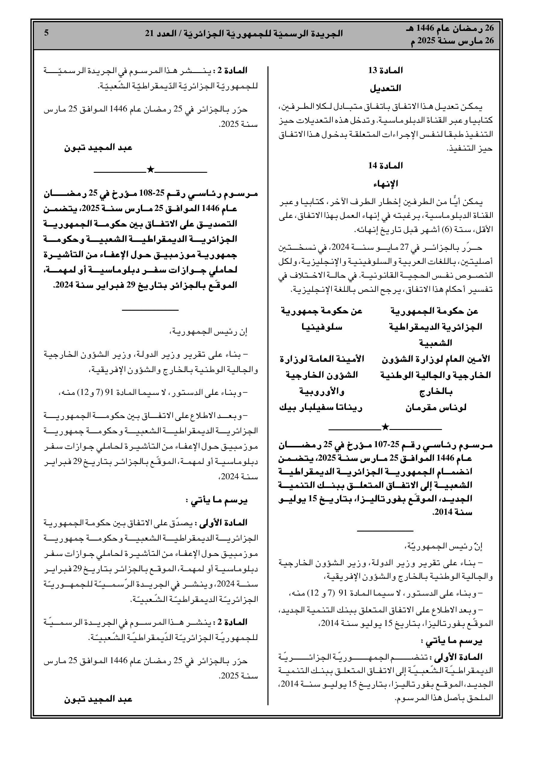 مرسوم رئاسي يصادق على الاتفاق مع حكومة جمهورية سلوفينيا بشأن الإعفاء المتبادل من تأشيرة الإقامة القصيرة لحاملي جوازات السفر الدبلوماسية والخدمة، الموقع بالجزائر في 27 مايو 2024. يسمح بالدخول والعبور والإقامة والخروج بدون تأشيرة لمدة تصل إلى 90 يومًا خلال فترة 180 يومًا. يحدد الاتفاق جوازات السفر المعمول بها، والاستثناءات المتعلقة بتأشيرات الاعتماد، وشروط الدخول والخروج، والالتزامات الوطنية، وتبادل الوثائق، والتعليق، وتسوية المنازعات، وشروط النفاذ والمدة والتعديل والإنهاء.