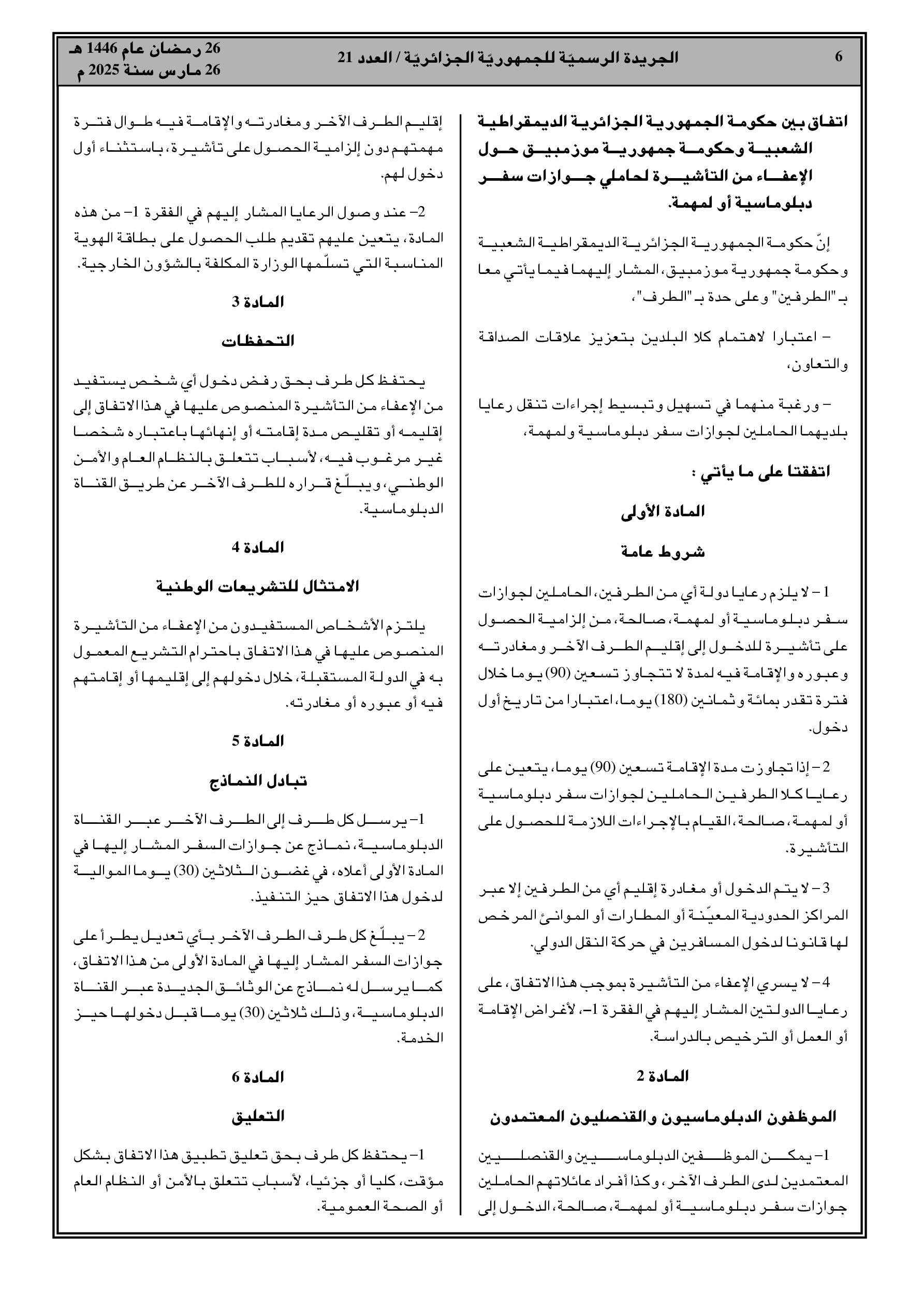 مرسوم رئاسي يصادق على الاتفاق مع حكومة جمهورية موزمبيق بشأن الإعفاء من التأشيرة لحاملي جوازات السفر الدبلوماسية أو الخدمة، الموقع بالجزائر في 29 فبراير 2024. يسمح بالدخول والخروج والعبور والإقامة بدون تأشيرة لمدة تصل إلى 90 يومًا خلال فترة 180 يومًا. يتضمن أحكامًا خاصة بالمسؤولين الدبلوماسيين المعتمدين، وتبادل النماذج، والتعليق، وتسوية المنازعات.
