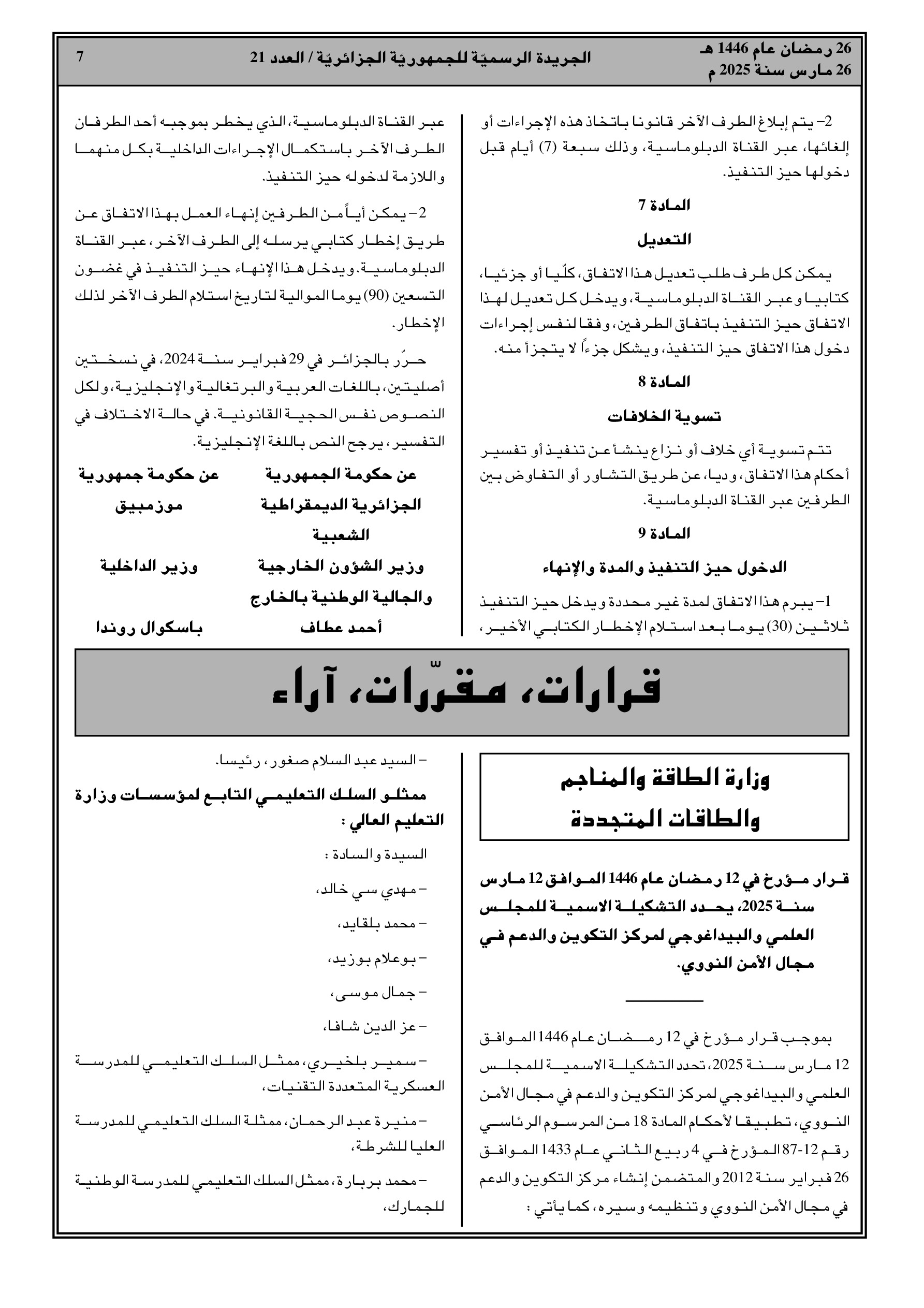 قرار يحدد التشكيلة الاسمية للمجلس العلمي والبيداغوجي لمركز التكوين والدعم للأمن النووي. يضم المجلس رئيسًا وأعضاء يمثلون التعليم العالي، المدرسة العسكرية متعددة التقنيات، المدرسة العليا للشرطة، المدرسة الوطنية للجمارك، المدرسة الوطنية للحماية المدنية، المعهد الوطني للأدلة الجنائية وعلم الإجرام للدرك الوطني، المديرية العامة للأمن الوطني، مراكز البحث النووي، المعهد الدبلوماسي، وهيئة التدريس بالمركز.