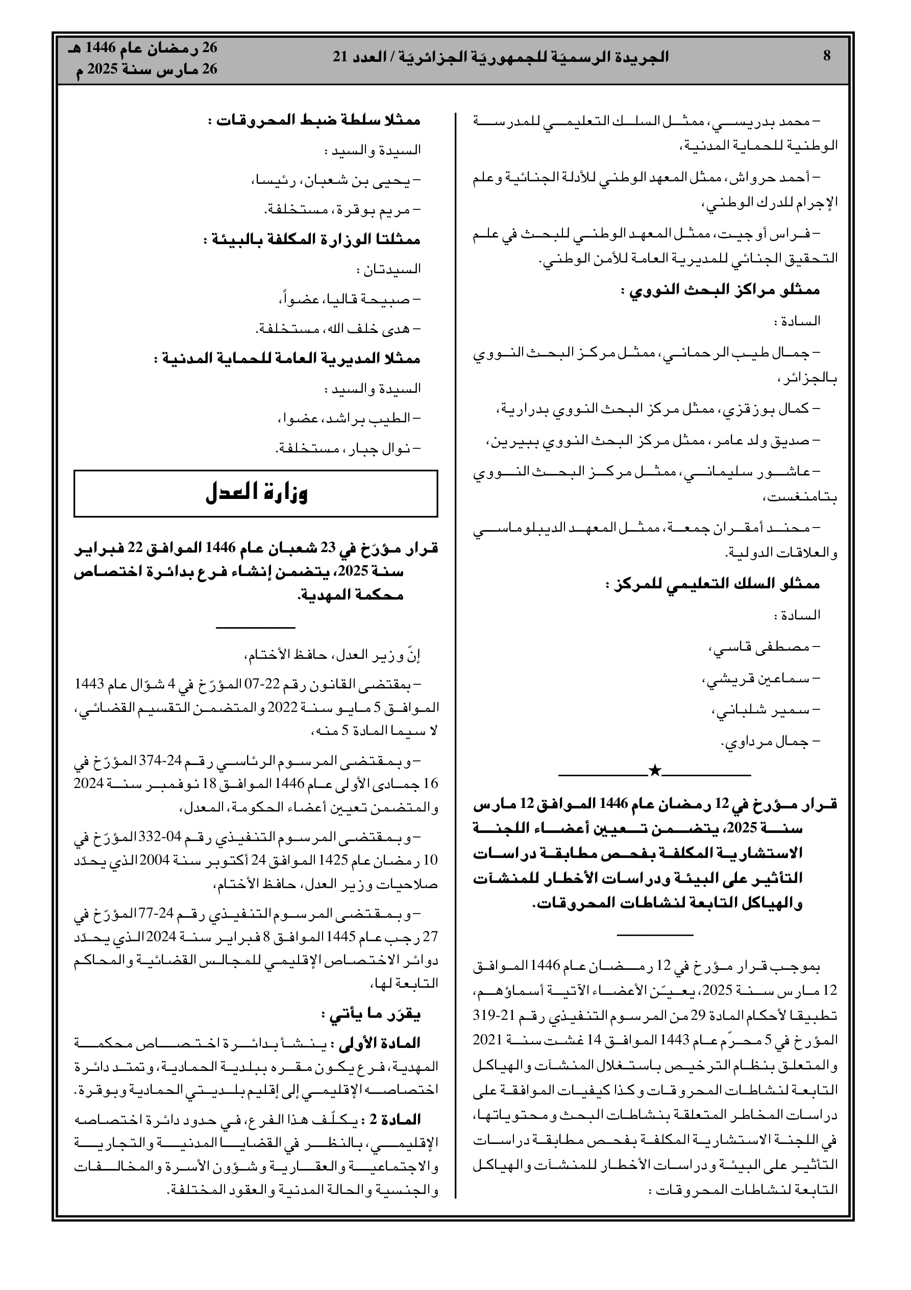 قرار يتضمن تعيين أعضاء لجنة التشاور المكلفة بدراسة مطابقة دراسات التأثير على البيئة ودراسات الأخطار للمنشآت والأشغال المتعلقة بأنشطة المحروقات. تضم اللجنة ممثلين عن سلطة ضبط المحروقات، وزارة البيئة، والمديرية العامة للحماية المدنية.