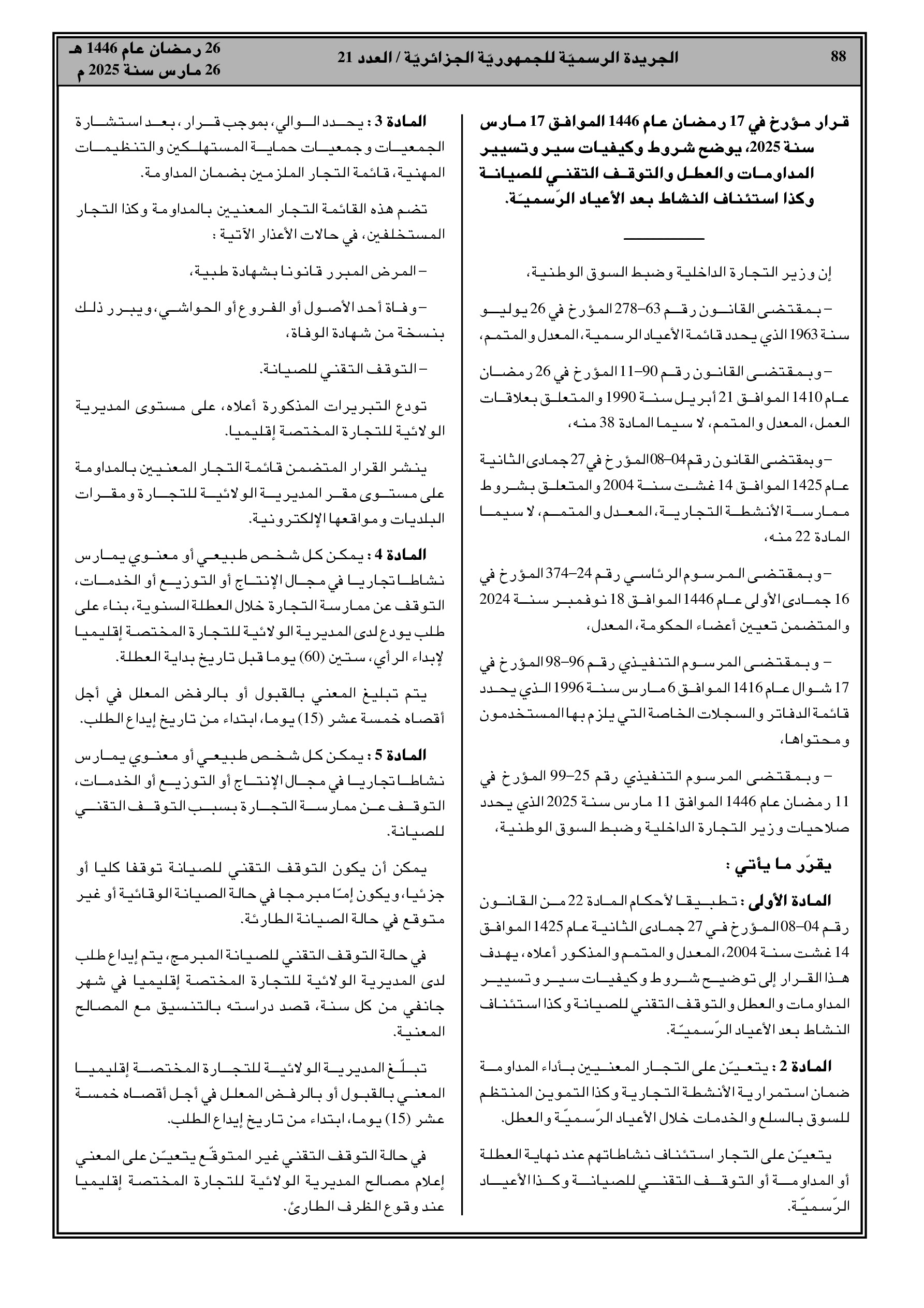 قرار يحدد شروط وكيفيات تسيير المداومات، العطل، التوقف الفني للصيانة، واستئناف النشاط بعد الأعياد القانونية. يجب على التجار ضمان استمرارية النشاط وتزويد السوق خلال العطل. الوالي يحدد قائمة التجار المعنيين بالمداومة. يمكن طلب الإغلاق للعطلة السنوية أو التوقف الفني مسبقًا من مديرية التجارة الولائية.