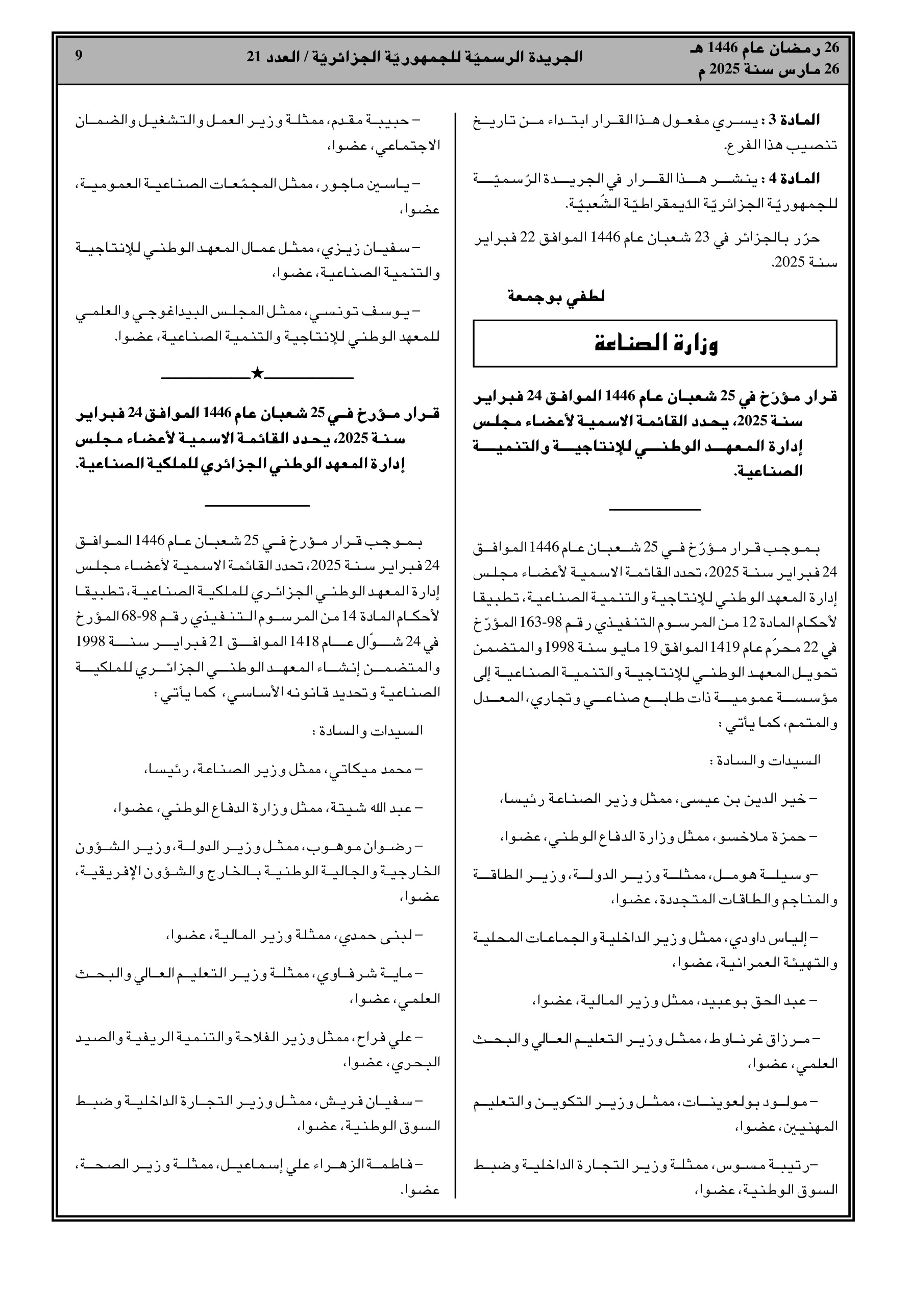 تعيين أعضاء مجلس إدارة المعهد الوطني للإنتاجية والتنمية الصناعية.