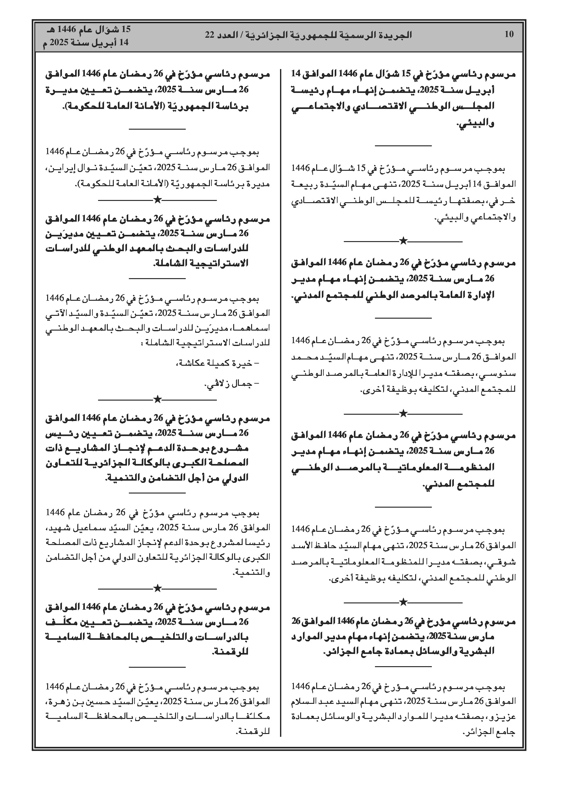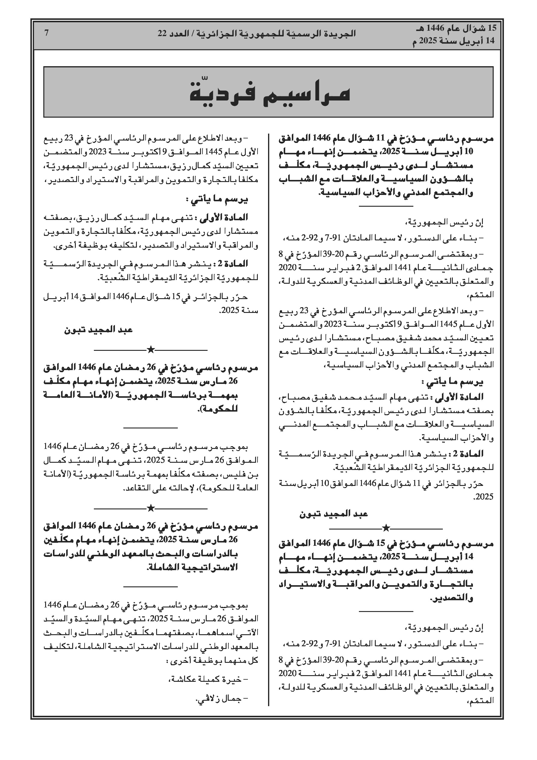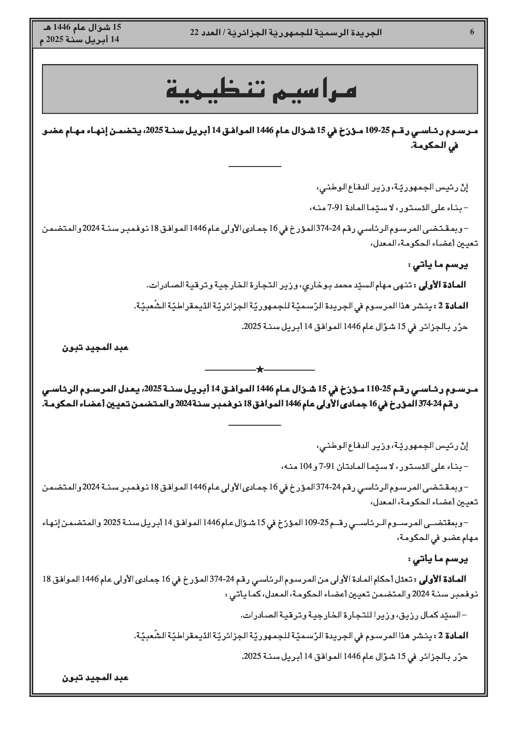 مرسوم رئاسي رقم 25-109 يقضي بإنهاء مهام وزير التجارة الخارجية وترقية الصادرات، السيد محمد بوخاري. - مرسوم رئاسي رقم 25-110 يعدل مرسوم تعيين أعضاء الحكومة، حيث تم تعيين السيد كمال رزيق وزيراً للتجارة الخارجية وترقية الصادرات.