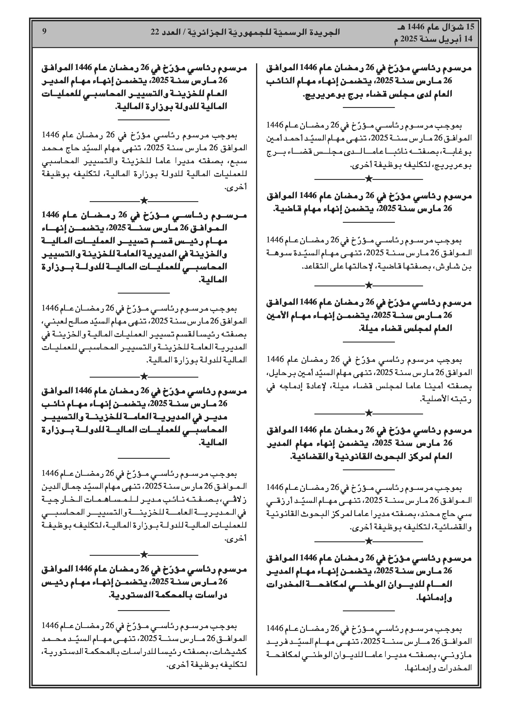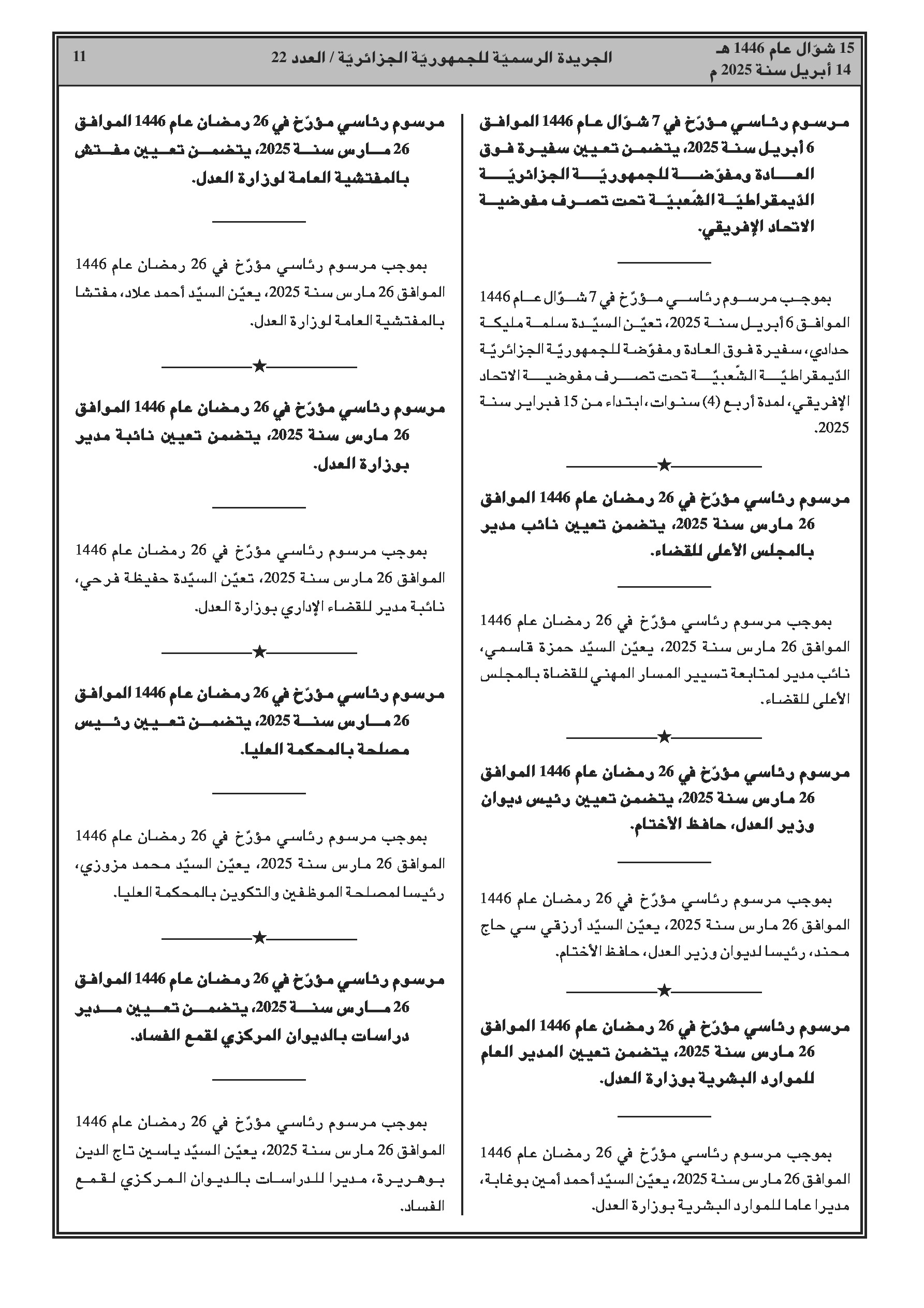 تعيين مسؤولين جدد في رئاسة الجمهورية، الوزارات، والهيئات القضائية والوطنية.