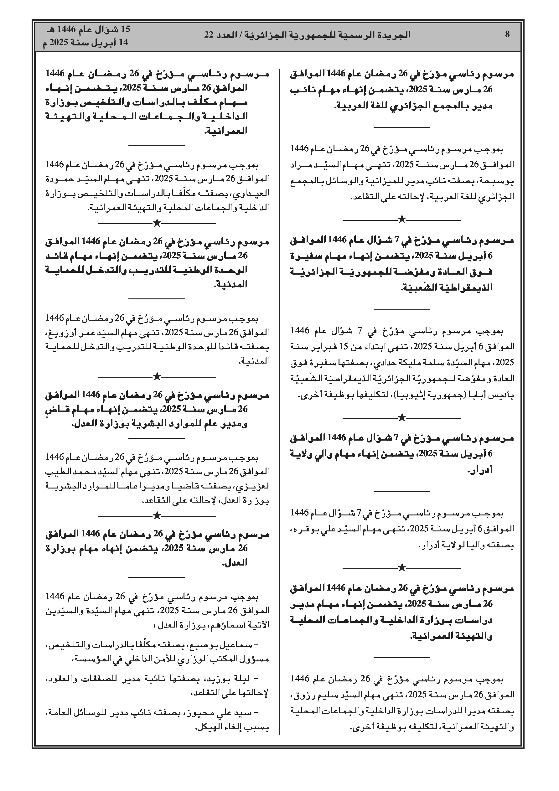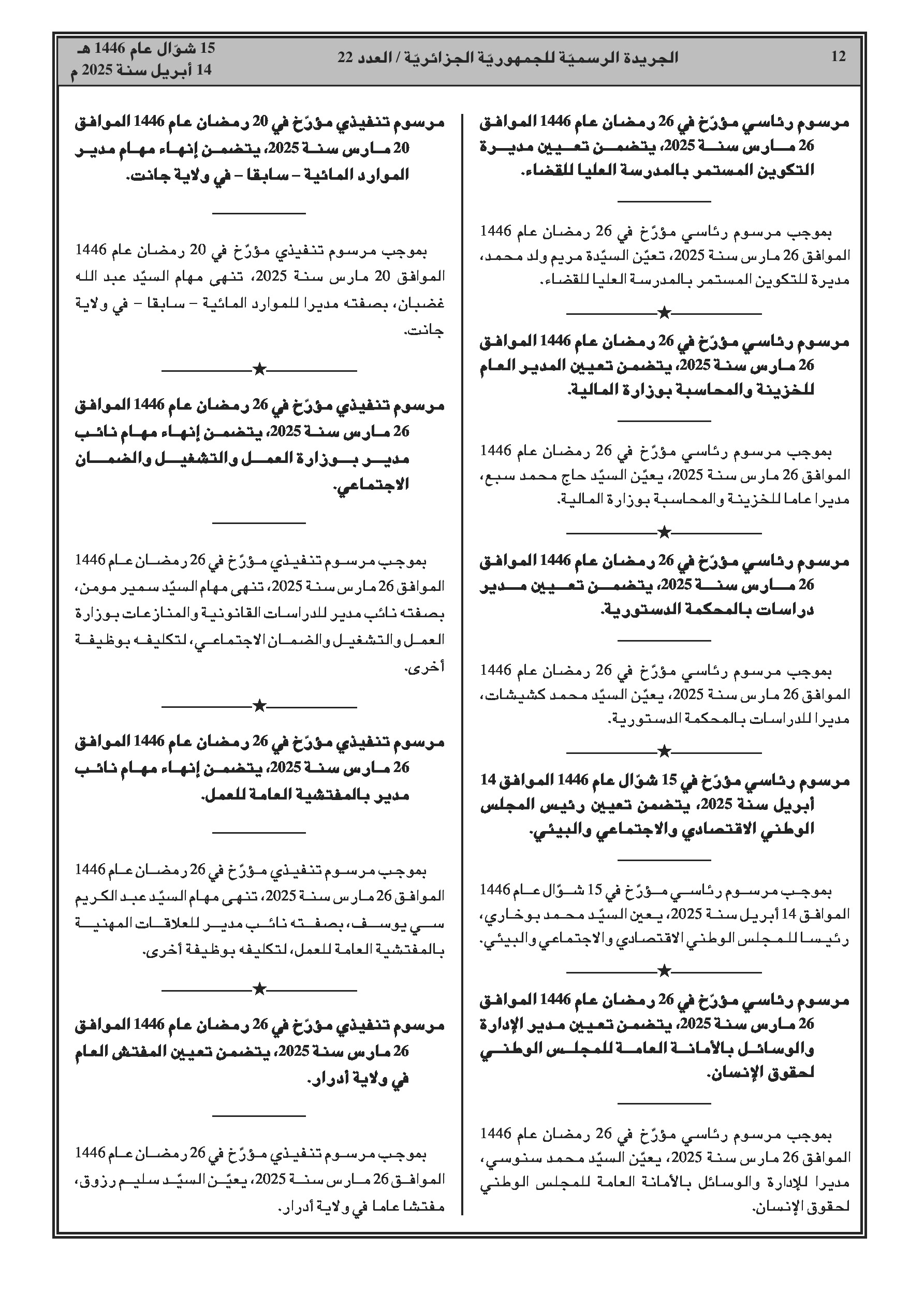 إنهاء مهام المدير السابق للموارد المائية لولاية جانت. - إنهاء مهام مديرين فرعيين بوزارة العمل والتشغيل والضمان الاجتماعي والمفتشية العامة للعمل. - تعيين المفتش العام لولاية أدرار. - تعيين رئيس ديوان وزير التجارة الخارجية وترقية الصادرات. - تعيينات بوزارة العمل والتشغيل والضمان الاجتماعي.