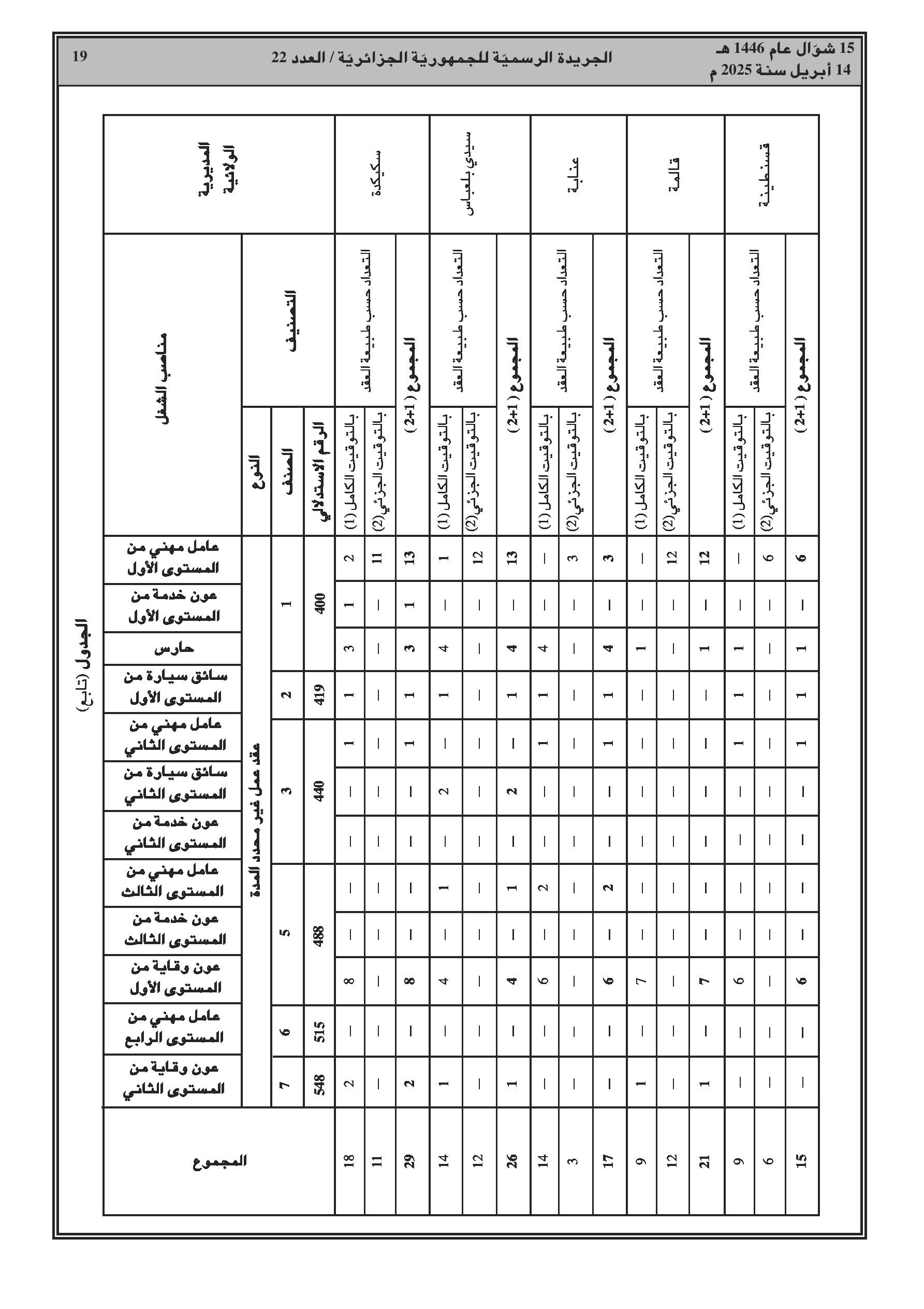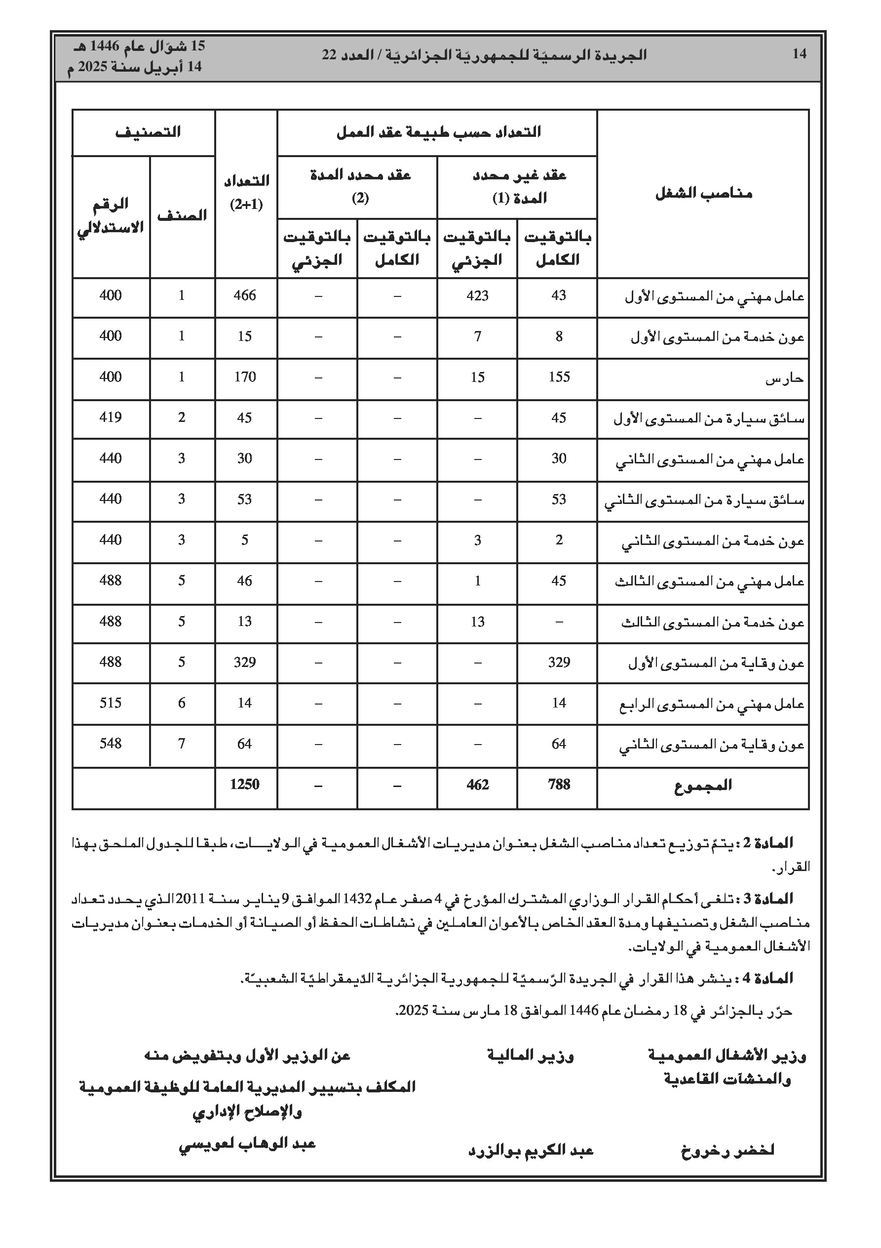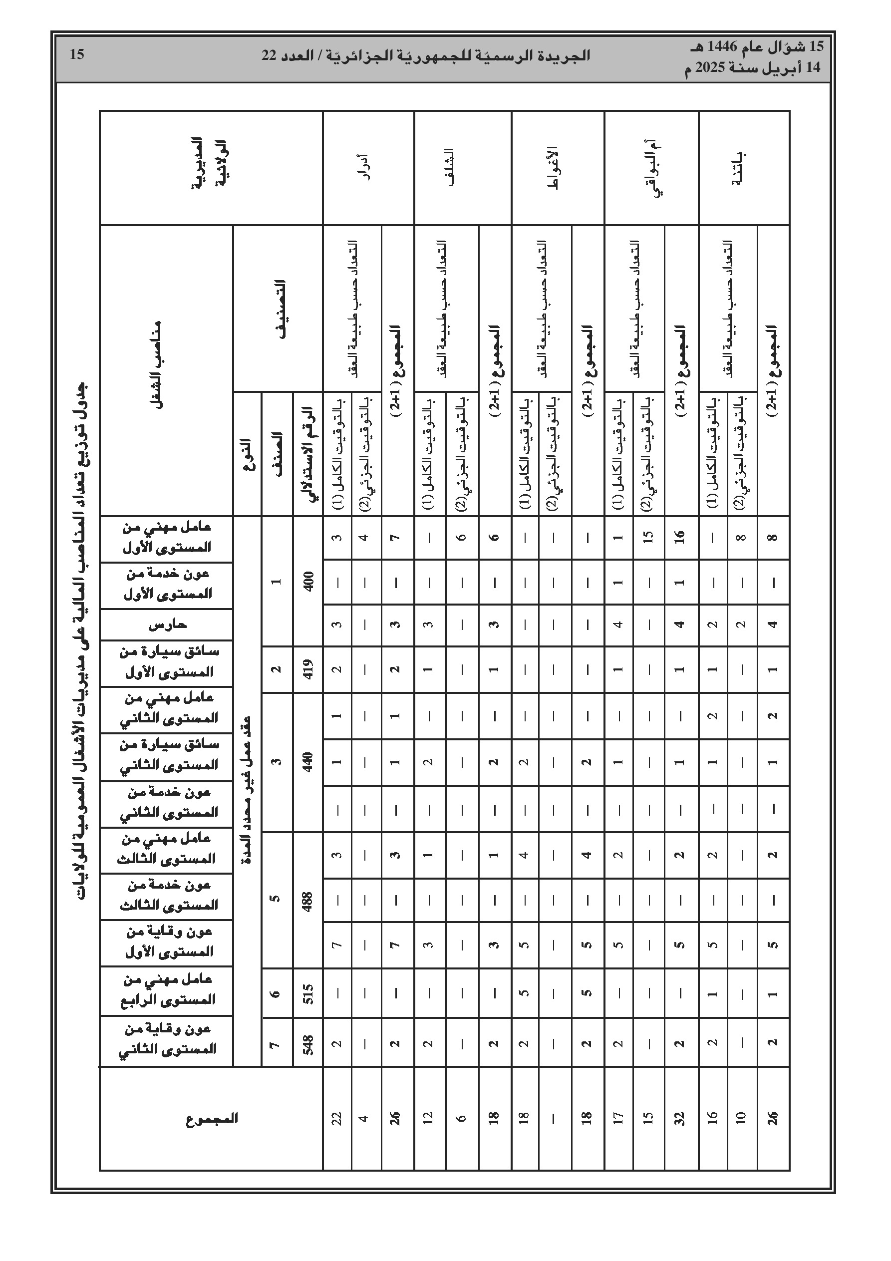 يحدد هذا القرار الوزاري المشترك المؤرخ في 18 مارس 2025، تعدادات الموظفين حسب المنصب، تصنيفهم، ومدة عقود الأعوان الذين يمارسون أنشطة الصيانة، الحفظ أو الخدمة على مستوى مديريات الأشغال العمومية للولايات. يتضمن القرار جداول مفصلة لتوزيع هذه التعدادات حسب طبيعة عقد العمل والفئات والرتب الموافقة لكل منصب.