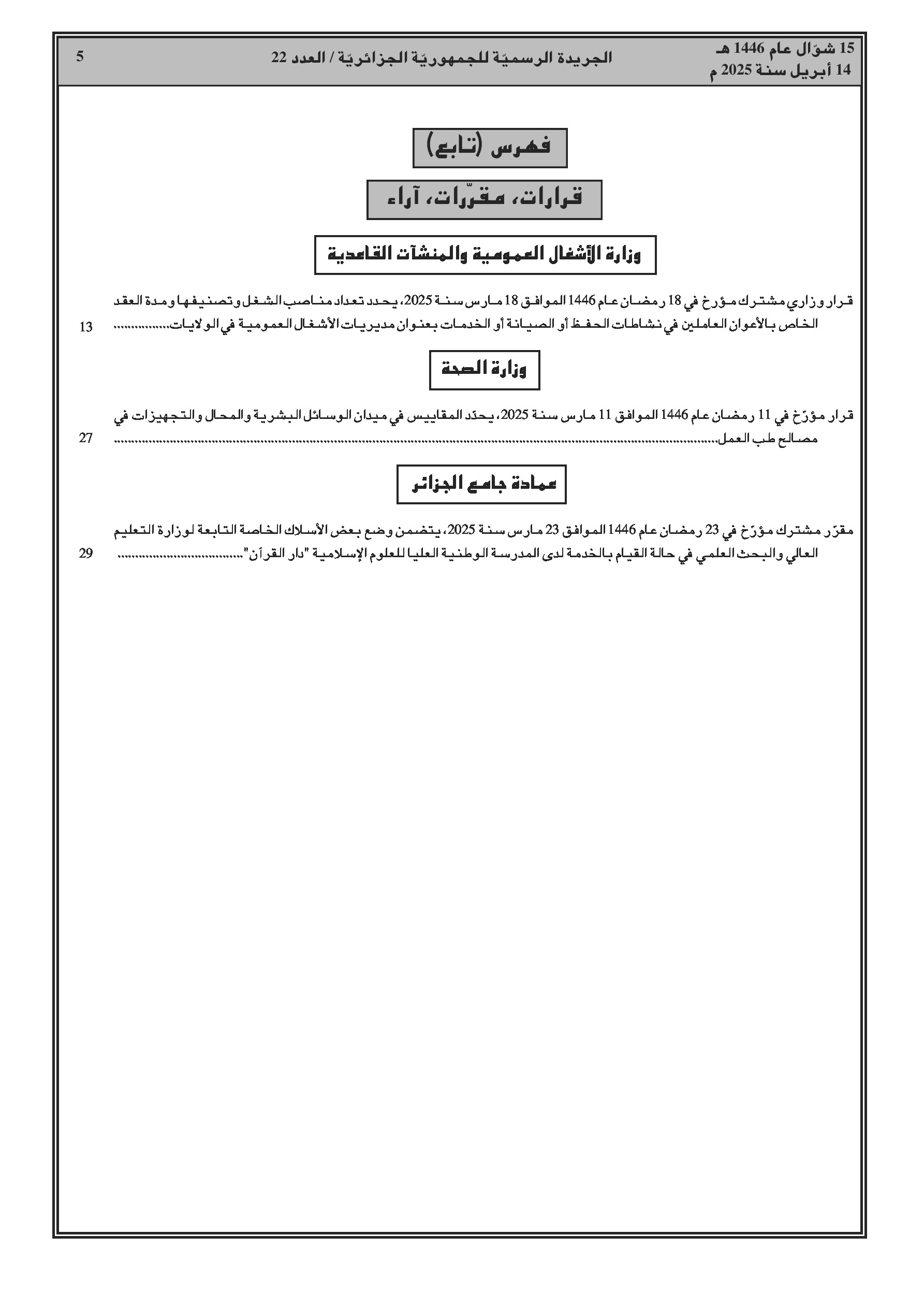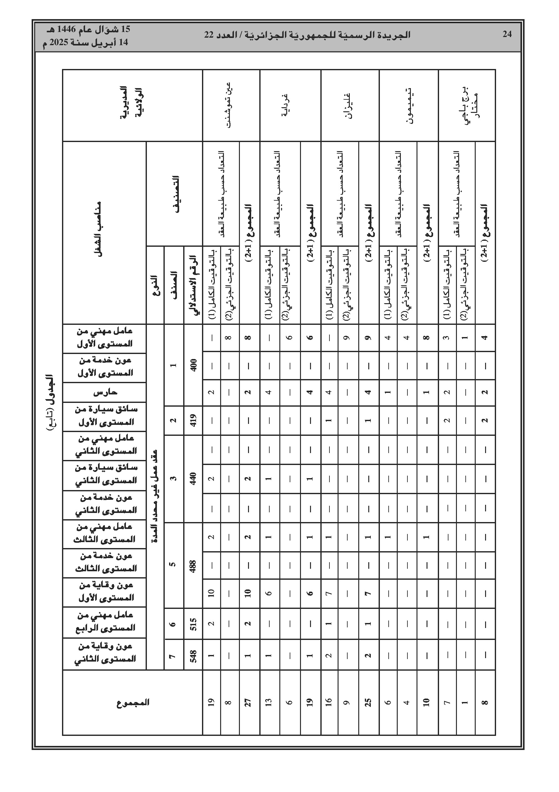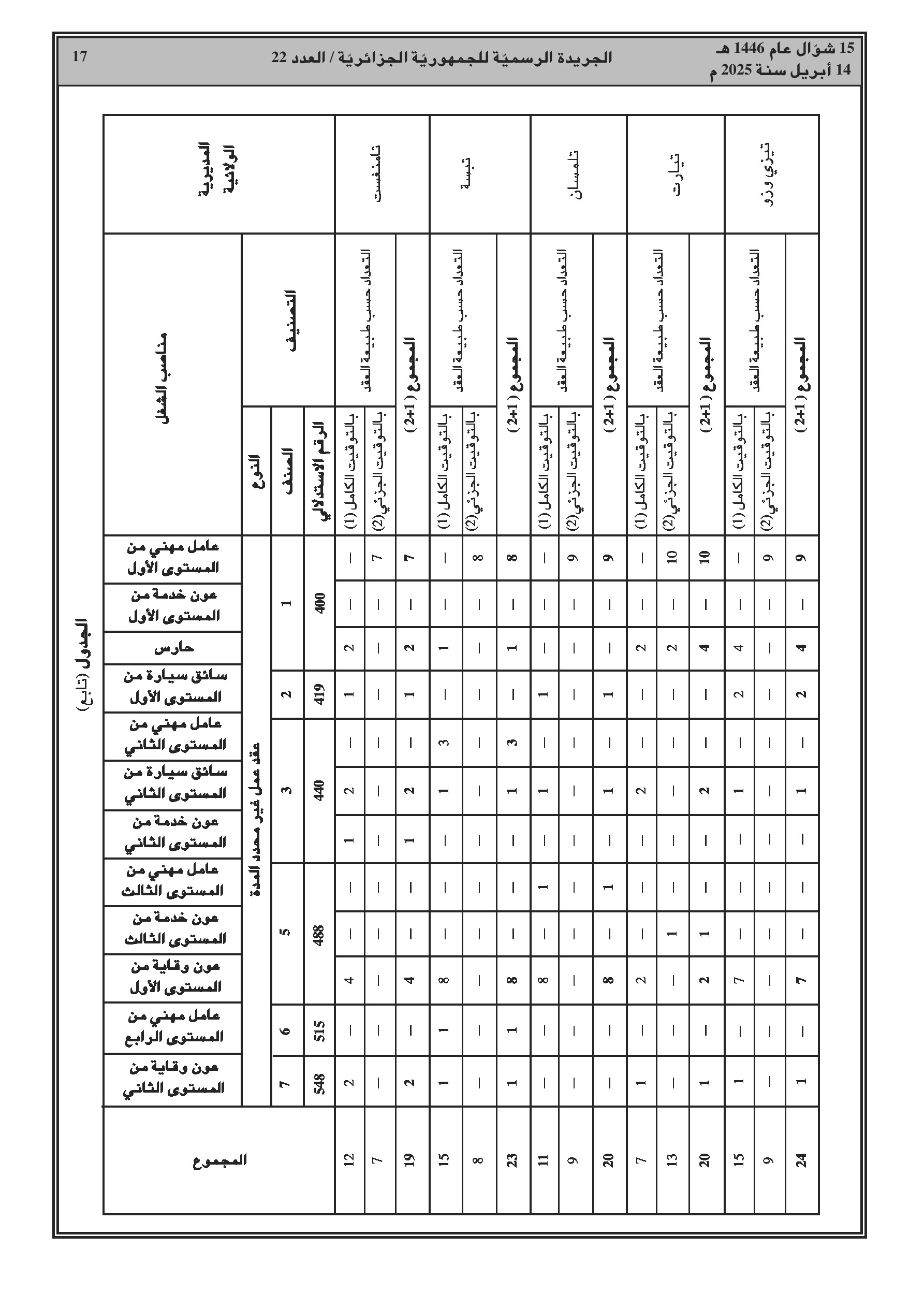 يحدد هذا القرار الوزاري المشترك المؤرخ في 18 مارس 2025، تعدادات الموظفين حسب المنصب، تصنيفهم، ومدة عقود الأعوان الذين يمارسون أنشطة الصيانة، الحفظ أو الخدمة على مستوى مديريات الأشغال العمومية للولايات. يتضمن القرار جداول مفصلة لتوزيع هذه التعدادات حسب طبيعة عقد العمل والفئات والرتب الموافقة لكل منصب.
