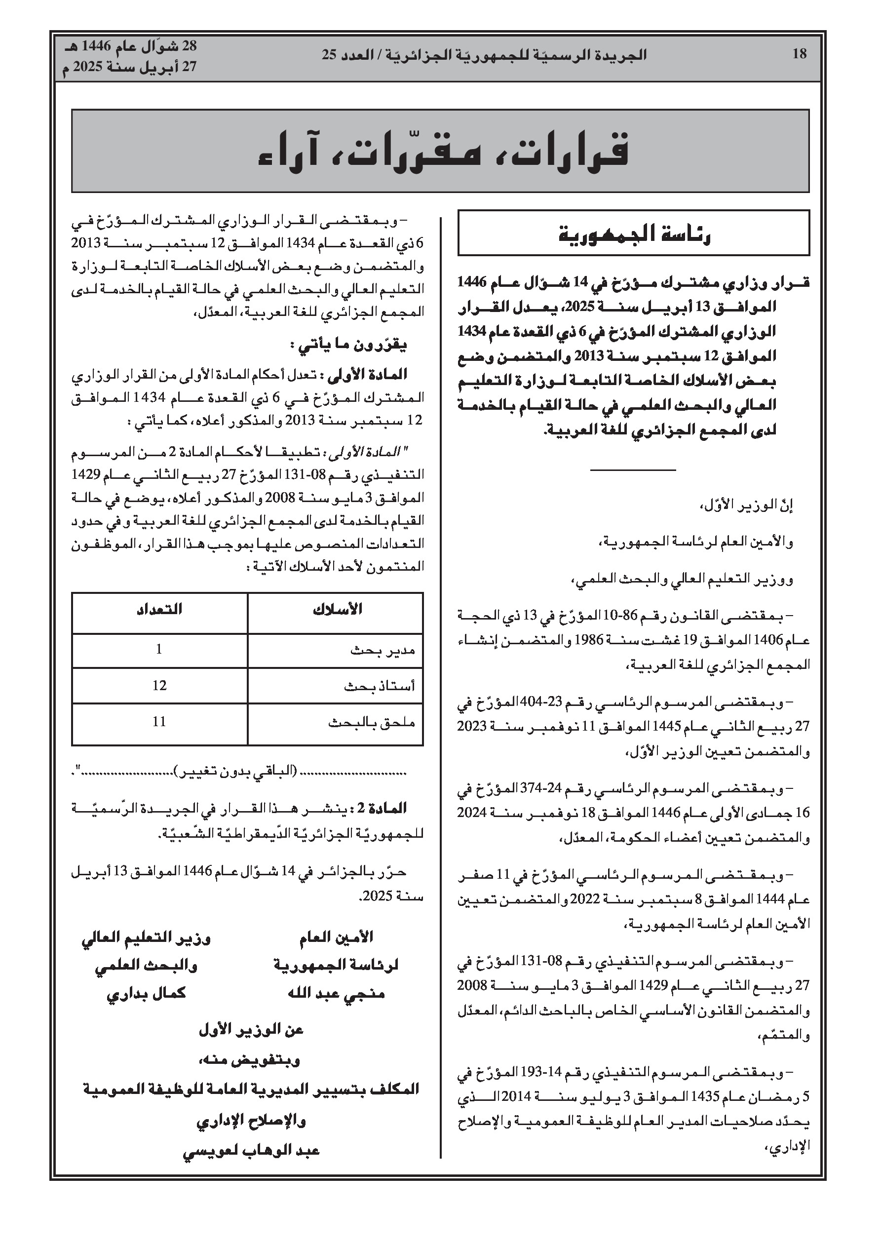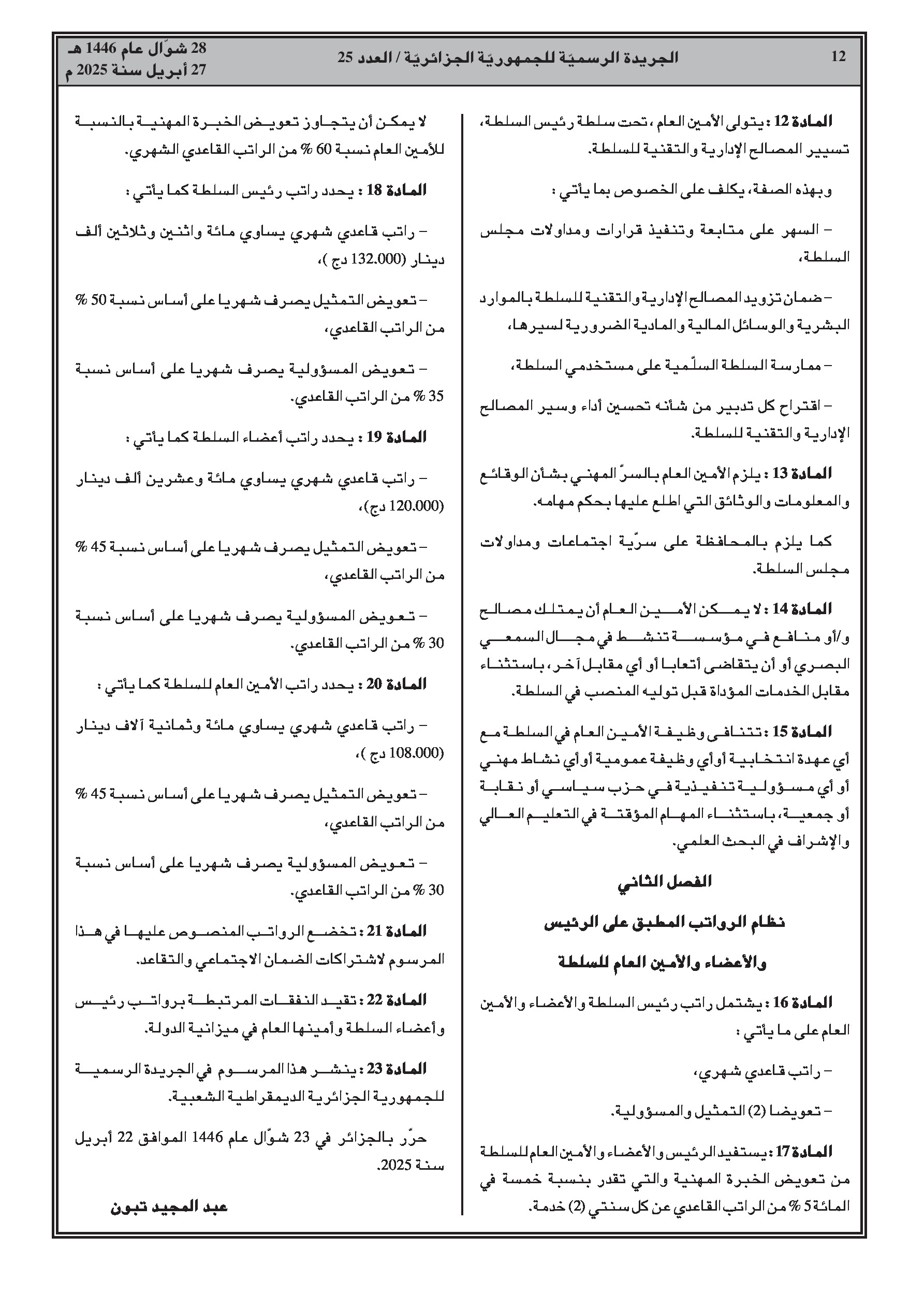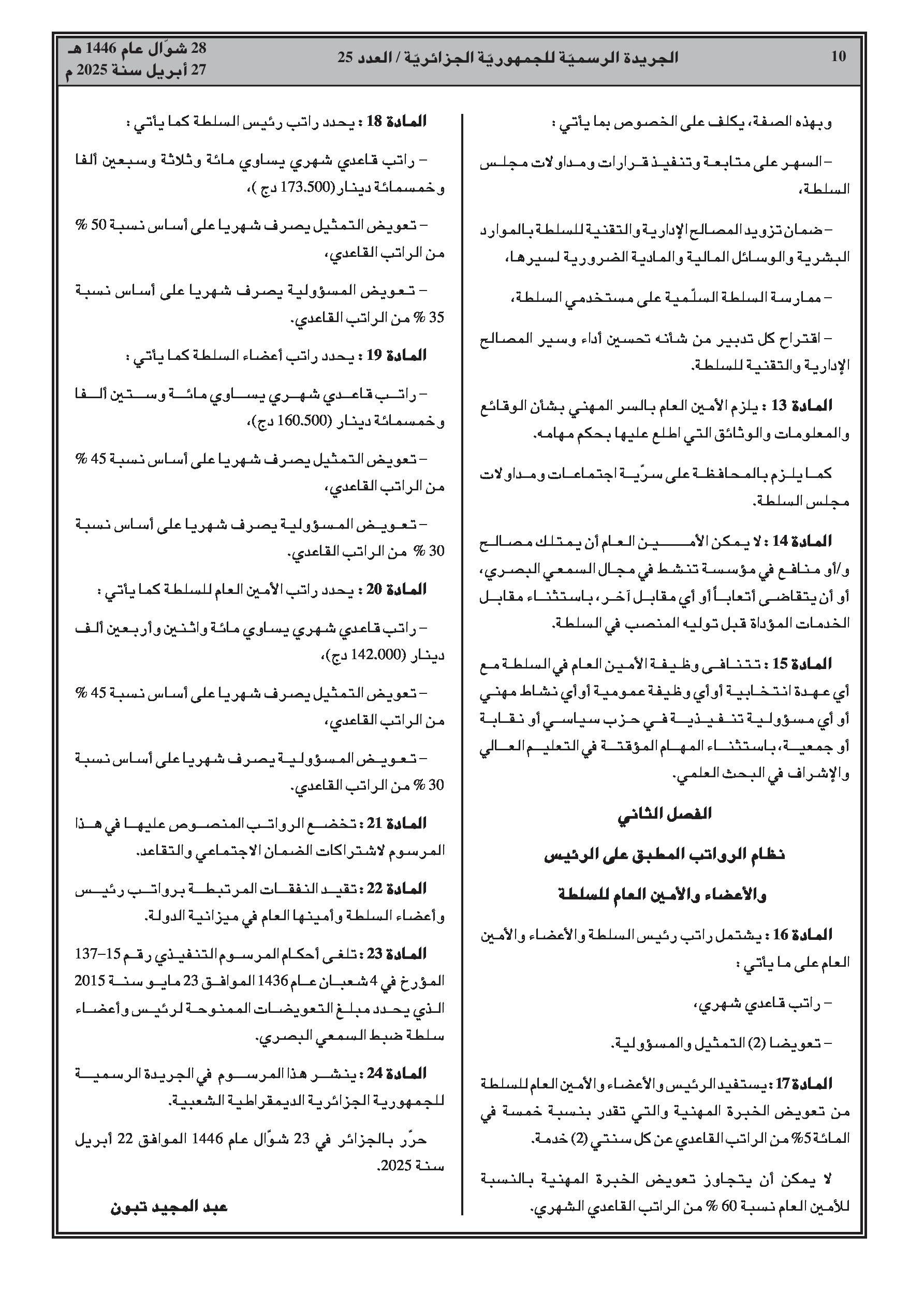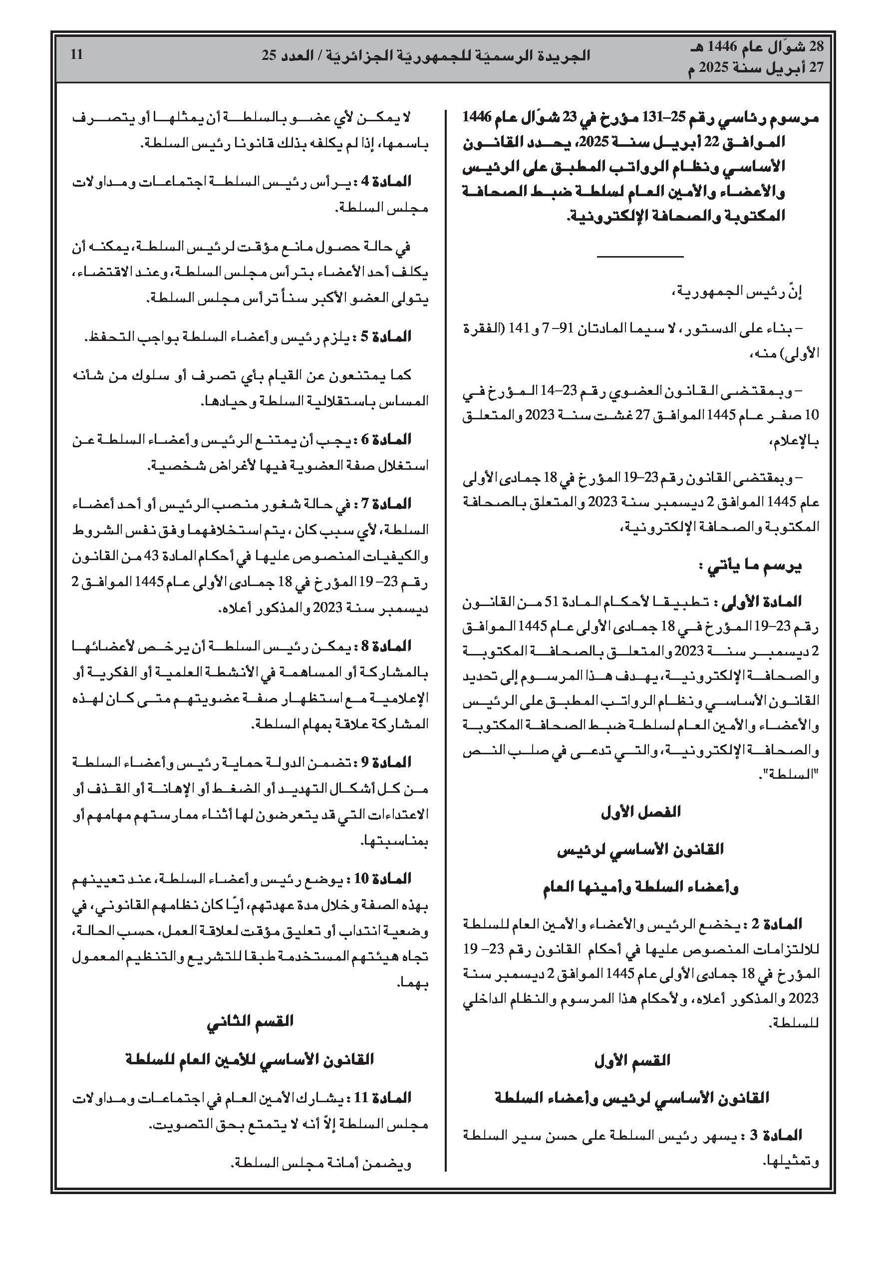 مرسوم رئاسي رقم 25-131: تحديد النظام الأساسي ونمط الأجور لرئيس وأعضاء وأمين عام سلطة ضبط الصحافة المكتوبة والصحافة الإلكترونية.