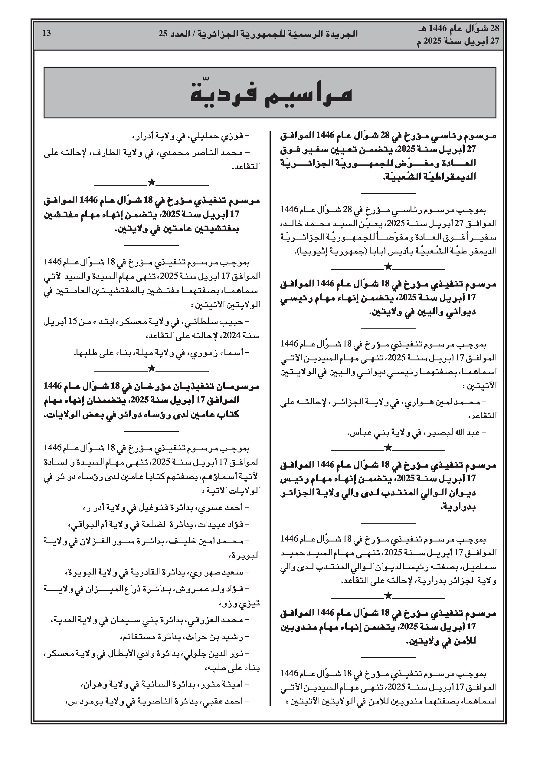 قرارات فردية تتضمن تعيين سفير وإنهاء مهام وتعيينات جديدة في مختلف الإدارات والمؤسسات العمومية.
