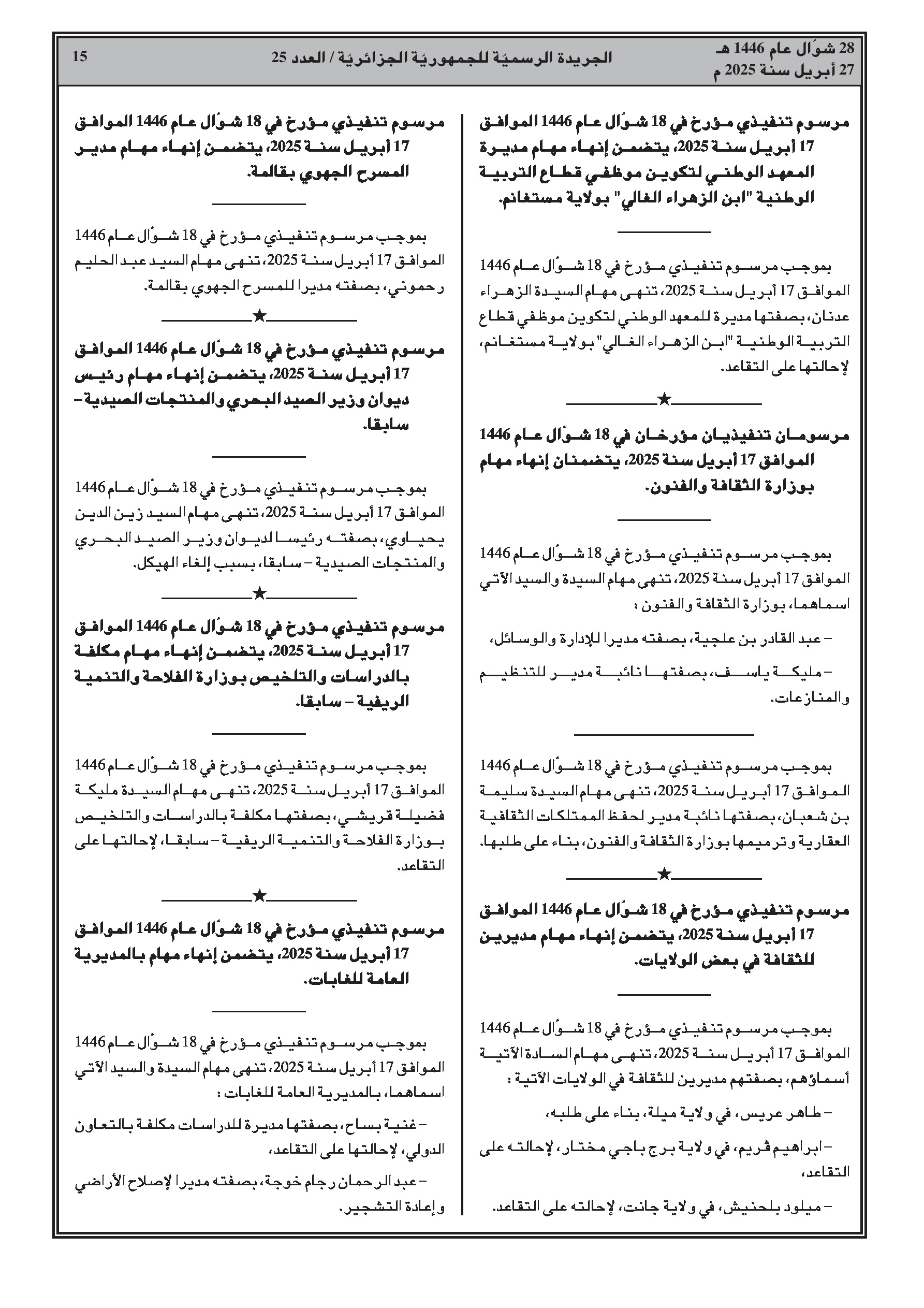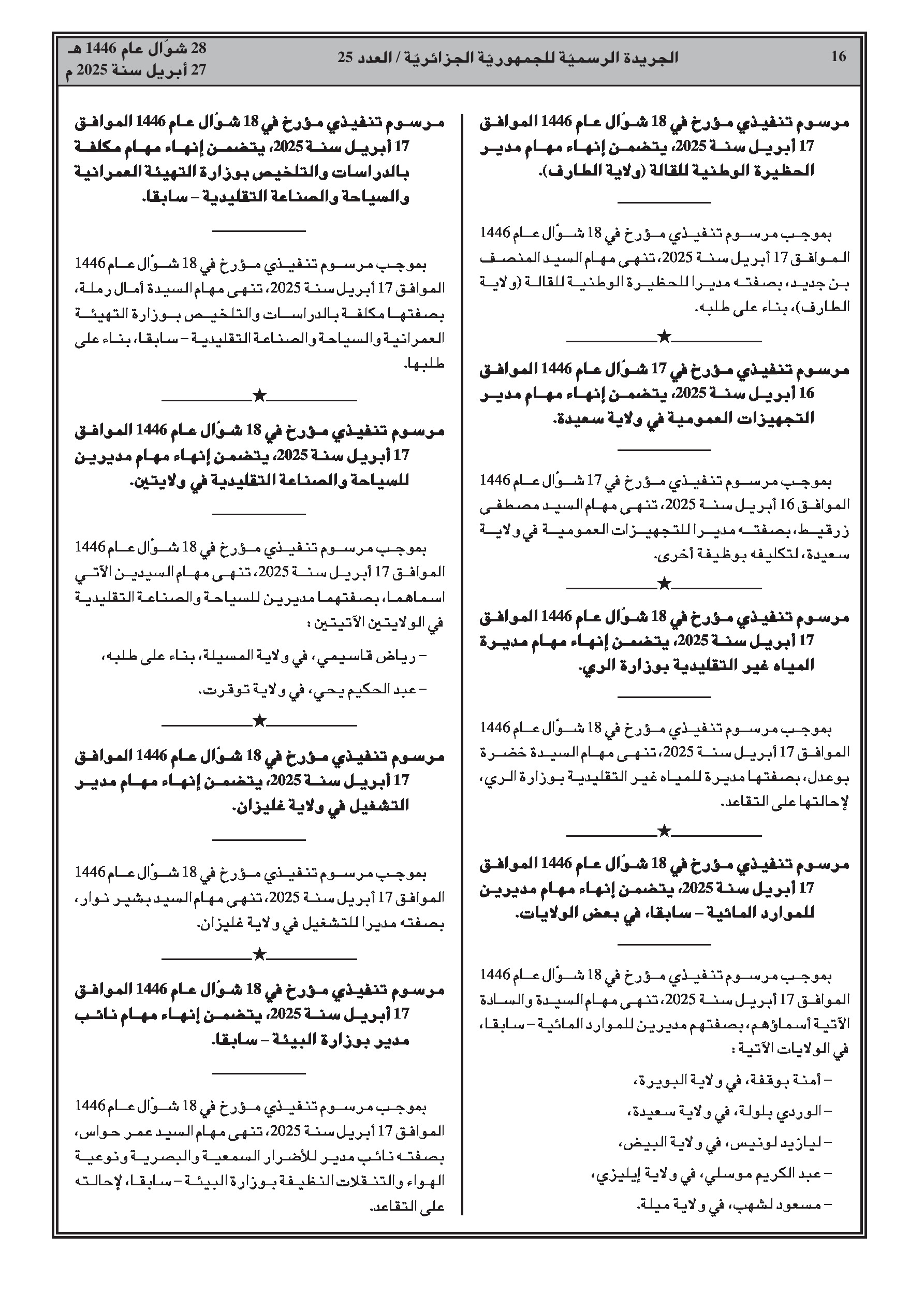 مراسيم تنفيذية: إنهاء مهام رؤساء دواوين ولاة، رئيس ديوان والي منتدب، مندوبين لأمن الولايات، مفتشين عامين للولايات، أمناء عامين لدى رؤساء دوائر، أمناء عامين للبلديات، نواب مديري جامعات، عمداء كليات، مديري تربية، مديرة معهد تكوين موظفي قطاع التربية، موظفين بوزارة الثقافة، مديري ثقافة، مدير مسرح جهوي، رئيس ديوان وزير سابق، مكلفة بالدراسات والتلخيص بوزارة سابقة، موظفين بالمديرية العامة للغابات، مدير حظيرة وطنية، مدير تجهيزات عمومية، مديرة مياه غير تقليدية، مديري موارد مائية سابقين، مكلفة بالدراسات والتلخيص بوزارة سابقة، مديري سياحة، مدير تشغيل، مدير فرعي بوزارة سابقة، مديرة بيئة.