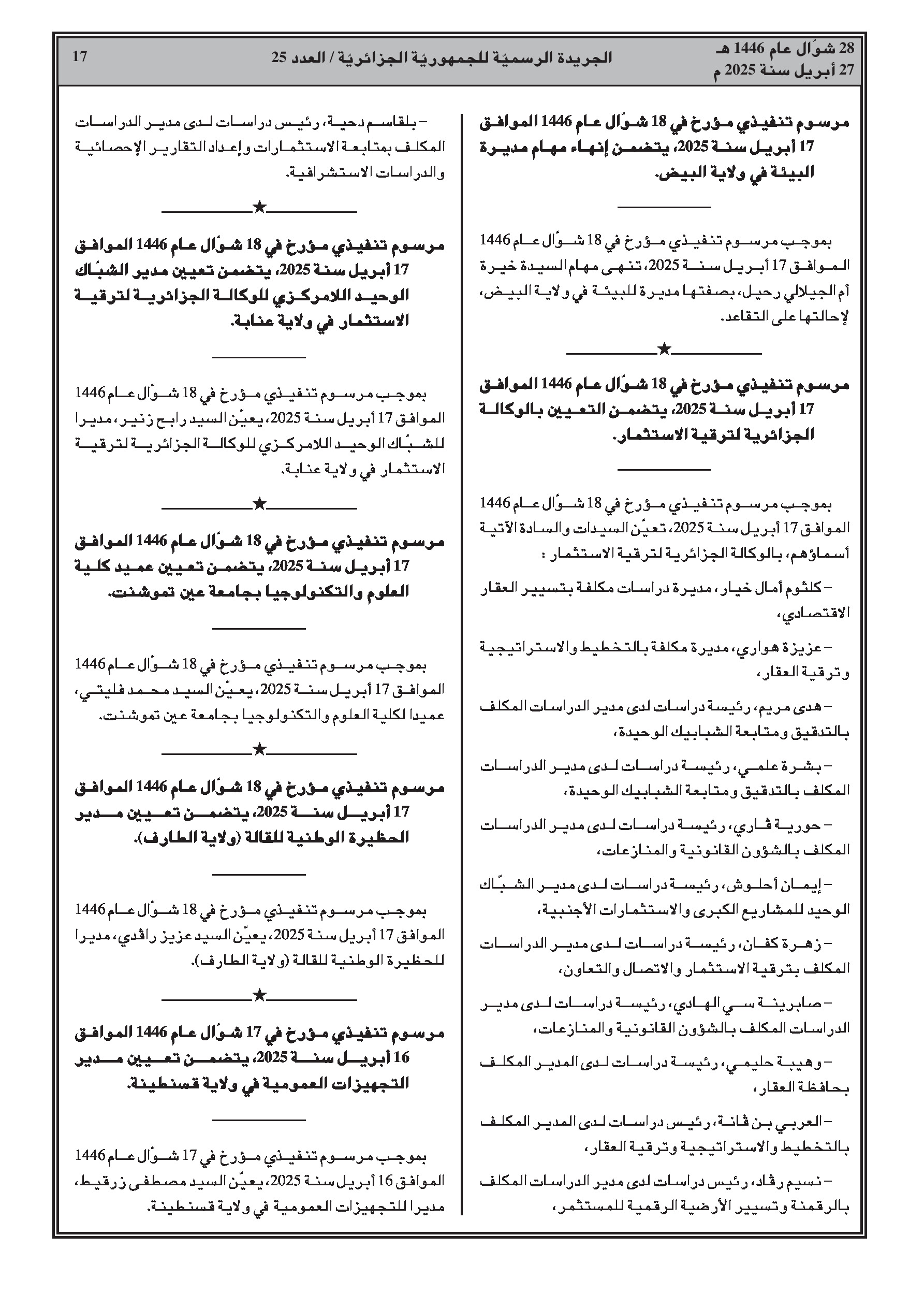 مراسيم تنفيذية: تعيينات بالوكالة الجزائرية لترقية الاستثمار، مدير شباك وحيد لامركزي، عميد كلية، مدير حظيرة وطنية، مدير تجهيزات عمومية.