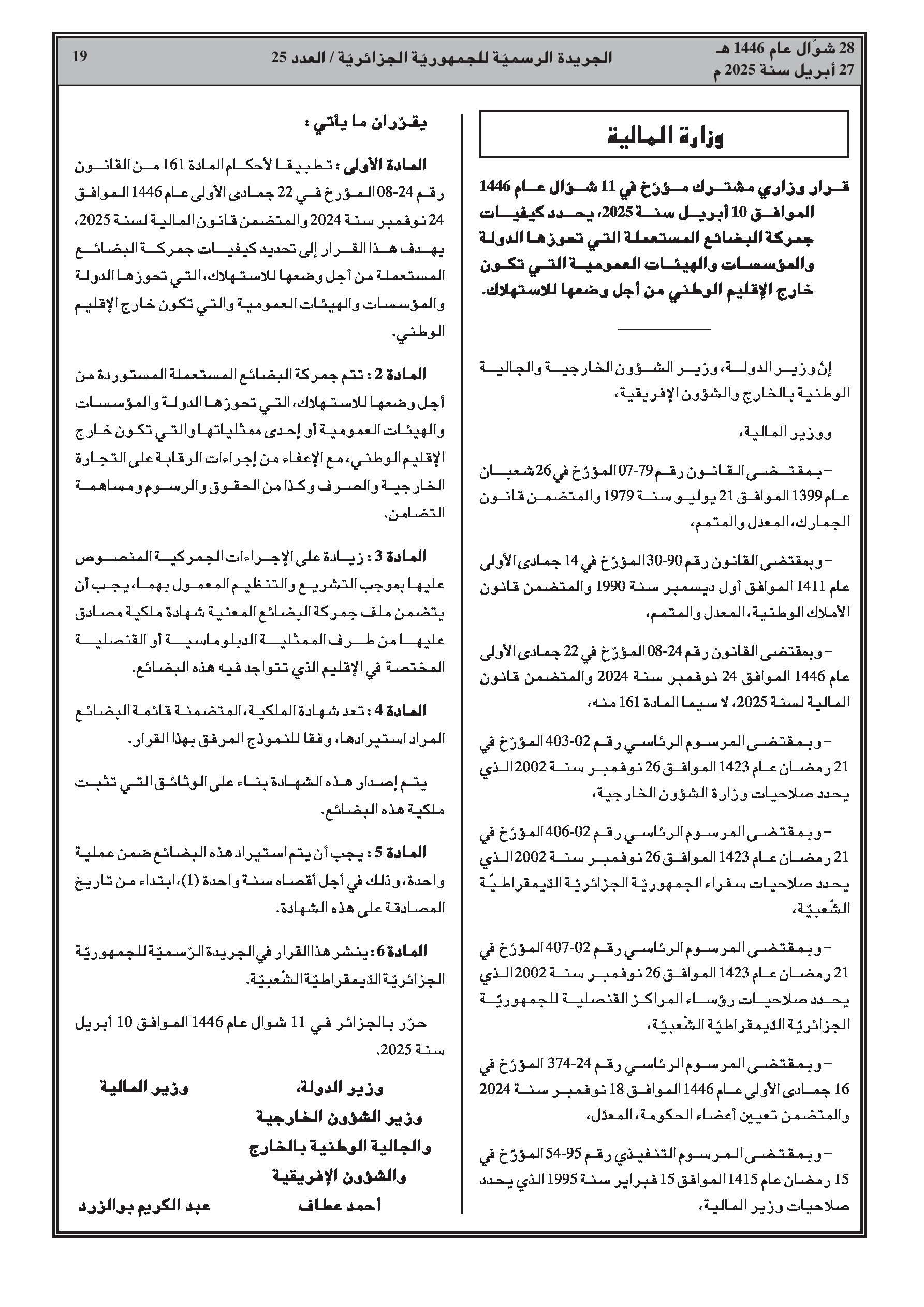 وزارة المالية: قرار وزاري مشترك يحدد كيفيات جمركة السلع المستعملة التابعة للدولة والمؤسسات والهيئات العمومية الموجودة خارج التراب الوطني.