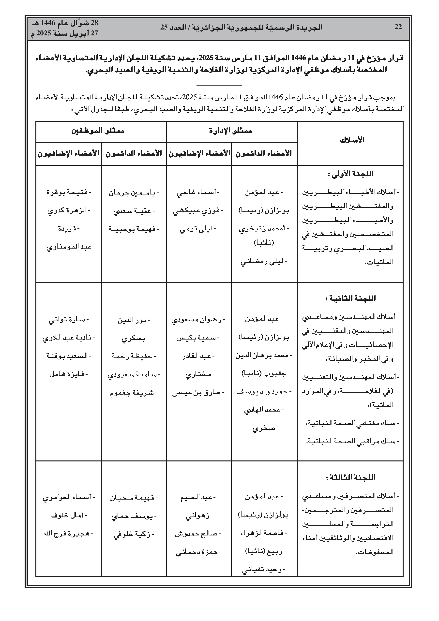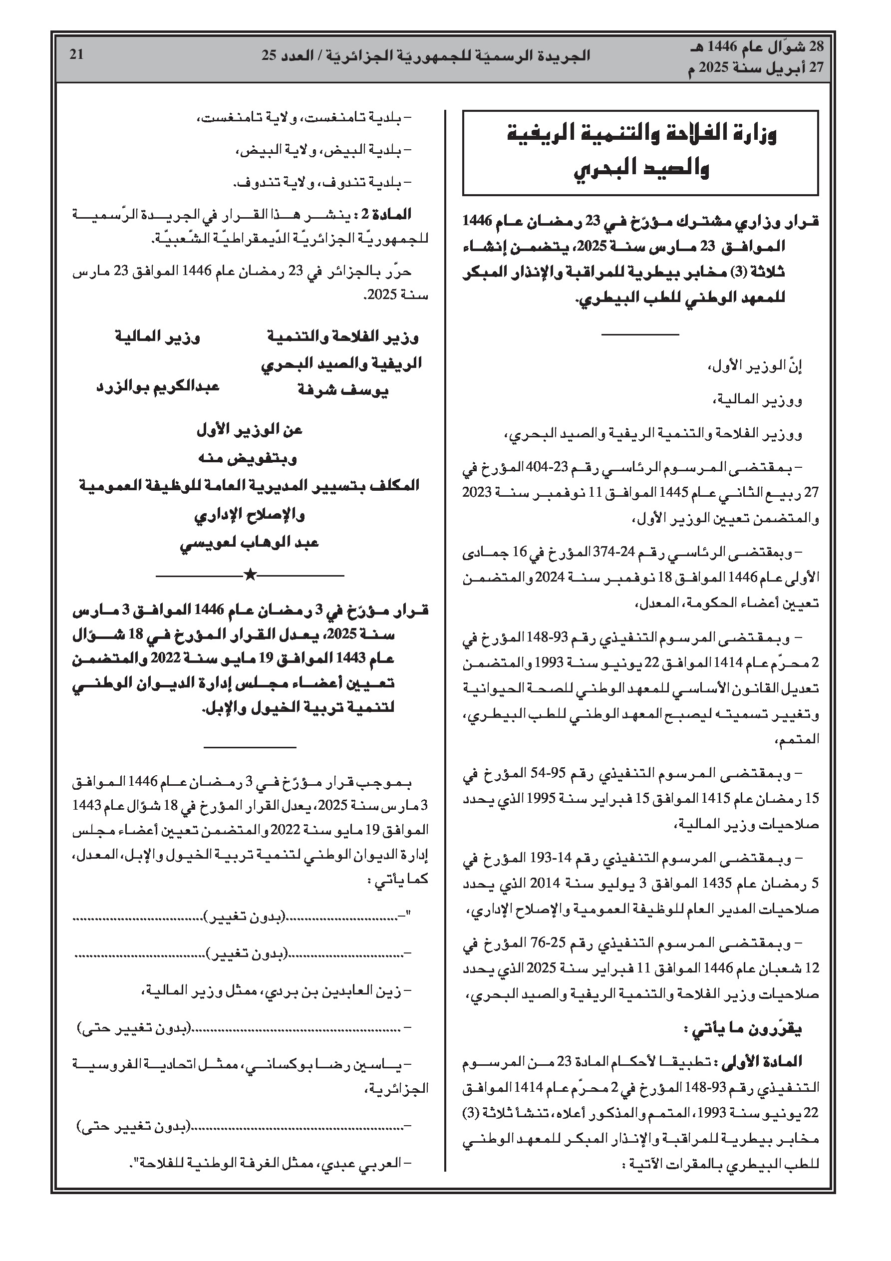 وزارة الفلاحة والتنمية الريفية والصيد البحري: قرار وزاري مشترك يتضمن إنشاء ثلاثة مخابر بيطرية للمراقبة والإنذار المبكر تابعة للمعهد الوطني للطب البيطري. قرار يعدل قائمة أعضاء مجلس إدارة الديوان الوطني لتنمية تربية الخيول والإبل. قرار يحدد تشكيل اللجان الإدارية المتساوية الأعضاء المختصة تجاه أسلاك موظفي الإدارة المركزية. قرار يتضمن تفويض التوقيع للمديرة العامة للاستثمار والعقار الفلاحي.