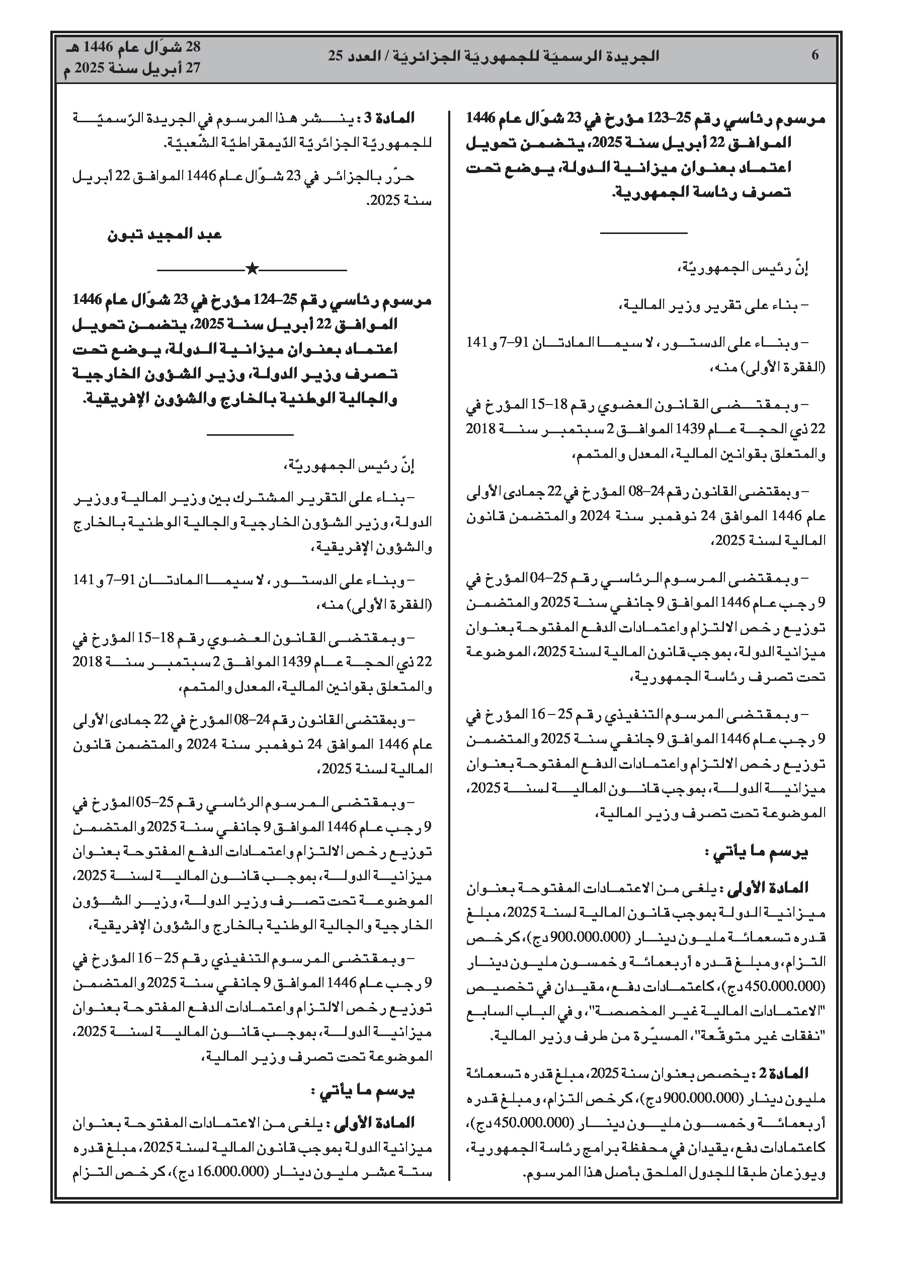مرسوم رئاسي رقم 25-123: تحويل اعتمادات لميزانية الدولة (رئاسة الجمهورية).