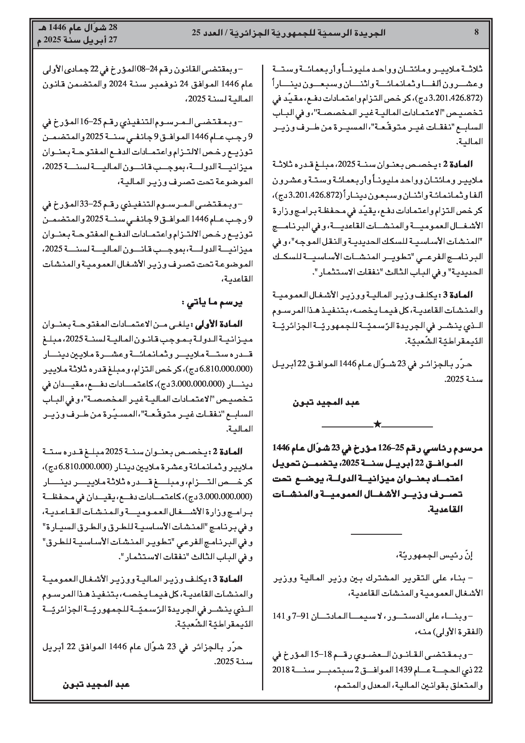 مرسوم رئاسي رقم 25-126: تحويل اعتمادات لميزانية الدولة (وزارة الأشغال العمومية والمنشآت القاعدية).