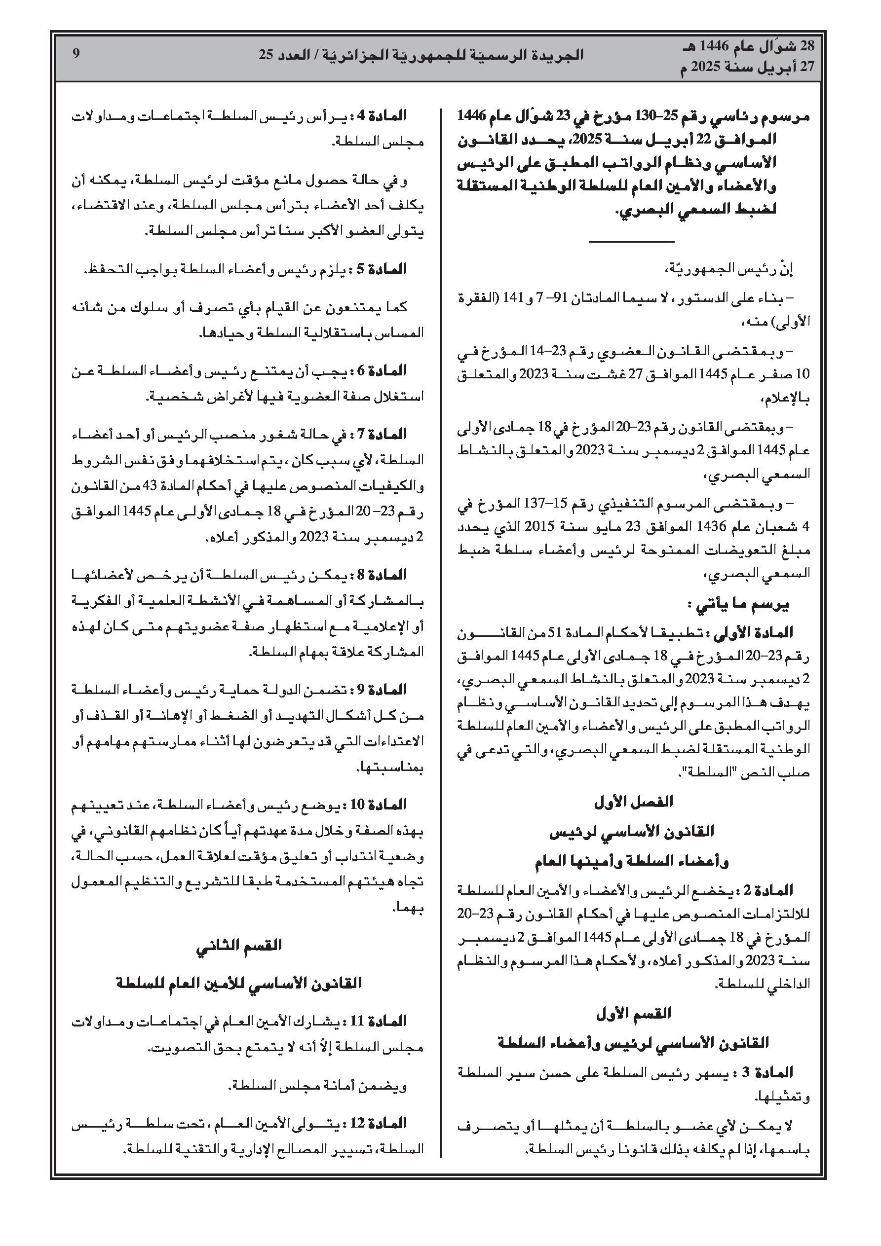 مرسوم رئاسي رقم 25-130: تحديد النظام الأساسي ونمط الأجور لرئيس وأعضاء وأمين عام السلطة الوطنية المستقلة لضبط السمعي البصري.