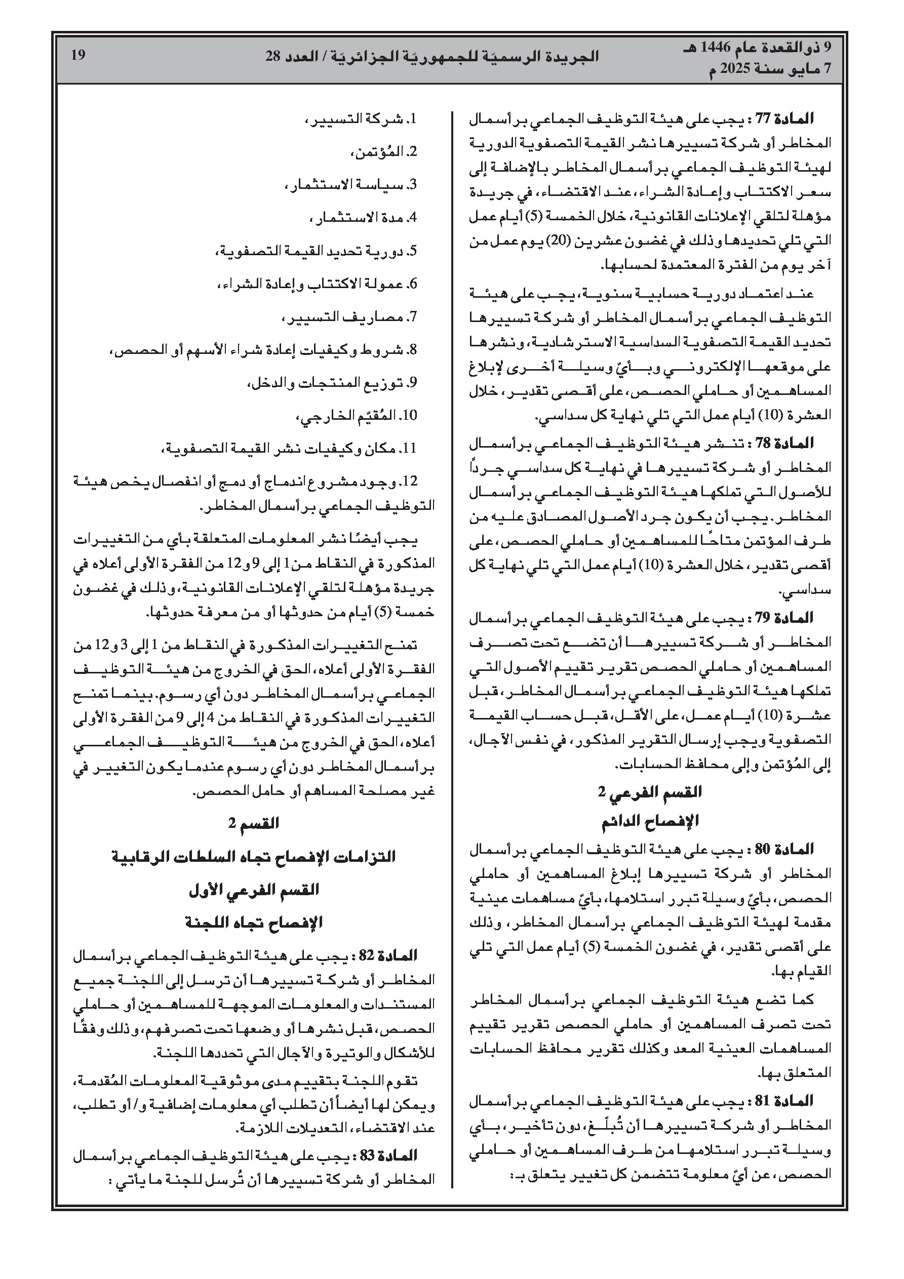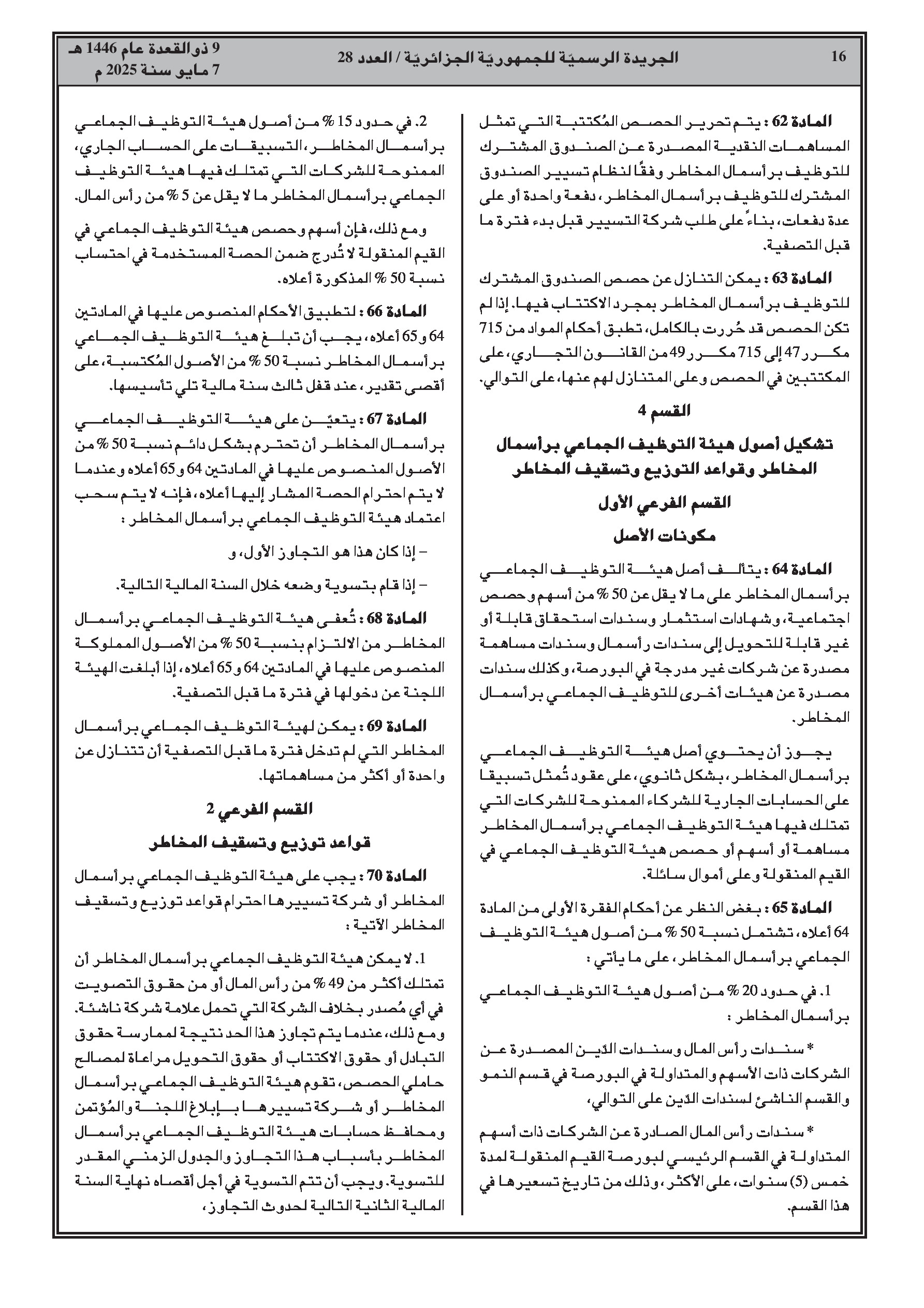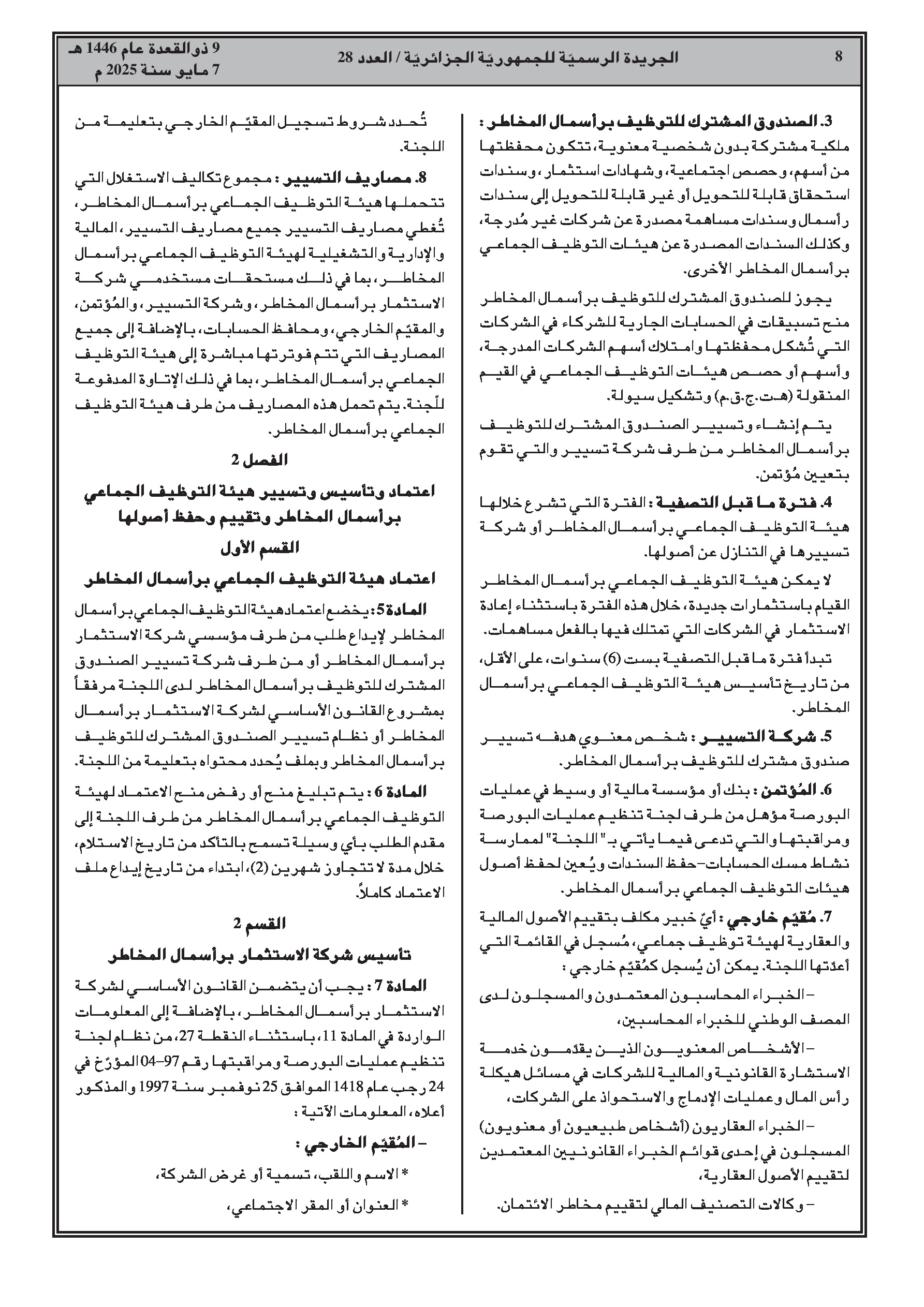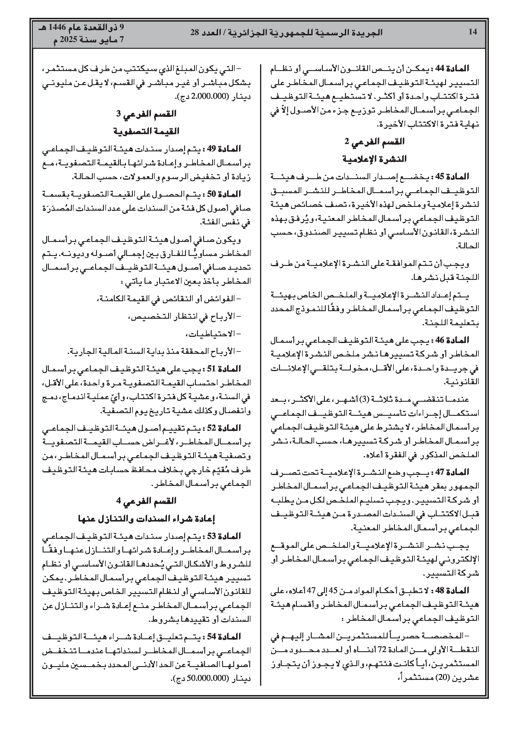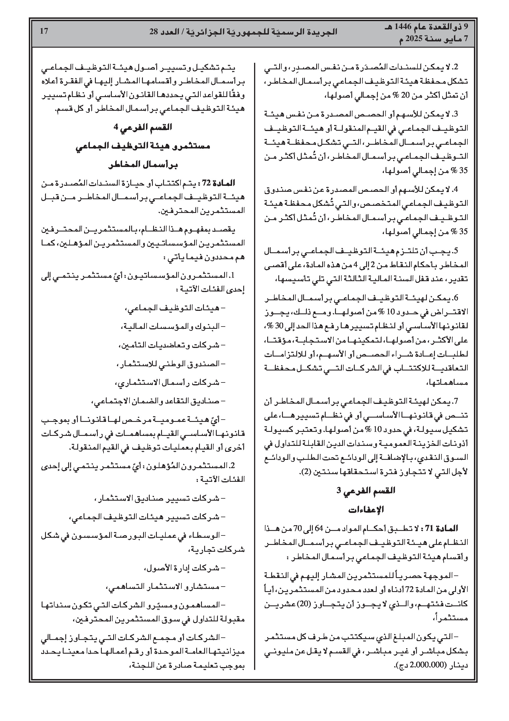 - الحد الأدنى لرأس مال SICAR وصافي أصول FCPR هو 50 مليون دينار جزائري.