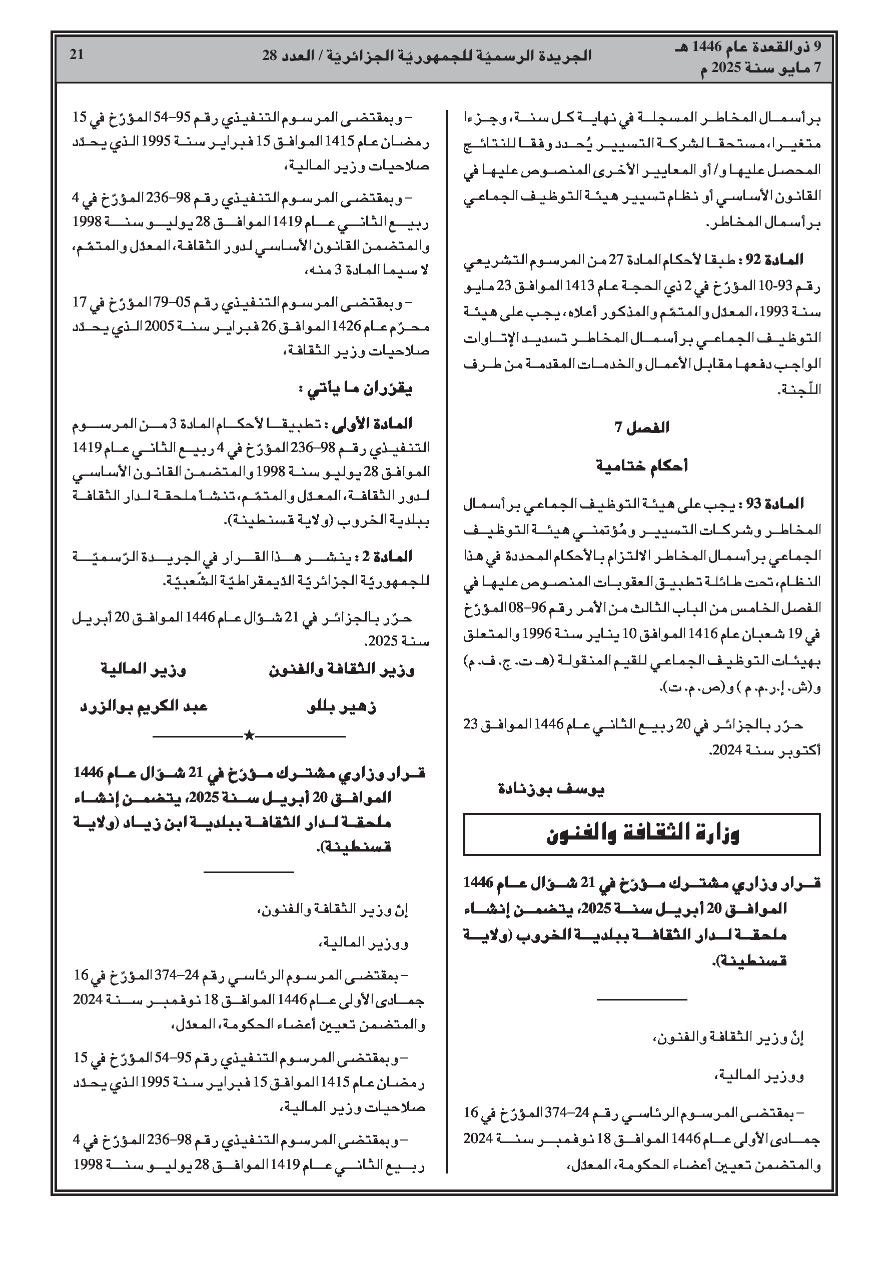 قرار وزاري مشترك يقضي بإنشاء ملحقة لدار الثقافة ببلدية ابن زياد بولاية قسنطينة.