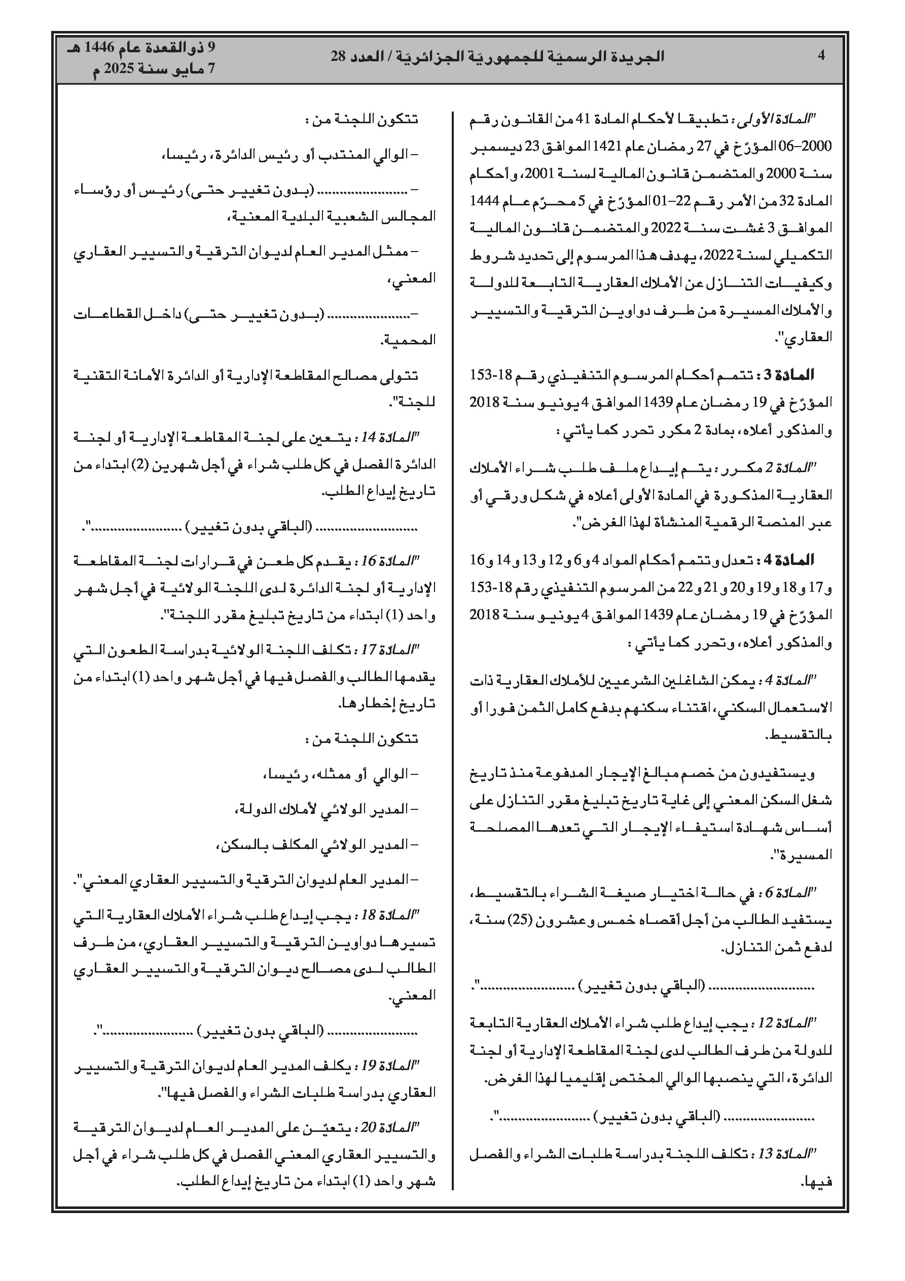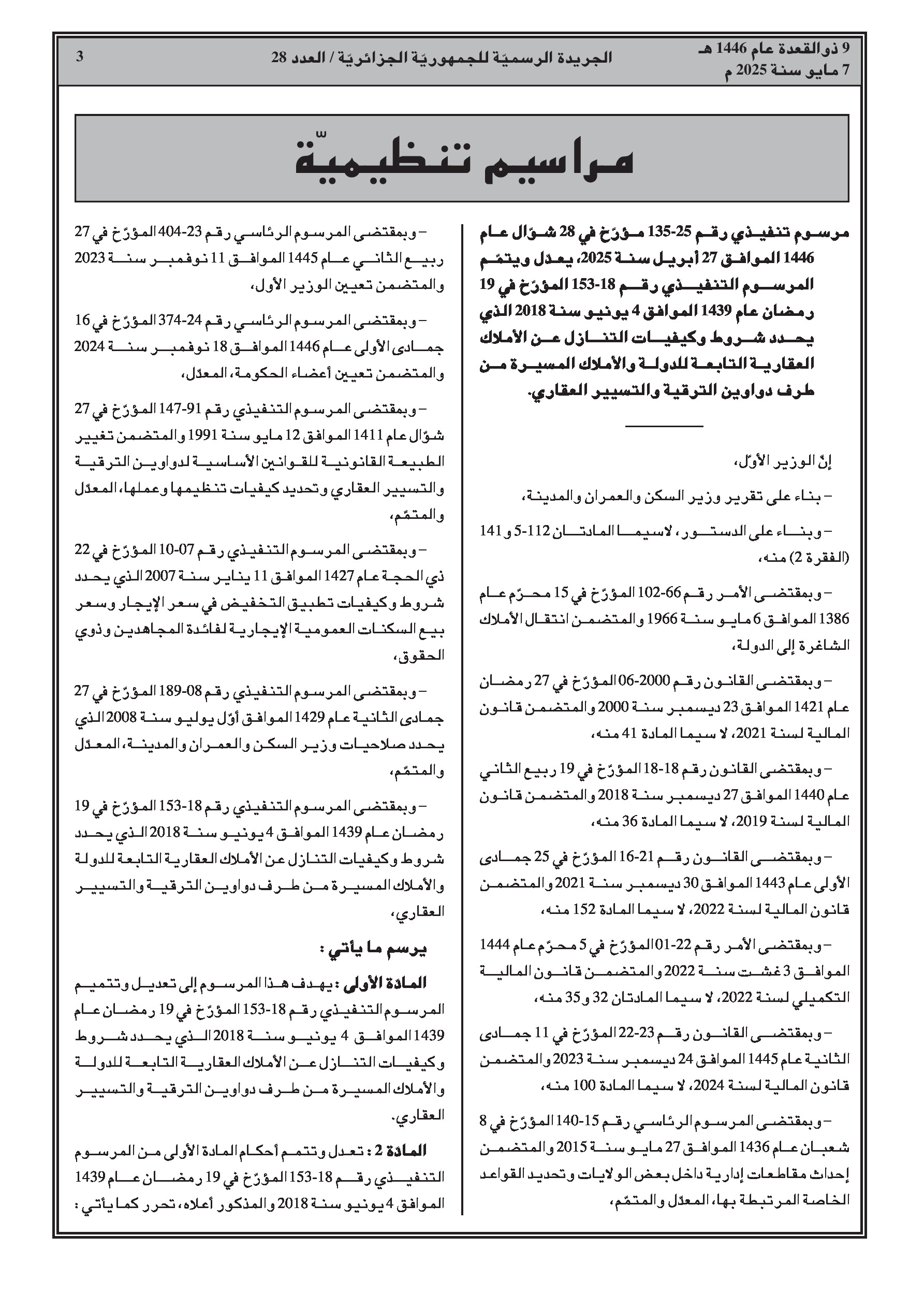 مرسوم يعدل ويكمل شروط وإجراءات التنازل عن العقارات التابعة للدولة وتلك التي تديرها دواوين الترقية والتسيير العقاري، مع إدخال إمكانية الإيداع الرقمي للطلبات وتمديد آجال الدفع بالتقسيط.