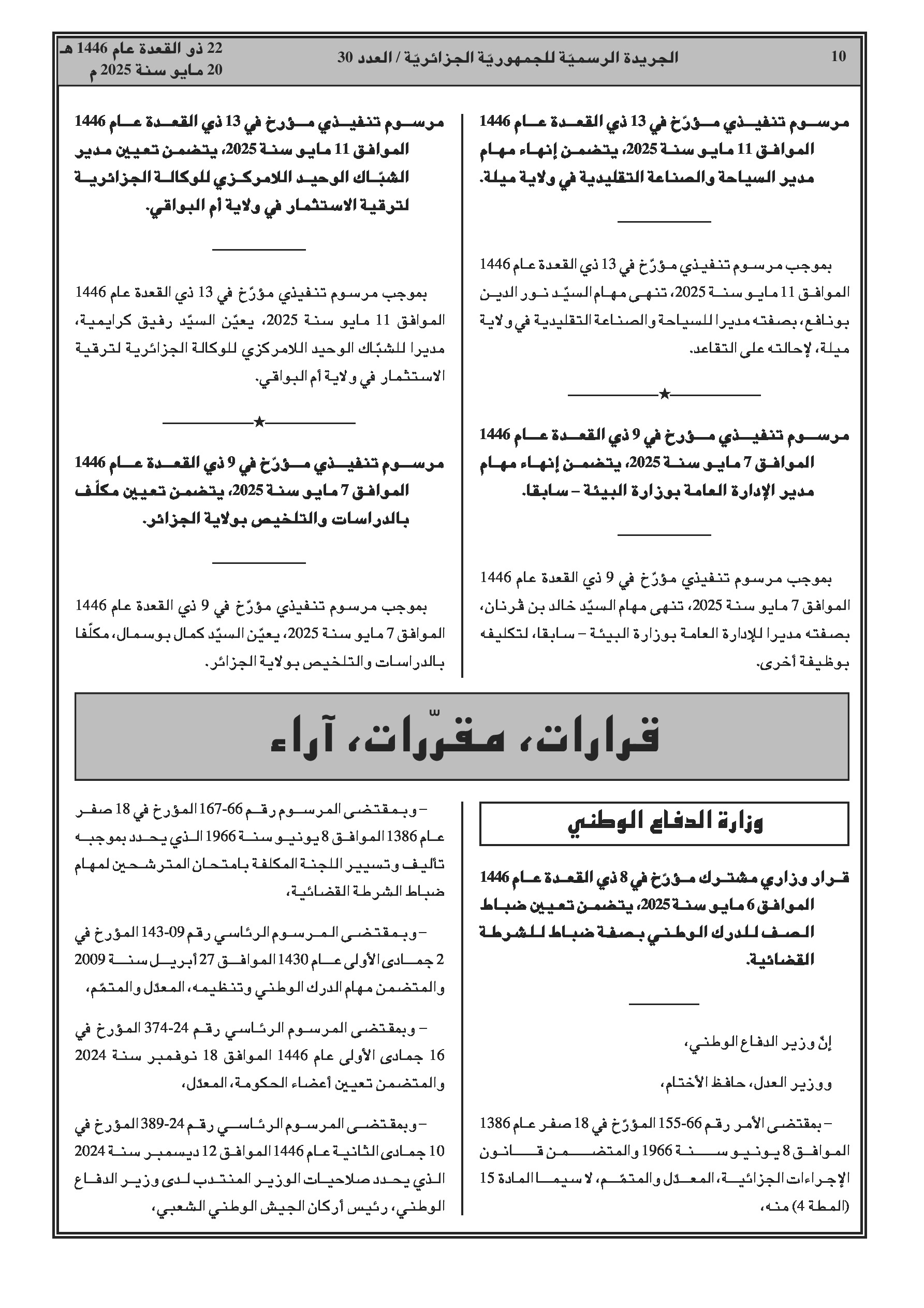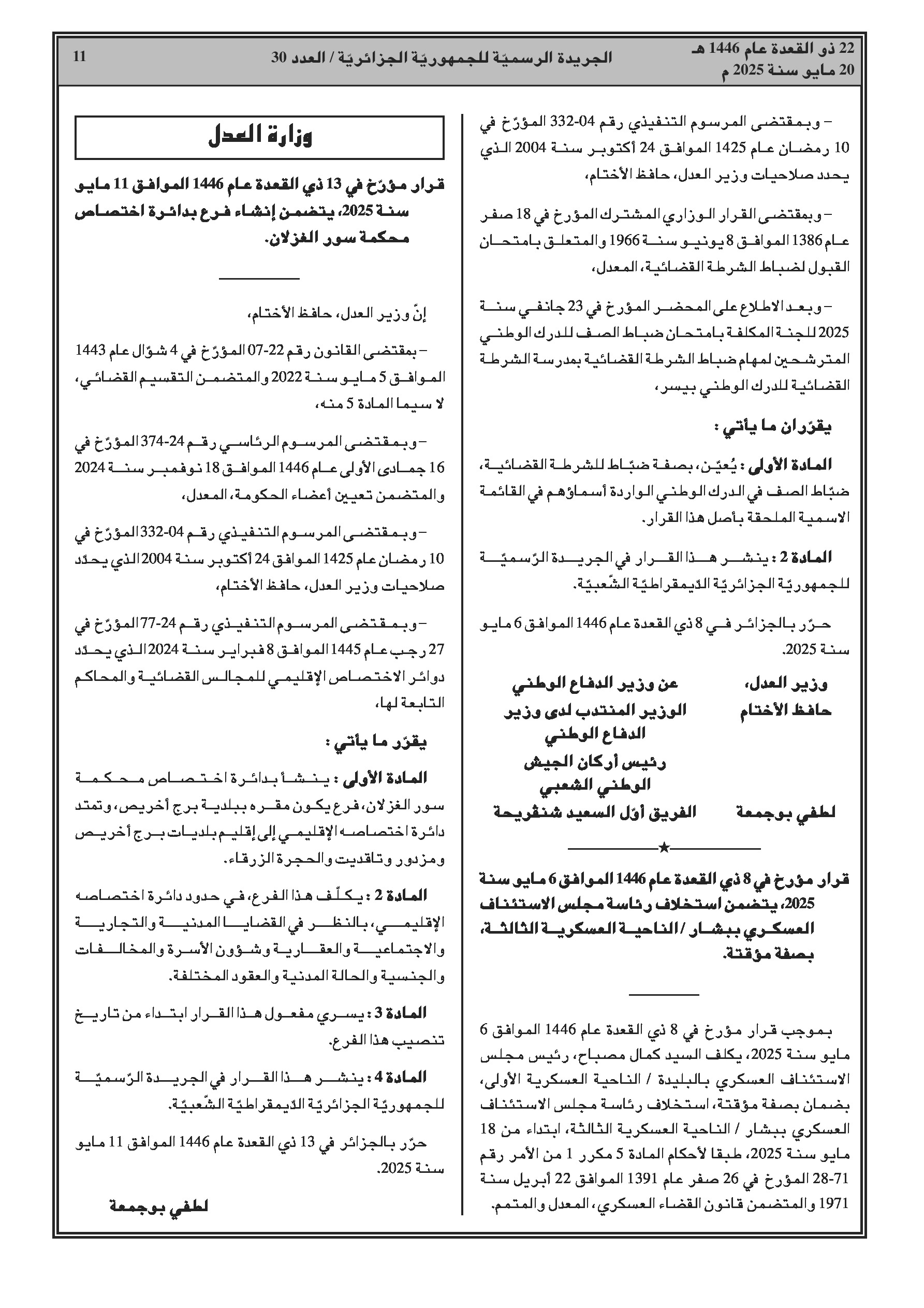 - الدفاع: تعيين ضباط صف من الدرك الوطني كضباط شرطة قضائية، وتكليف مؤقت برئاسة محكمة الاستئناف العسكرية ببشار.