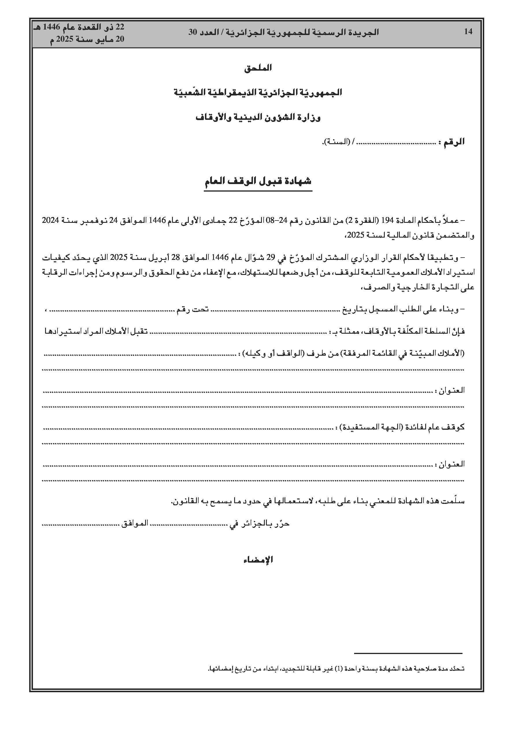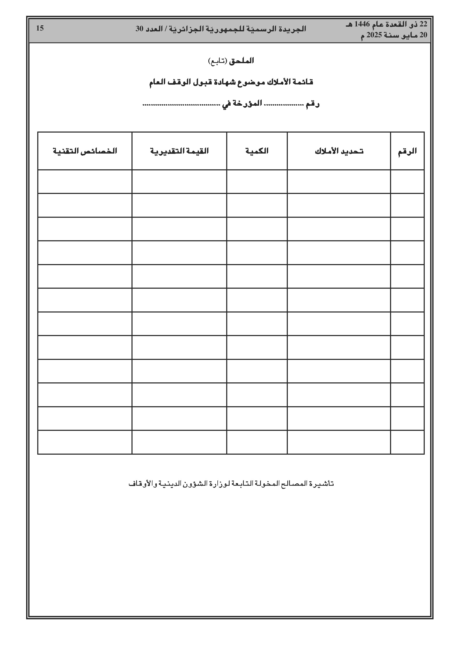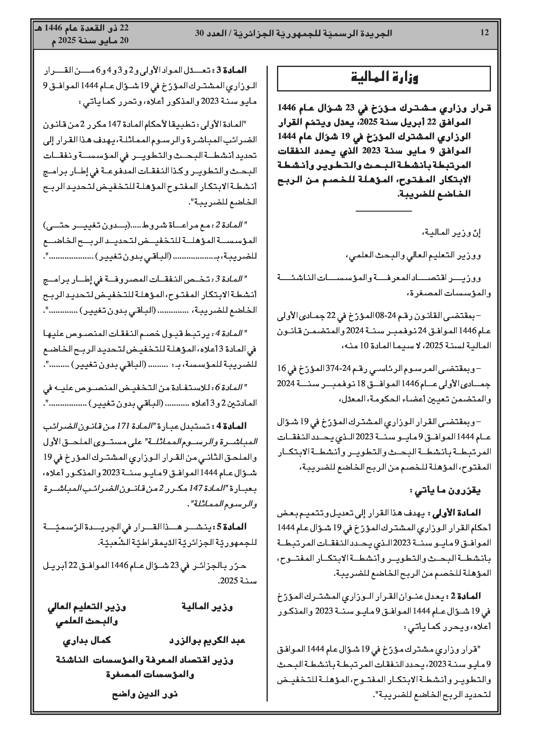- المالية: تعديل قرار تحديد نفقات البحث والتطوير والابتكار المؤهلة للخصم الضريبي؛ تحديد كيفيات استيراد أموال الوقف العمومي مع الإعفاء من الحقوق والرسوم.