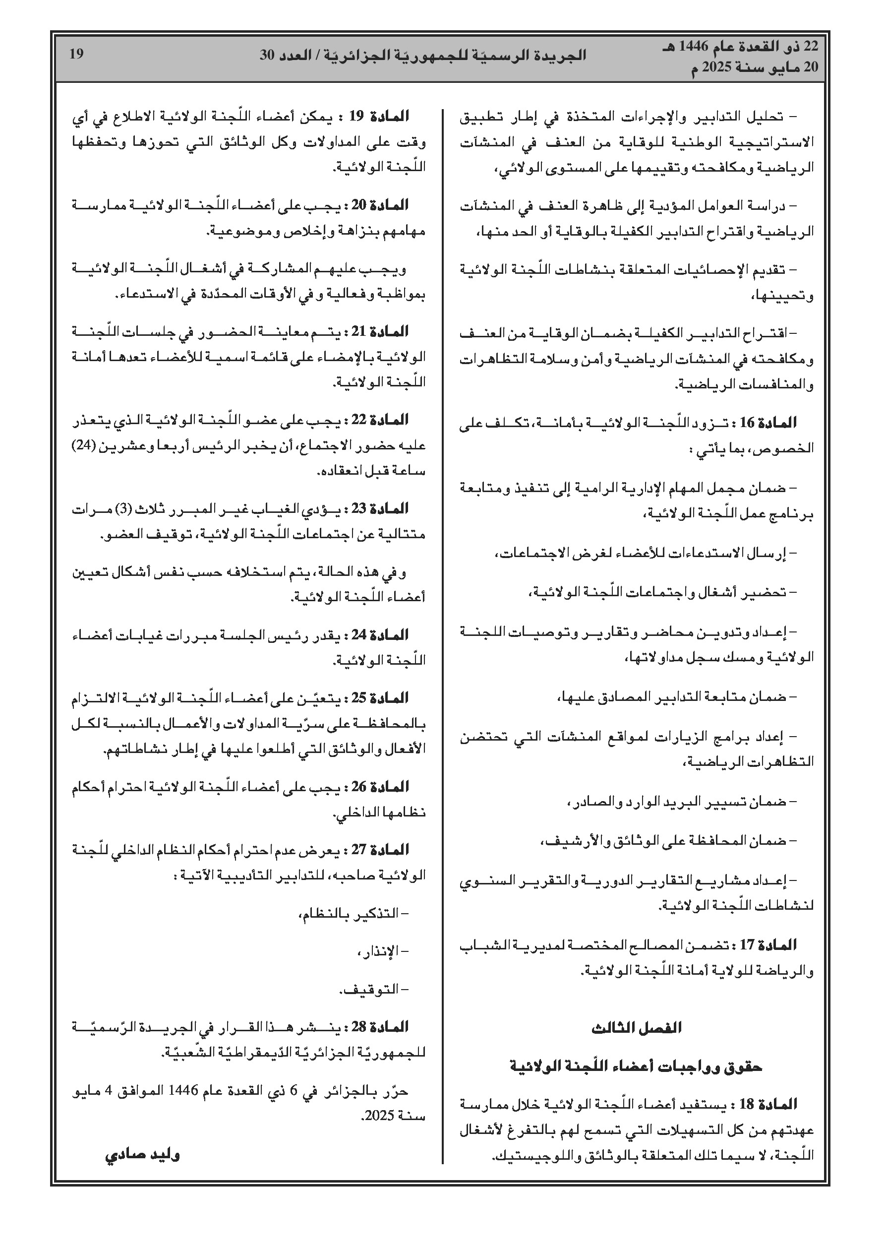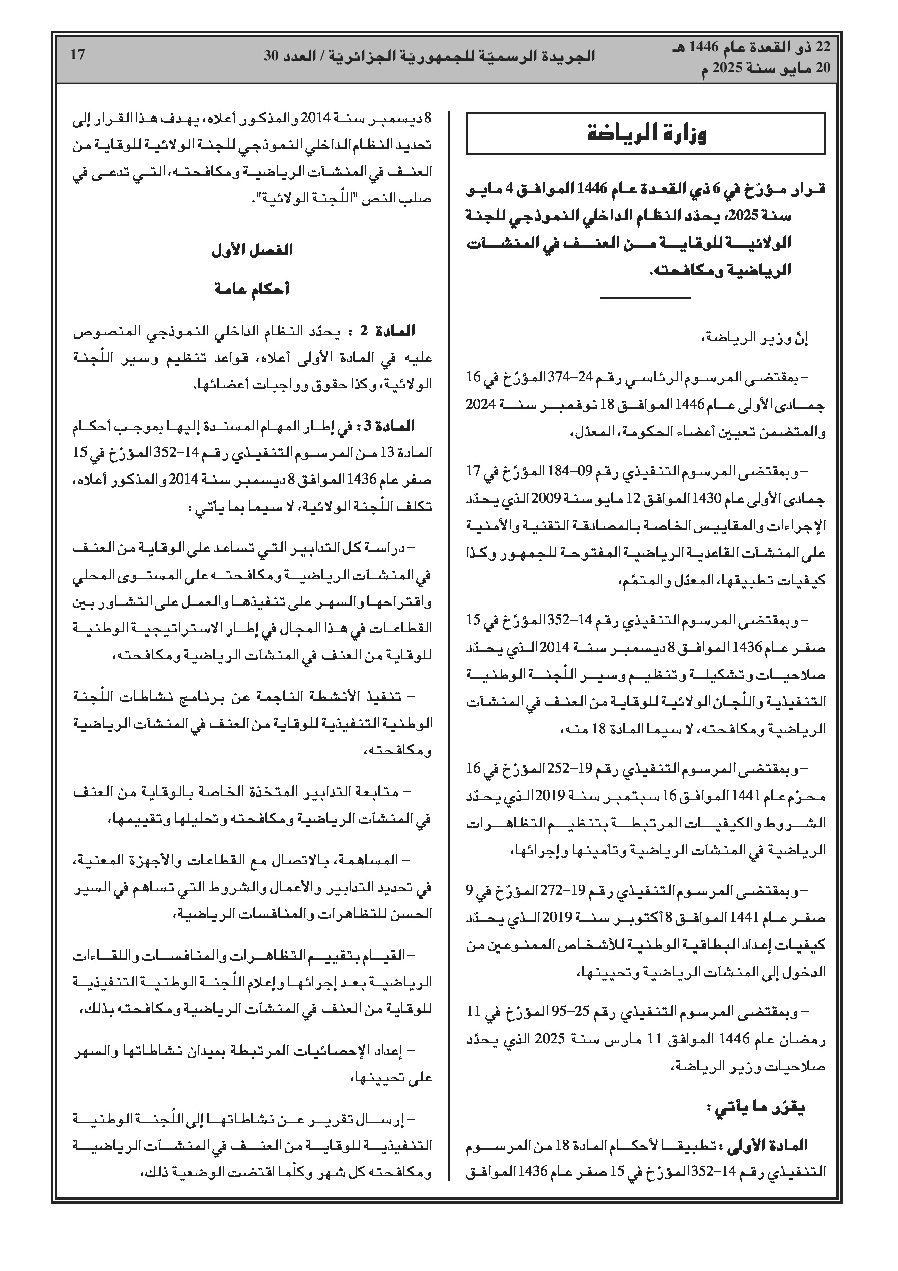 - الرياضة: تحديد النظام الداخلي النموذجي للجنة الولائية للوقاية من العنف في المنشآت الرياضية.