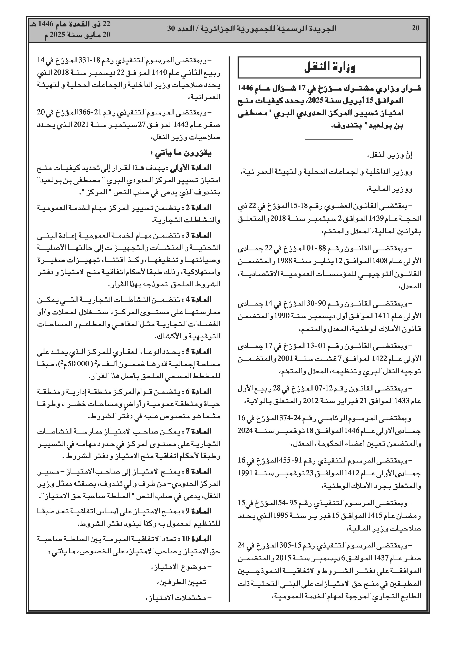 - النقل: تحديد كيفيات امتياز تسيير المعبر الحدودي البري "مصطفى بن بولعيد" بتندوف.