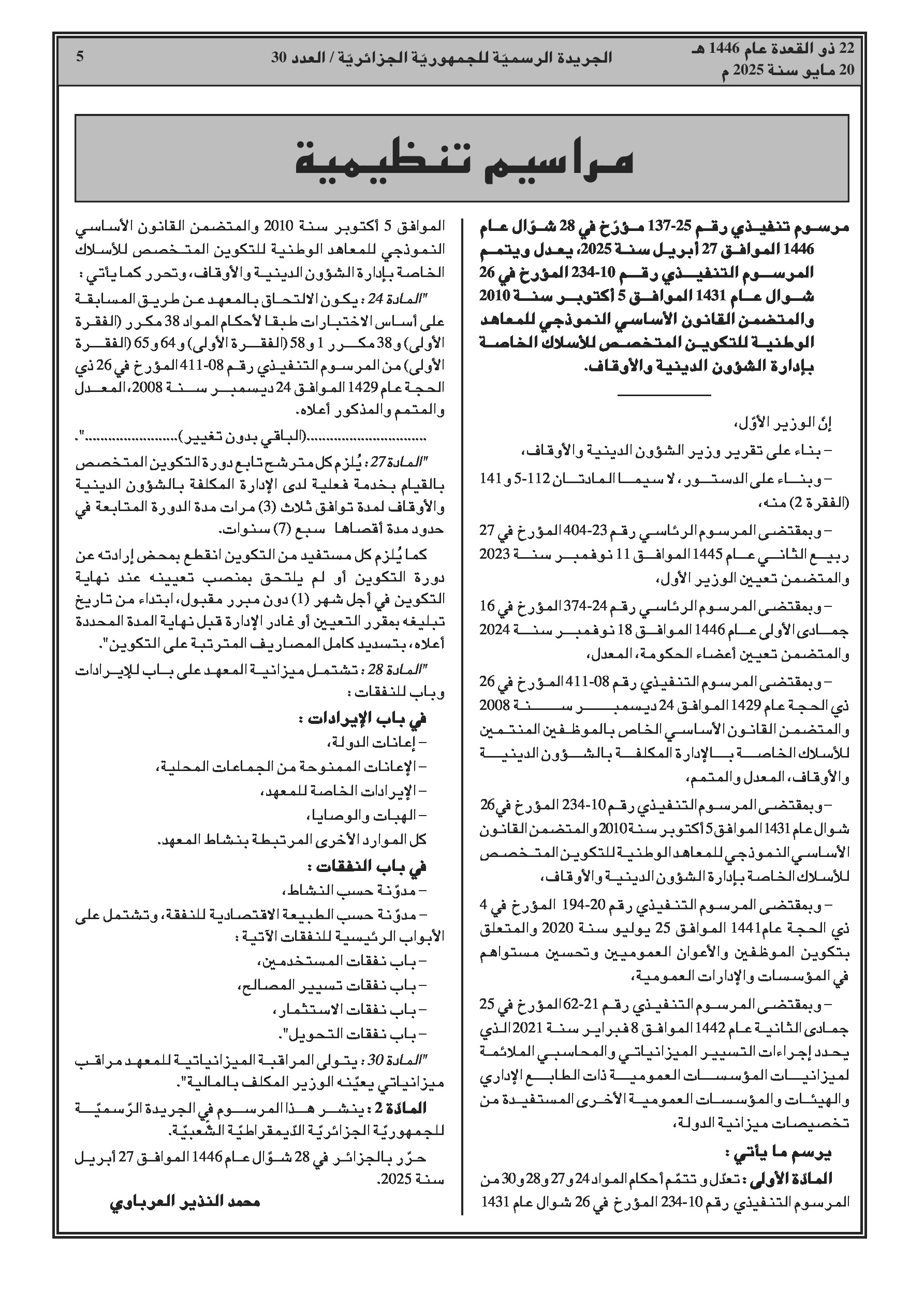 مرسوم تنفيذي يعدل ويتمم شروط الالتحاق بمعهد تكوين الأئمة، التزامات المتخرجين، وميزانية المعهد.