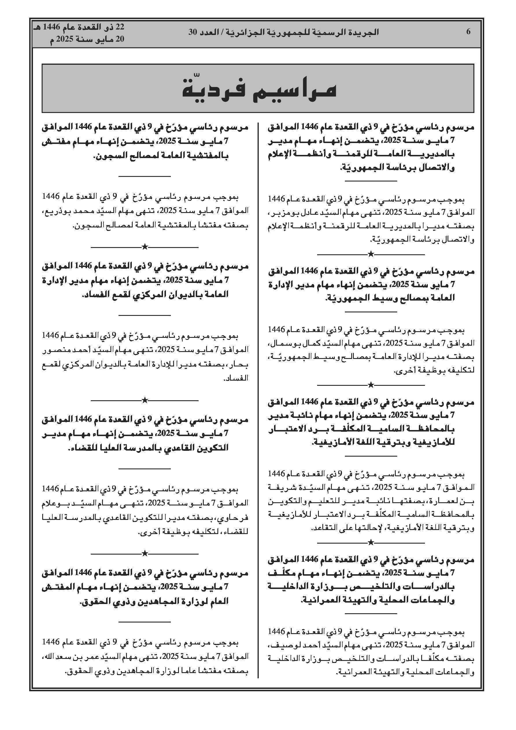 سلسلة مراسيم رئاسية وتنفيذية تتعلق بإنهاء مهام وتعيين مسؤولين جدد في مختلف القطاعات الوزارية والهيئات العمومية.