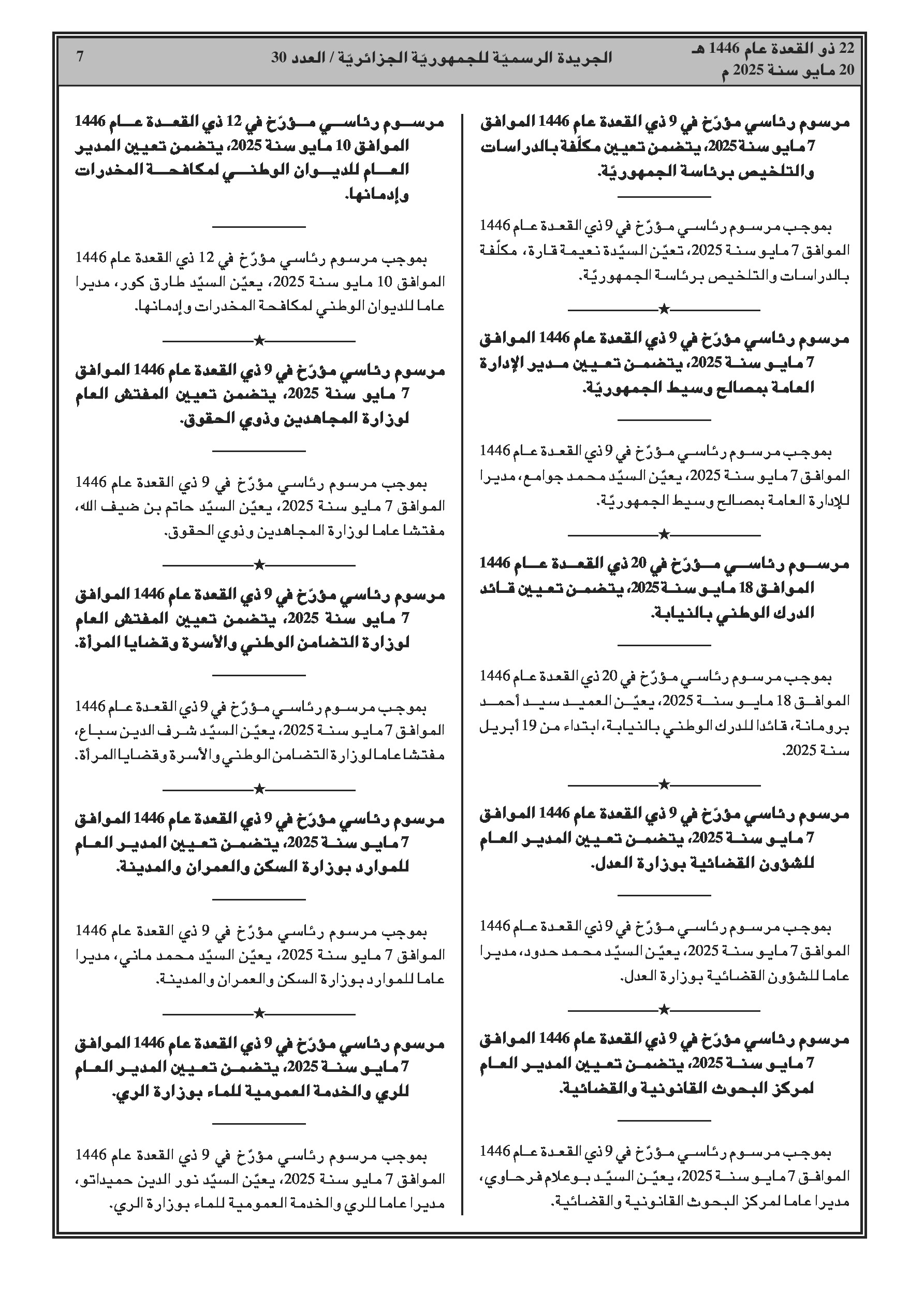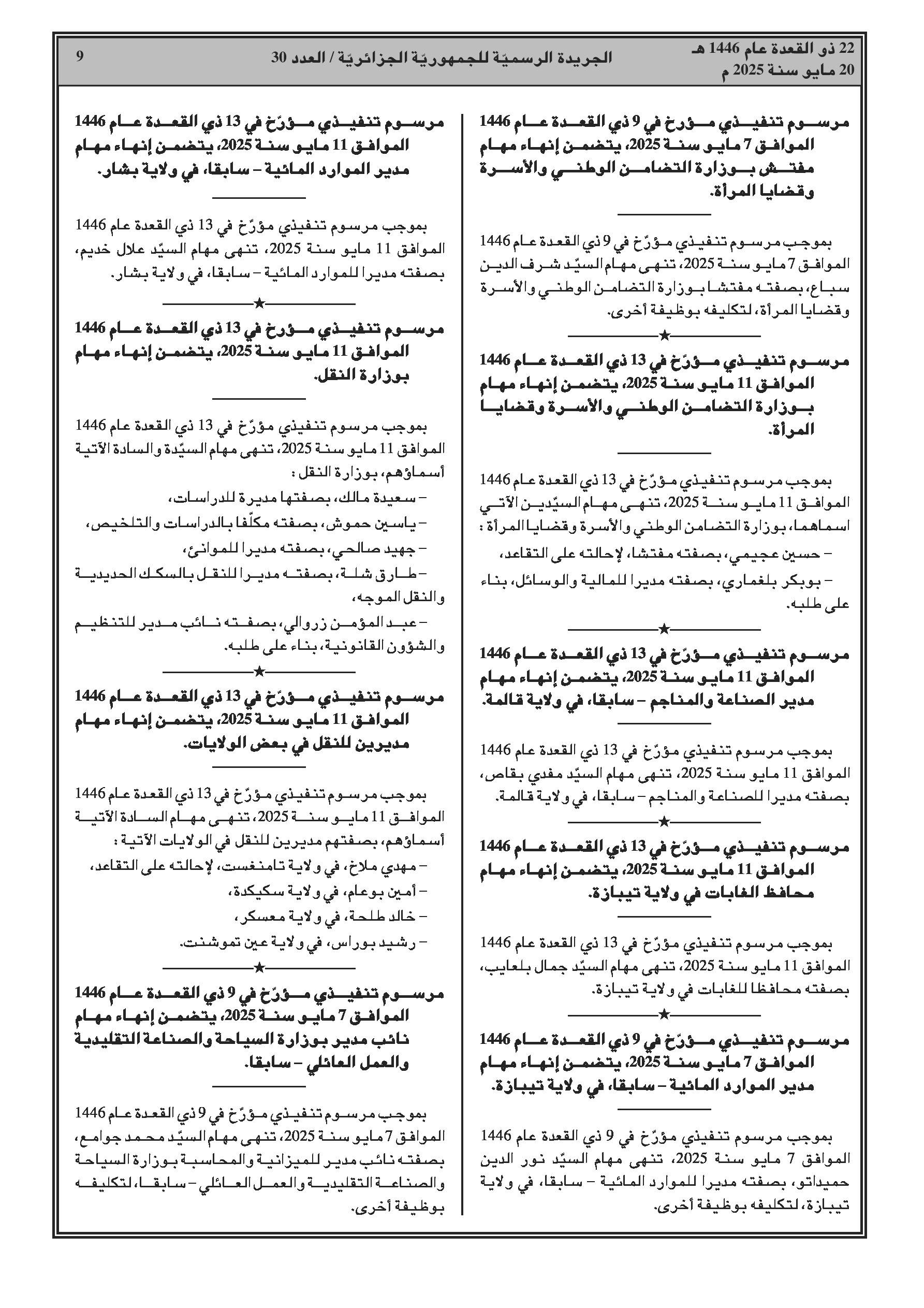 - إنهاء مهام وتعيينات في وزارات (الداخلية، العدل، المجاهدين، التضامن، السكن، الموارد المائية، النقل، الثقافة، البريد، البيئة، الاستثمار).