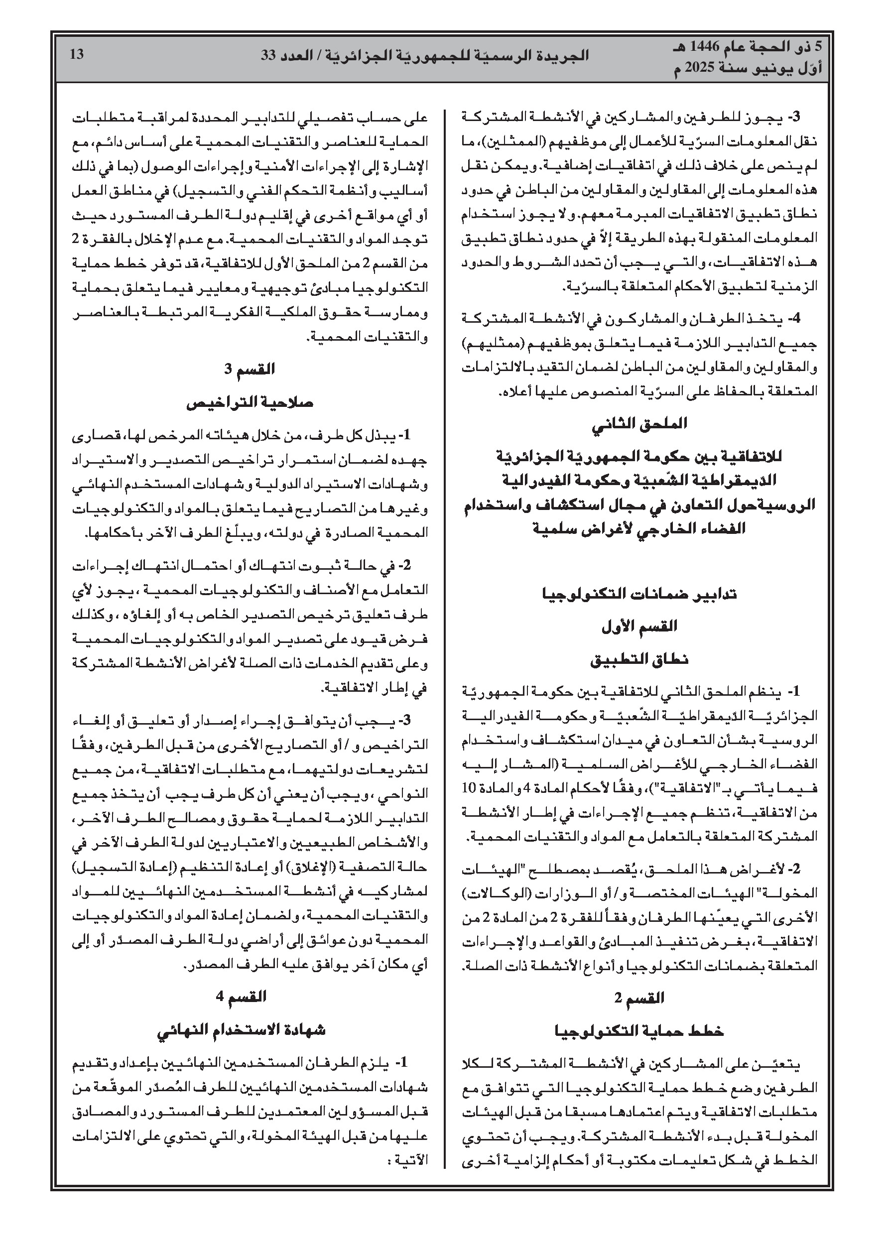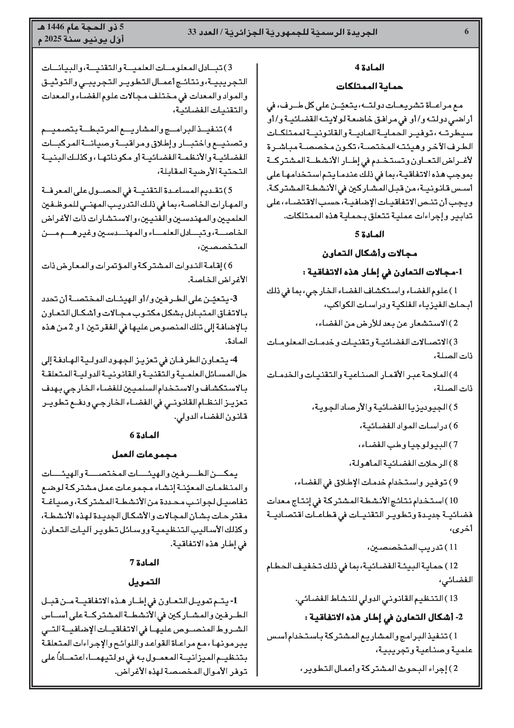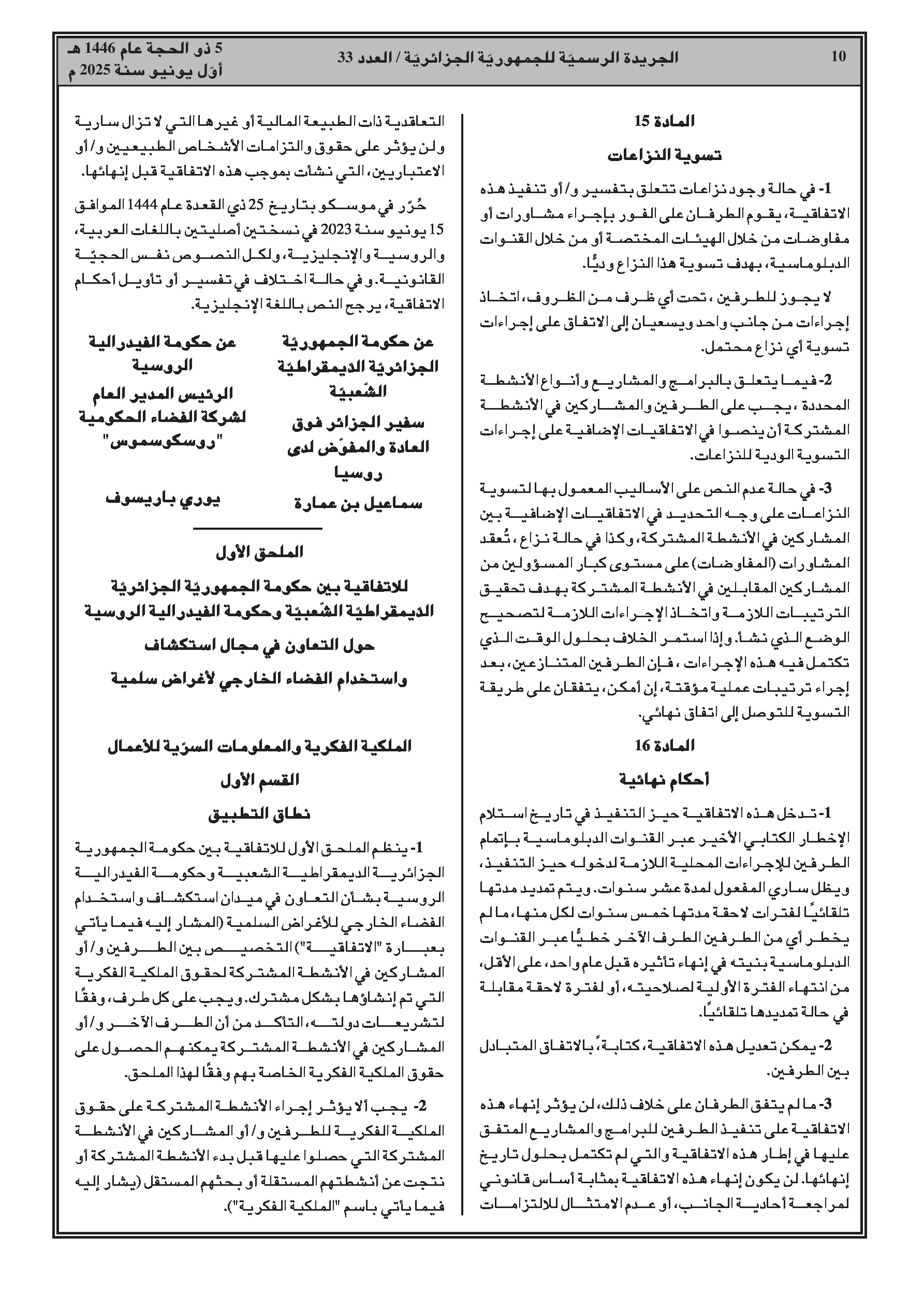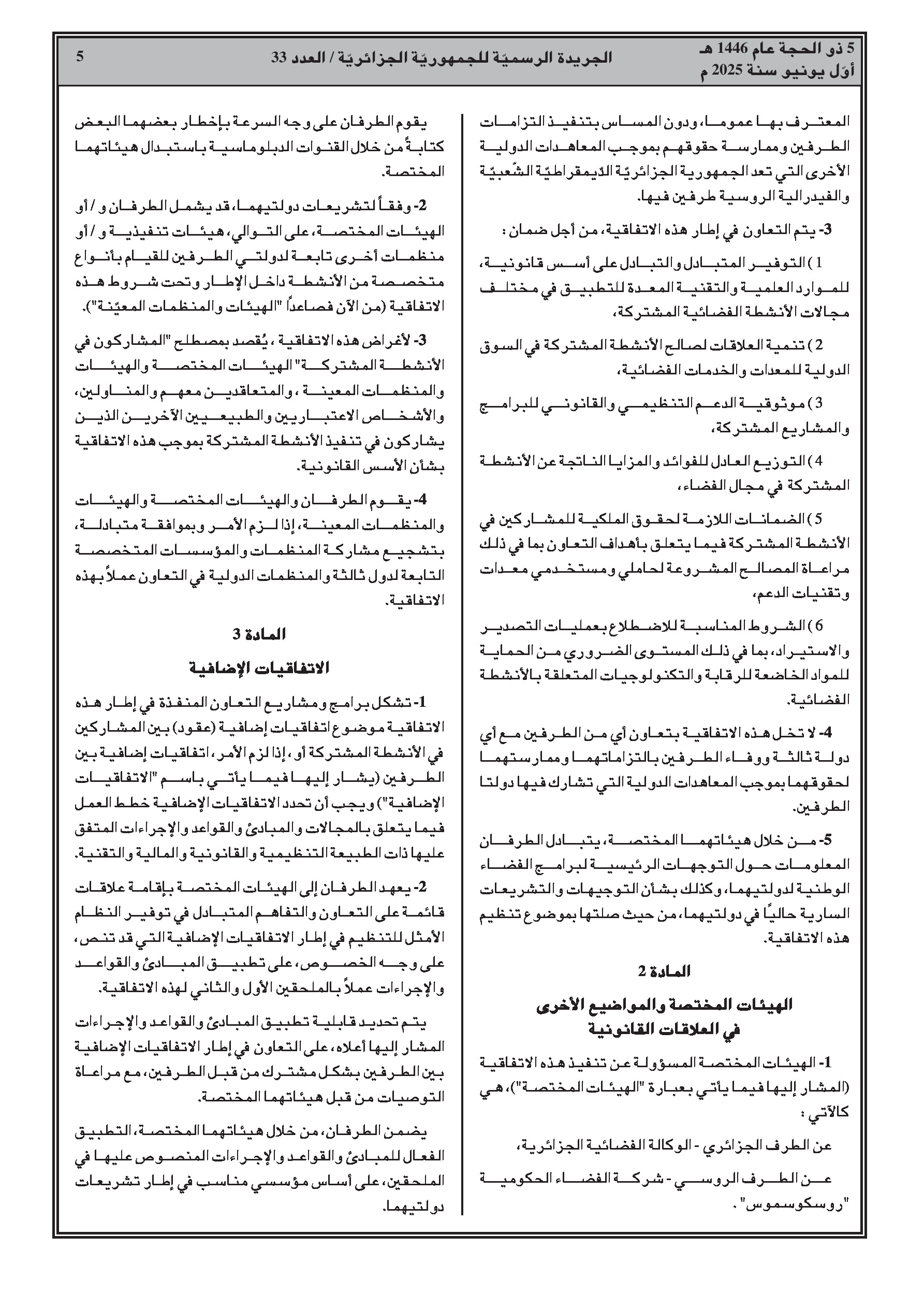 المرسوم الرئاسي رقم 25-145 يصادق على الاتفاقية الجزائرية الروسية بشأن التعاون الفضائي، الموقعة في موسكو بتاريخ 15 جوان 2023. تحدد هذه الاتفاقية إطار التعاون في مجالات مثل علوم الفضاء، الاستشعار عن بعد، الاتصالات الفضائية، الملاحة عبر الأقمار الصناعية، وتكوين المتخصصين.