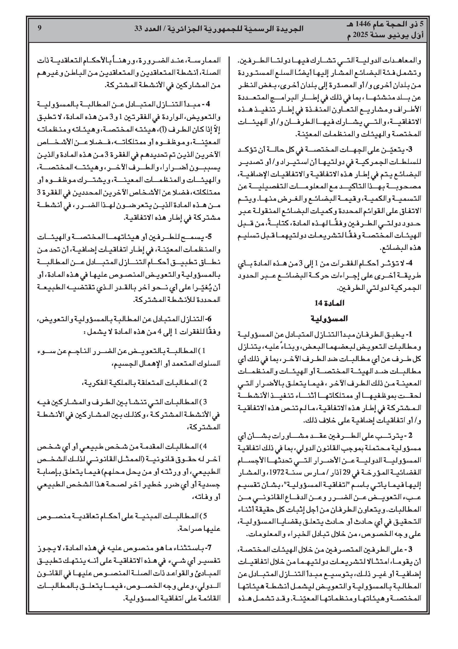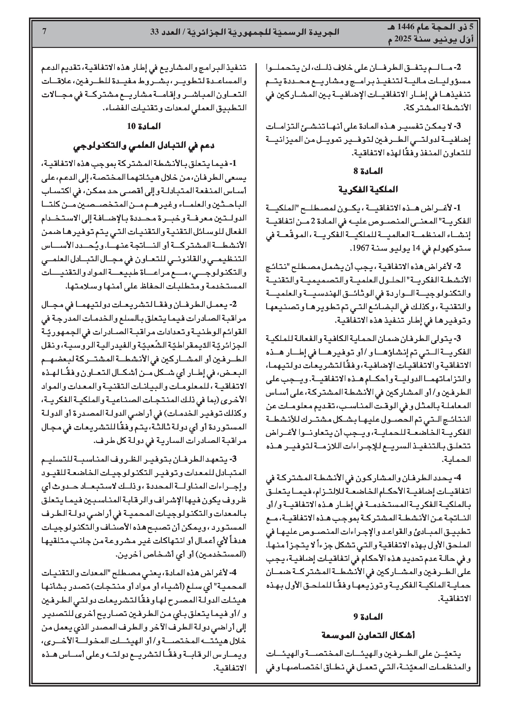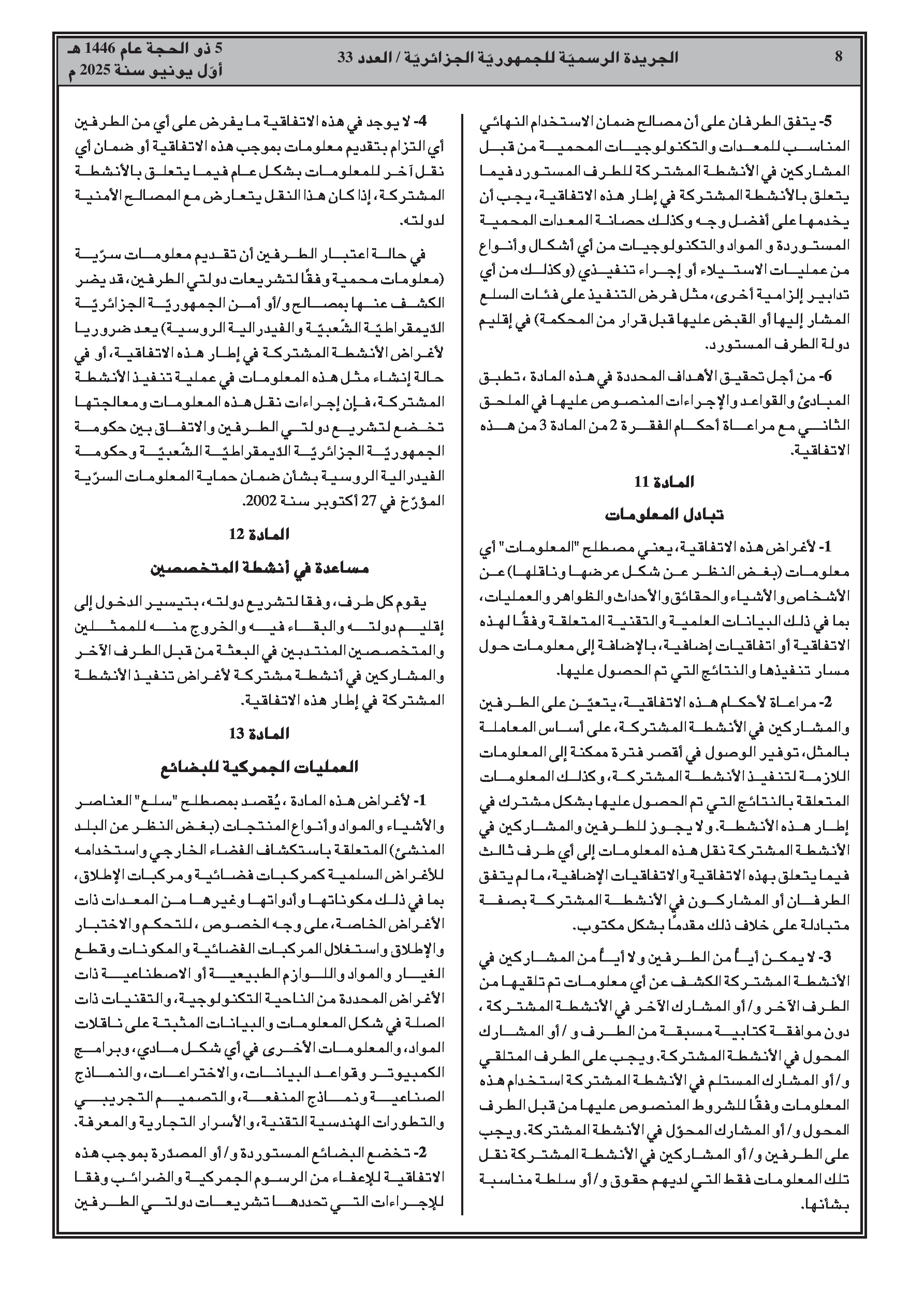 المرسوم الرئاسي رقم 25-145 يصادق على الاتفاقية الجزائرية الروسية بشأن التعاون الفضائي، الموقعة في موسكو بتاريخ 15 جوان 2023. تحدد هذه الاتفاقية إطار التعاون في مجالات مثل علوم الفضاء، الاستشعار عن بعد، الاتصالات الفضائية، الملاحة عبر الأقمار الصناعية، وتكوين المتخصصين.