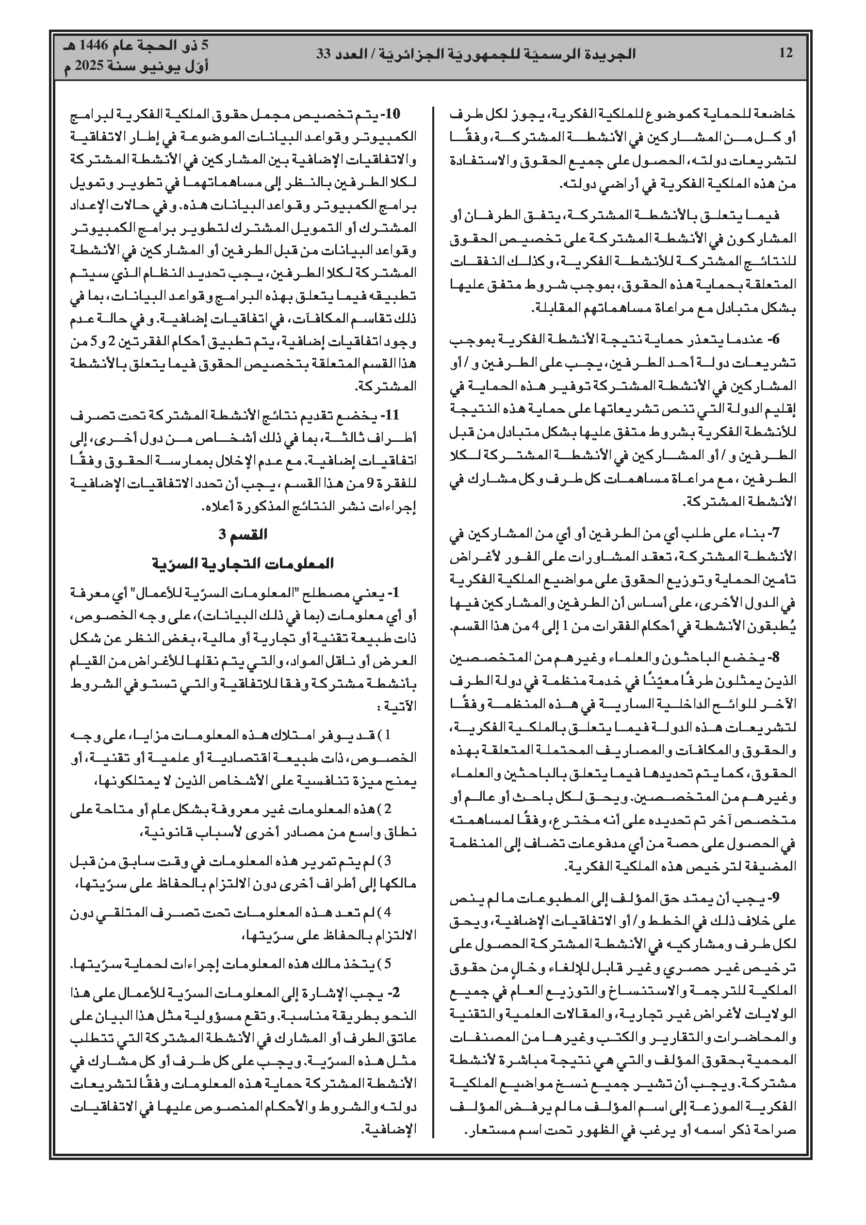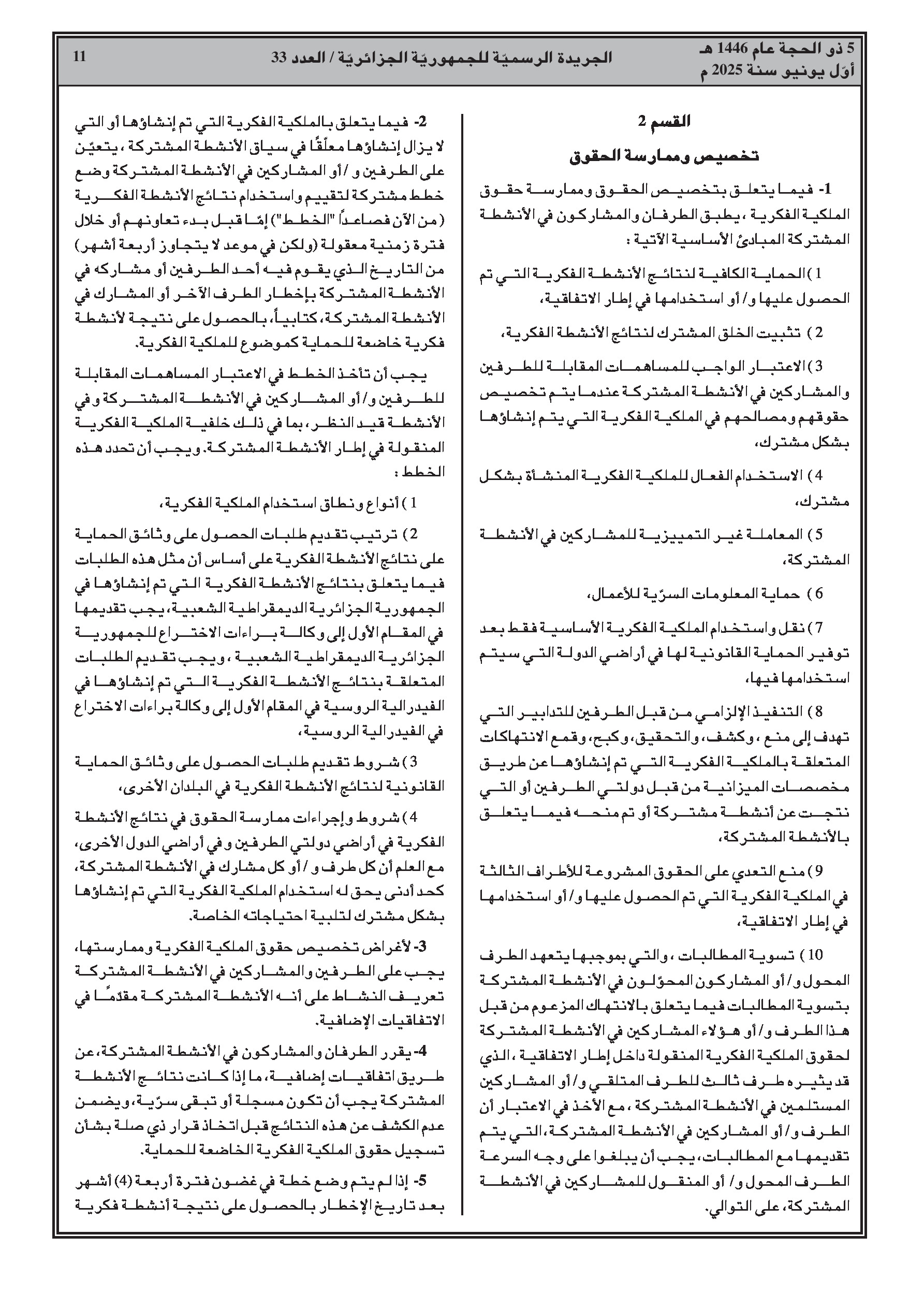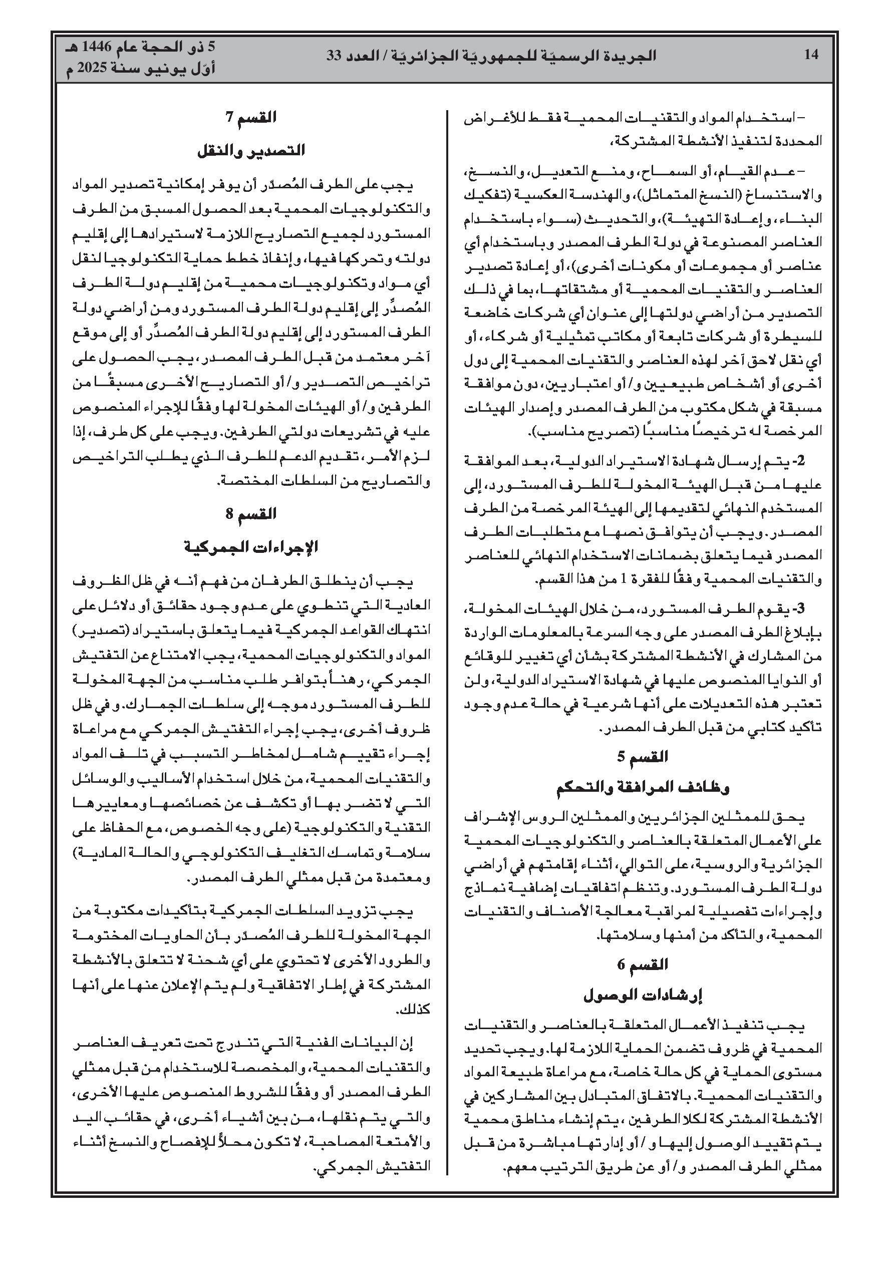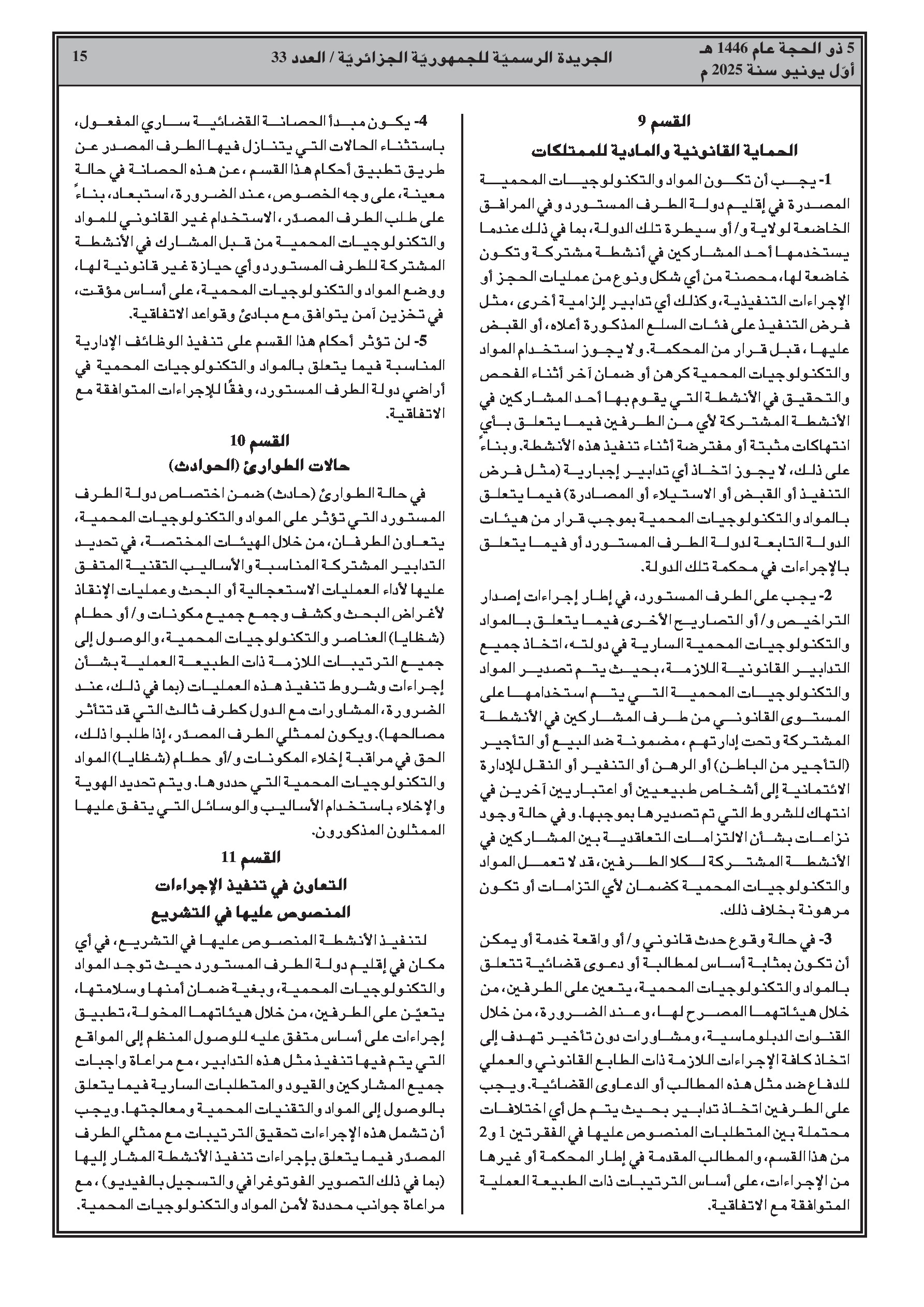 المرسوم الرئاسي رقم 25-145 يصادق على الاتفاقية الجزائرية الروسية بشأن التعاون الفضائي، الموقعة في موسكو بتاريخ 15 جوان 2023. تحدد هذه الاتفاقية إطار التعاون في مجالات مثل علوم الفضاء، الاستشعار عن بعد، الاتصالات الفضائية، الملاحة عبر الأقمار الصناعية، وتكوين المتخصصين.