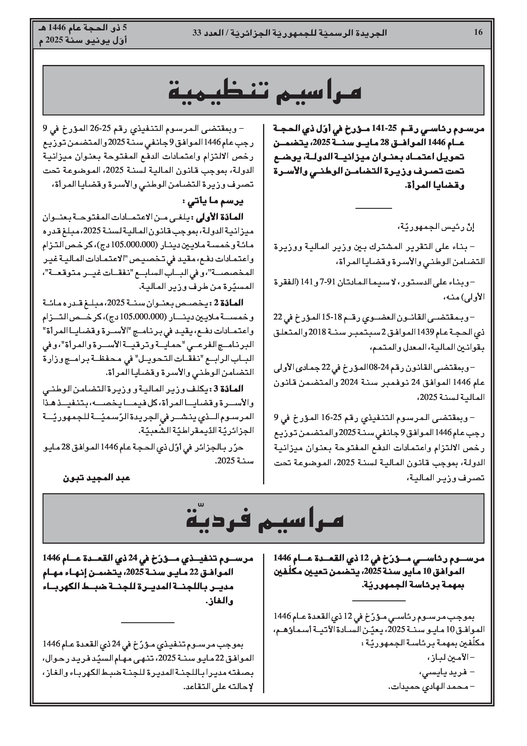 المرسوم الرئاسي رقم 25-141 المؤرخ في 28 ماي 2025 يلغي مبلغ 105 مليون دينار جزائري من مخصص 'مبلغ غير مخصص'. يعاد تخصيص هذه الاعتمادات لبرنامج 'الأسرة وقضايا المرأة' التابع لوزارة التضامن الوطني.