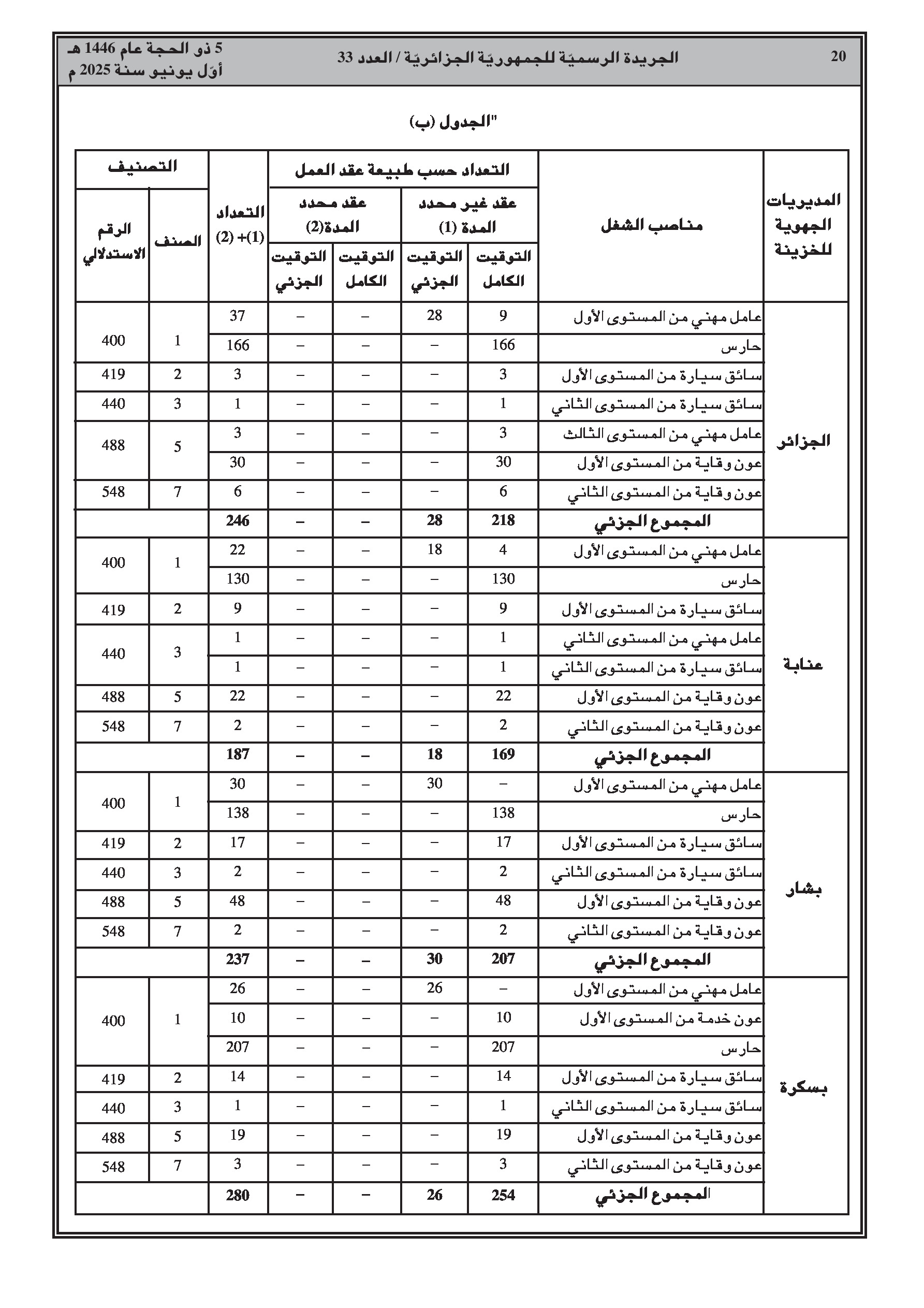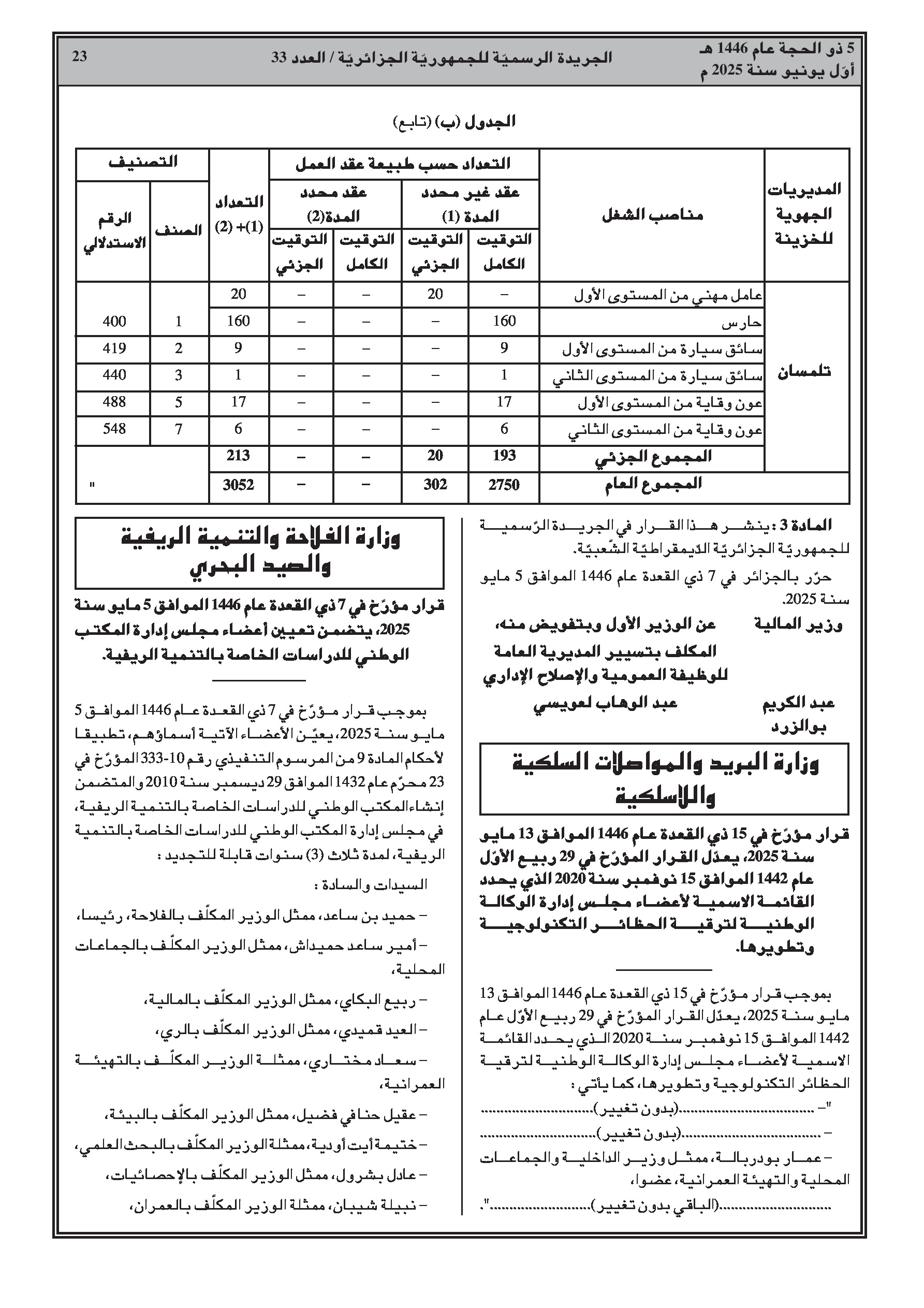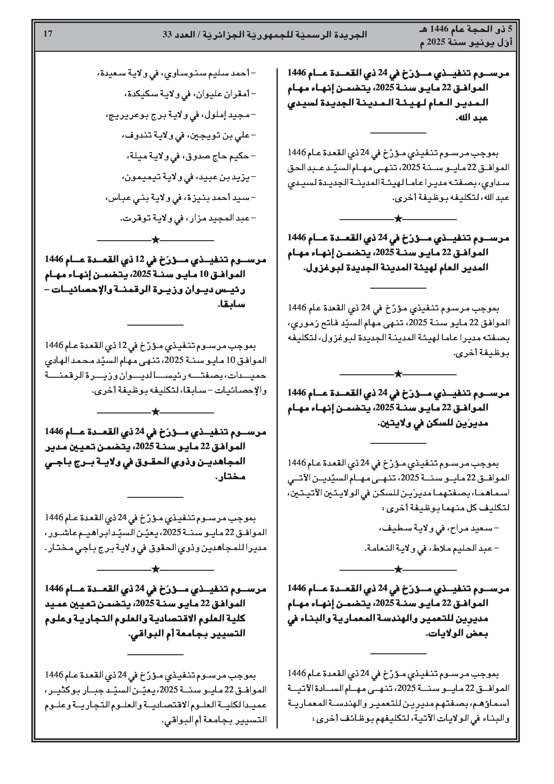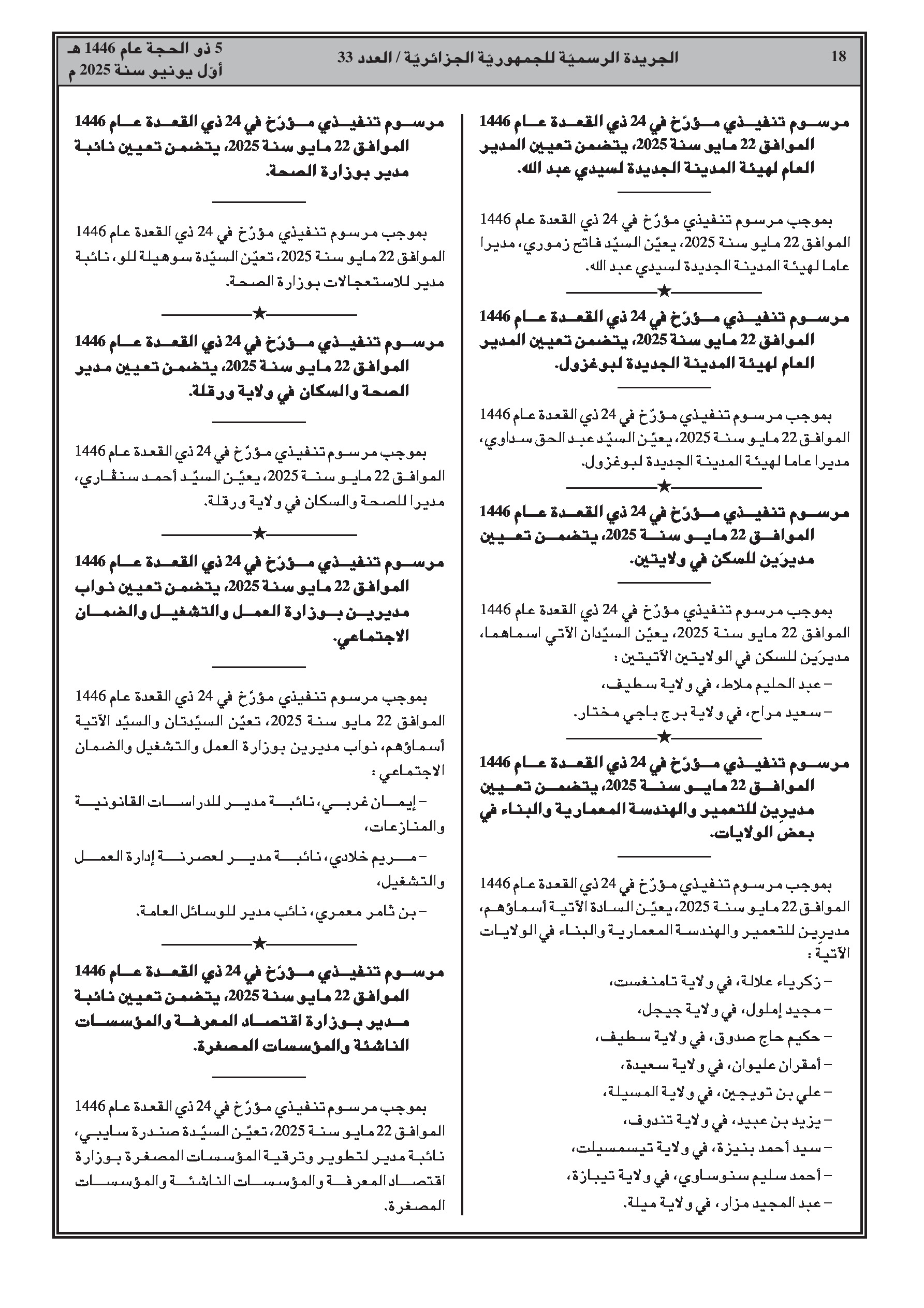 يتضمن هذا العدد تعيينات مكلفين بمهام برئاسة الجمهورية. كما يضفي الطابع الرسمي على إنهاء مهام وتعيينات للمديرين العامين للمدينتين الجديدتين سيدي عبد الله وبوغزول. وتشمل التغييرات أيضًا مديري السكن والعمران والهندسة المعمارية والبناء في عدة ولايات. وأخيرًا، تمت المصادقة على تعيينات عمداء ومديرين فرعيين ومديرين في وزارات الصحة والعمل واقتصاد المعرفة وبعض الولايات.