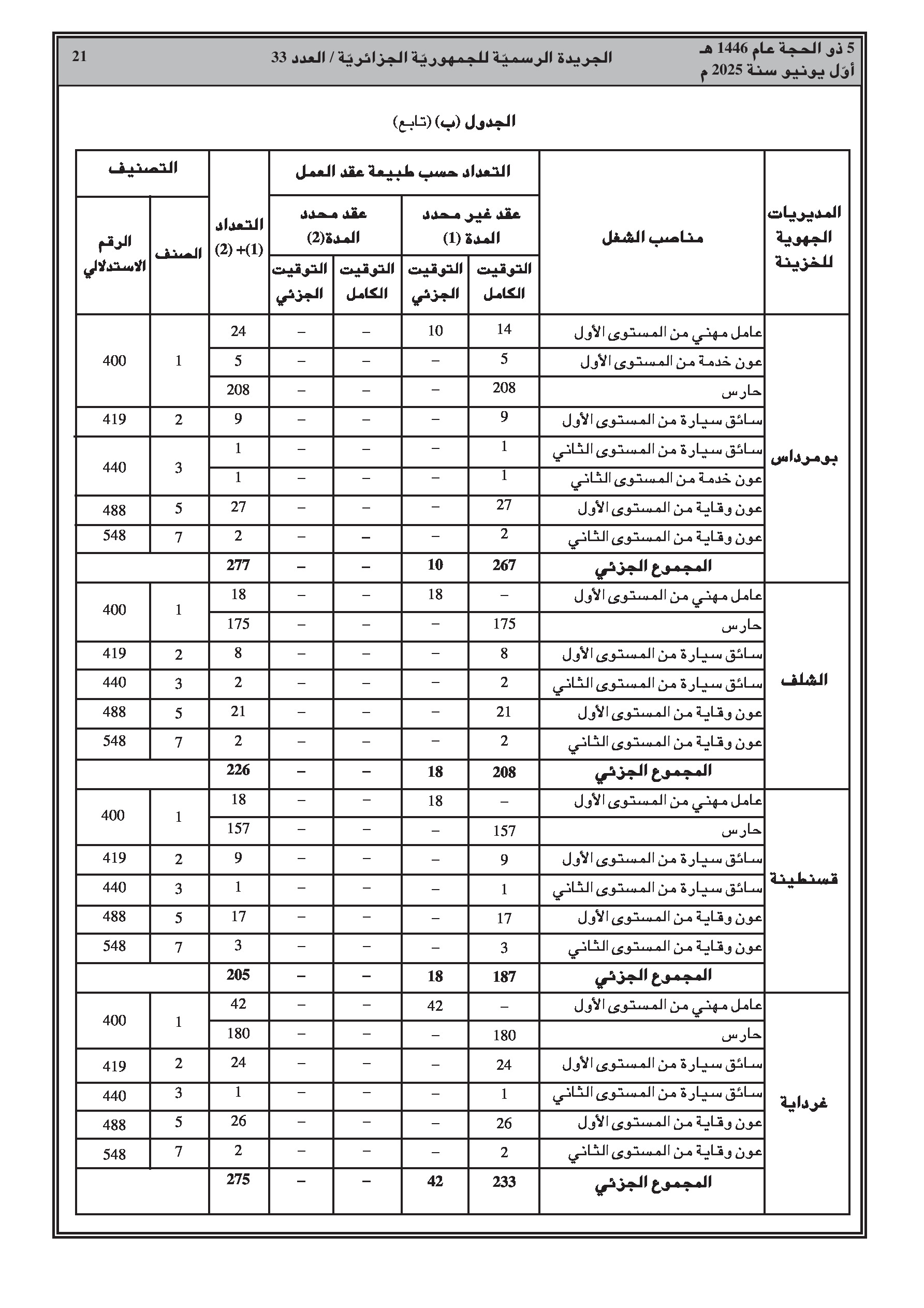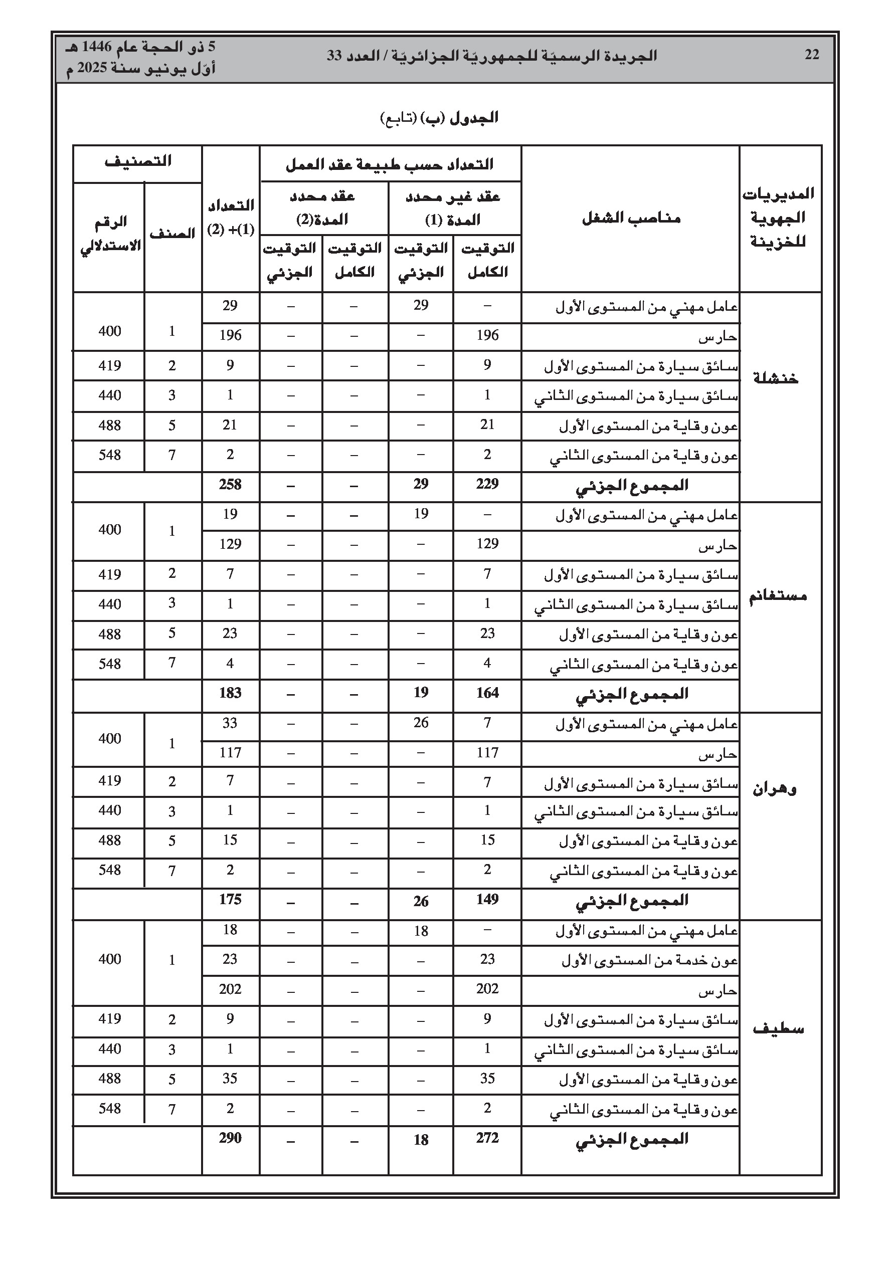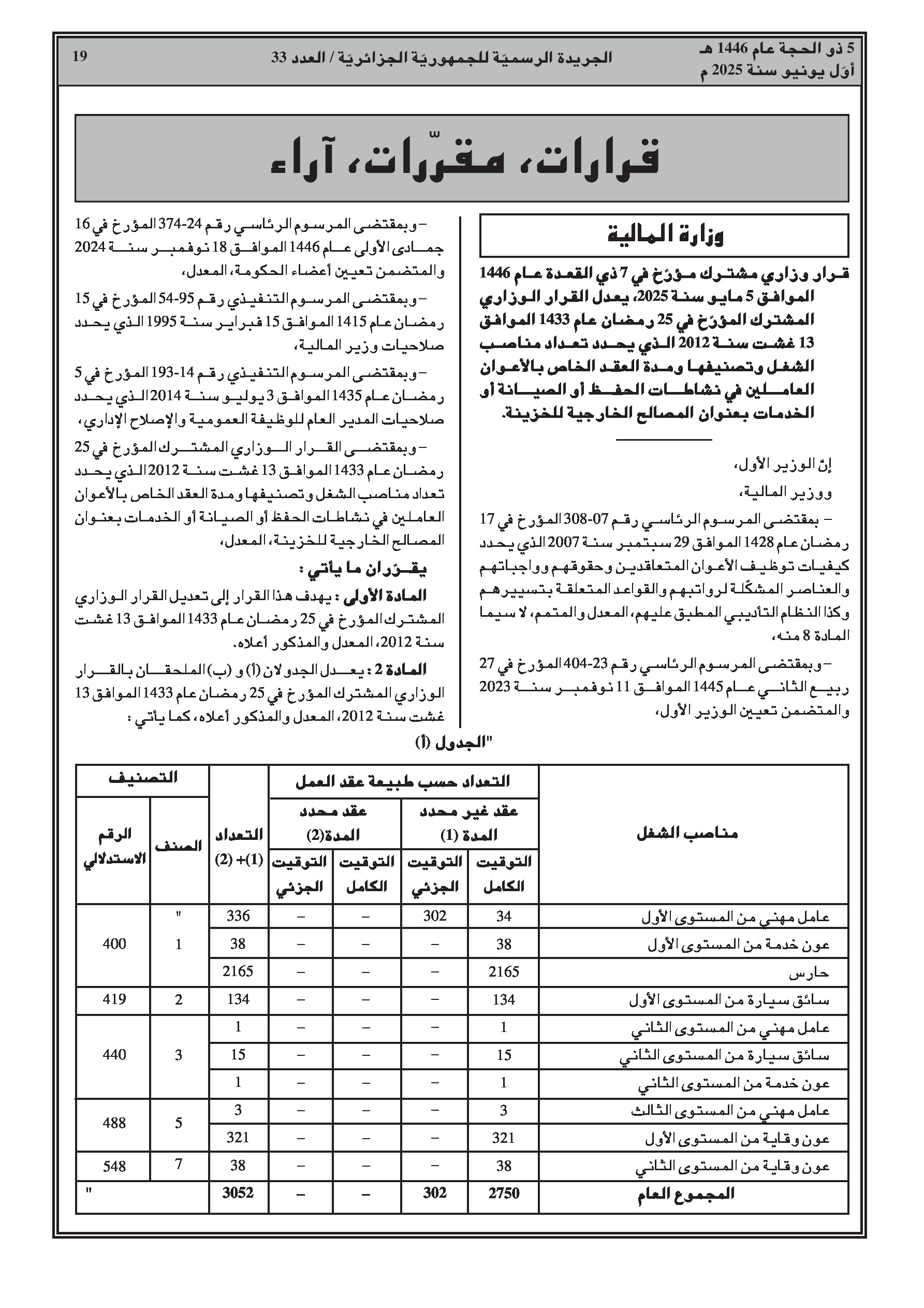 يعدل القرار الوزاري المشترك المؤرخ في 5 ماي 2025 قرار 13 أوت 2012. يقوم بتحديث الجدولين (أ) و (ب) الخاصين بالتعداد حسب المنصب (عمال مهنيون، أعوان خدمة، حراس، سائقو سيارات، أعوان وقاية) للمصالح المركزية والمديريات الجهوية للخزينة.
