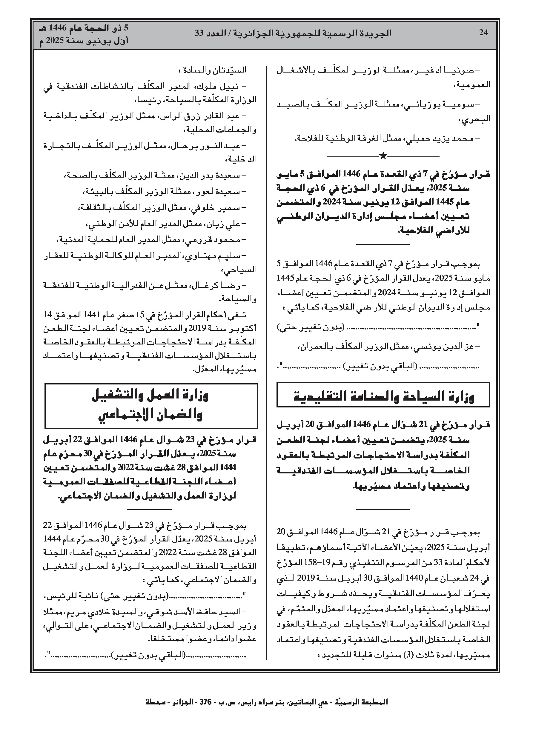 قرار مؤرخ في 20 أفريل 2025 يتضمن تعيين أعضاء لجنة الطعون المكلفة بدراسة النزاعات المتعلقة بالمؤسسات الفندقية. هذا التعيين لمدة ثلاث سنوات قابلة للتجديد. تم إلغاء قرار 14 أكتوبر 2019.