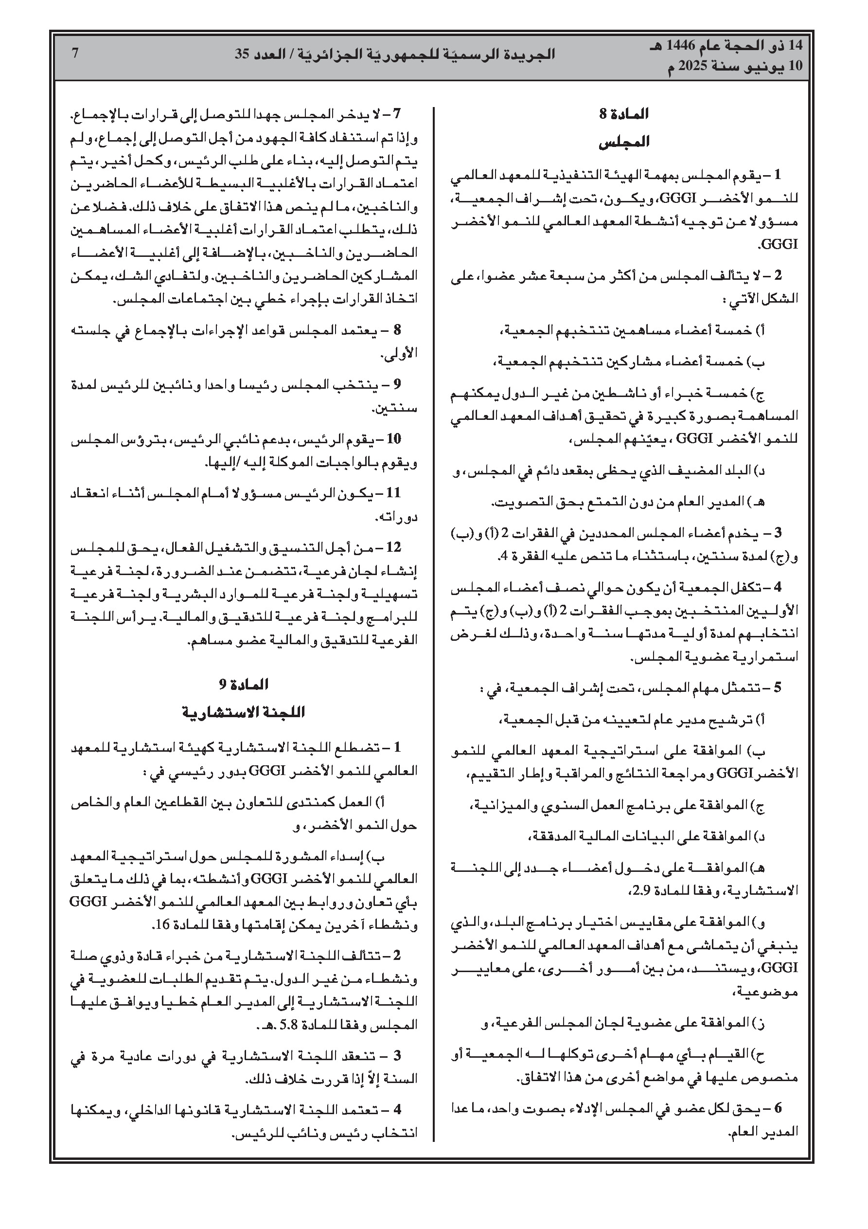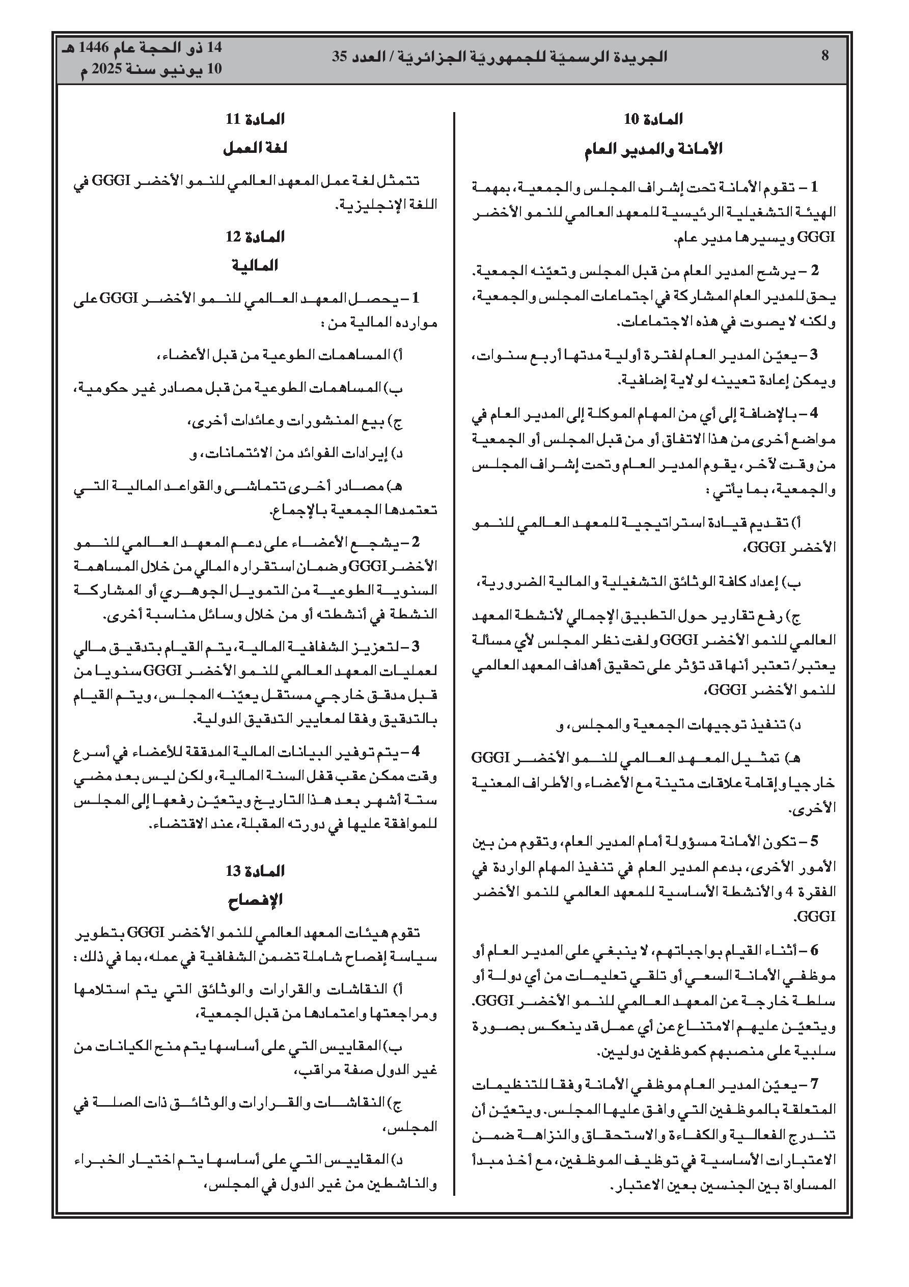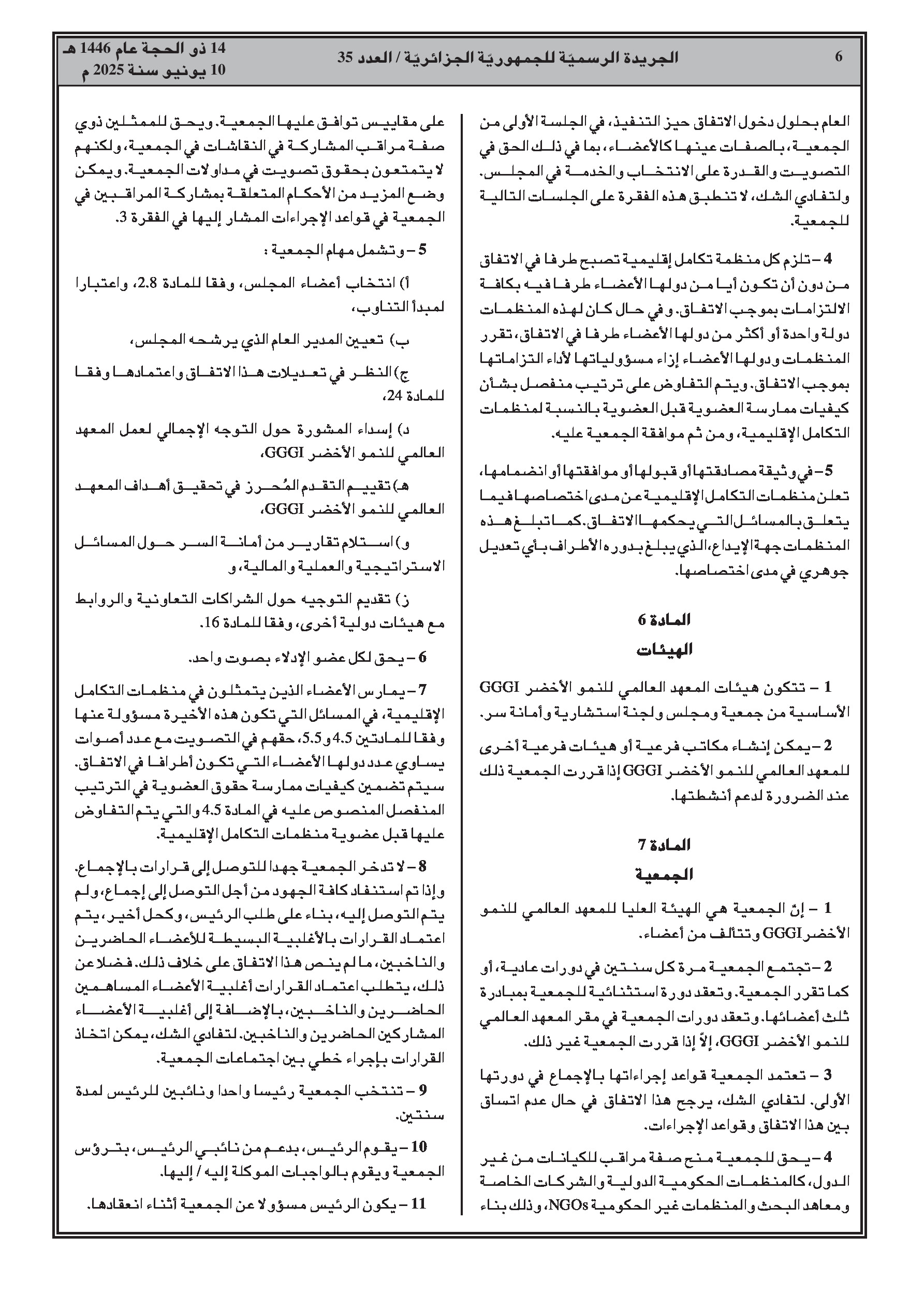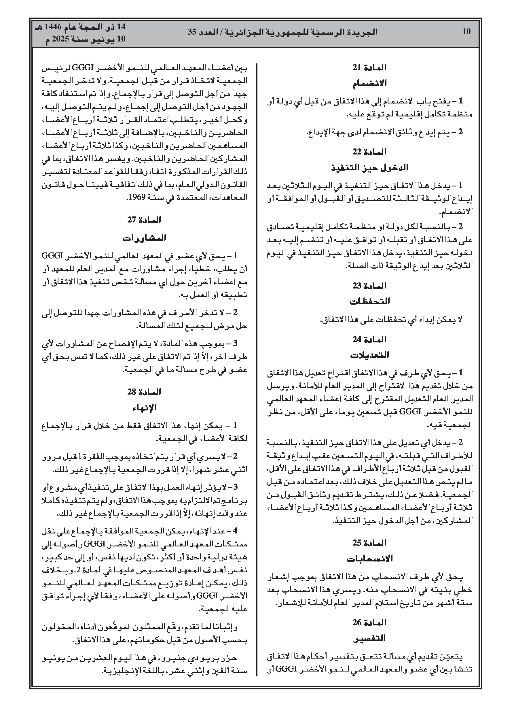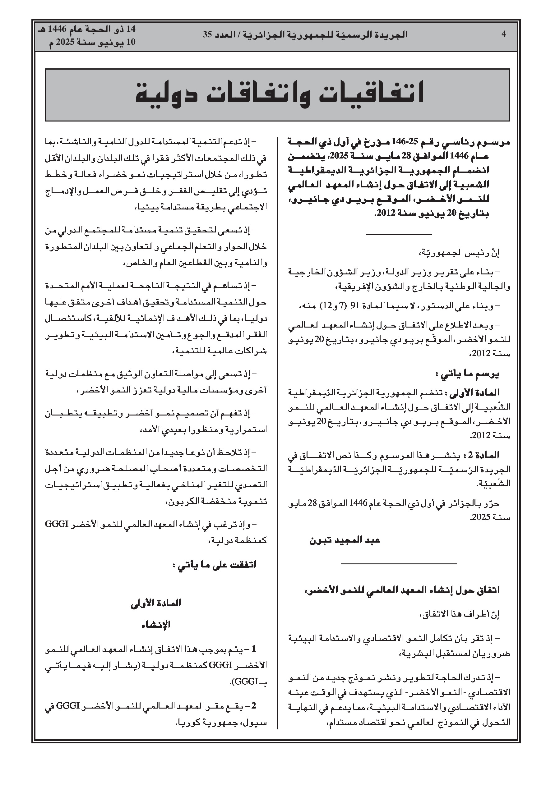 المرسوم الرئاسي رقم 25-146 يضفي الطابع الرسمي على انضمام الجزائر إلى الاتفاق المتعلق بإنشاء المعهد العالمي للنمو الأخضر، الموقع في ريو دي جانيرو بتاريخ 20 جوان 2012. يهدف المعهد إلى دعم البلدان النامية في انتقالها إلى نموذج نمو أخضر، يركز على الأداء الاقتصادي، والحد من الفقر، وخلق فرص العمل، والإدماج الاجتماعي، والاستدامة البيئية.