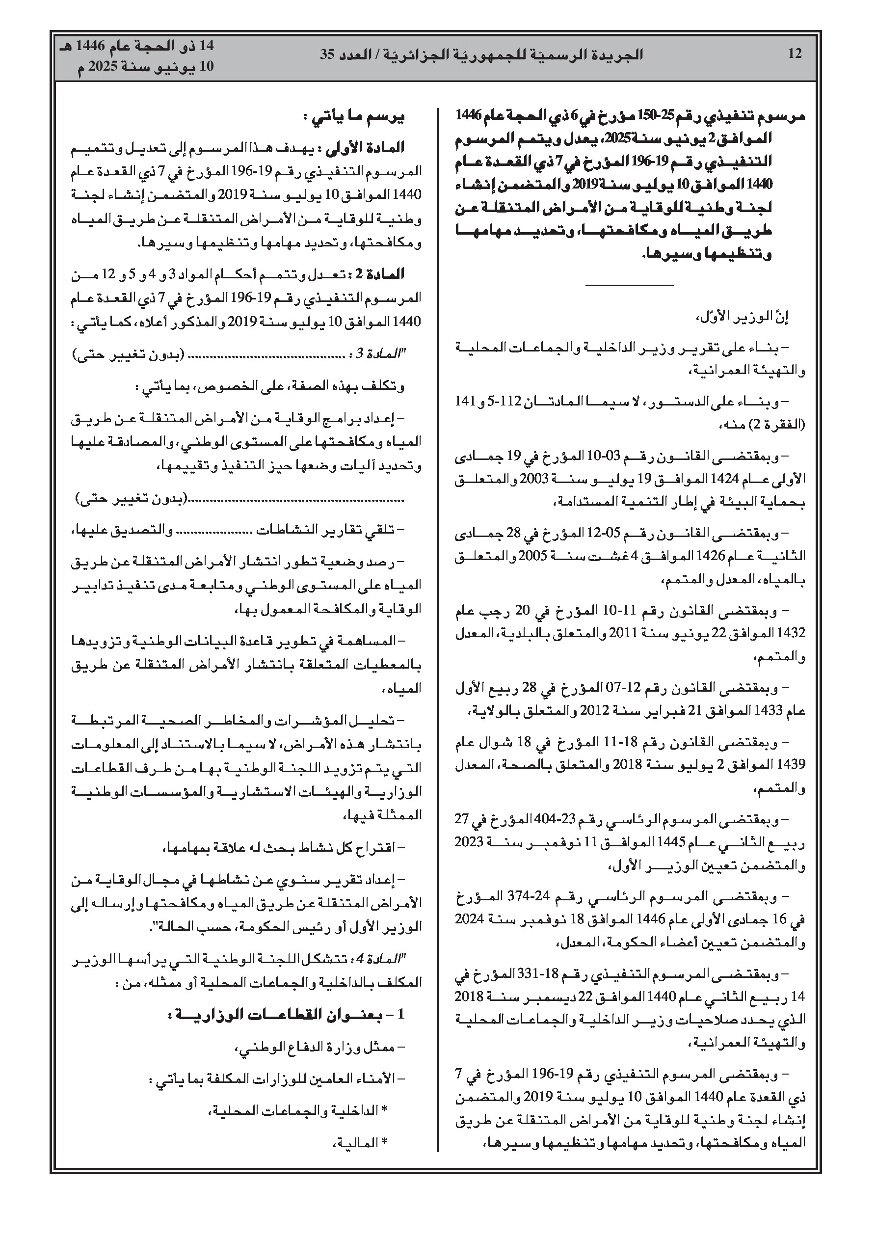 المرسوم الرئاسي رقم 25-142 يرخص بتحويل اعتمادات ضمن ميزانية الدولة لعام 2025، معيدًا تخصيص أموال لمصالح الوزير الأول. المرسوم التنفيذي رقم 25-150 يعدل ويتمم المرسوم رقم 19-196 المتعلق بإنشاء وتحديد مهام وتنظيم وسير اللجنة الوطنية للوقاية من الأمراض المتنقلة عن طريق المياه ومكافحتها، معززًا إطارها العملياتي وتمثيلها.