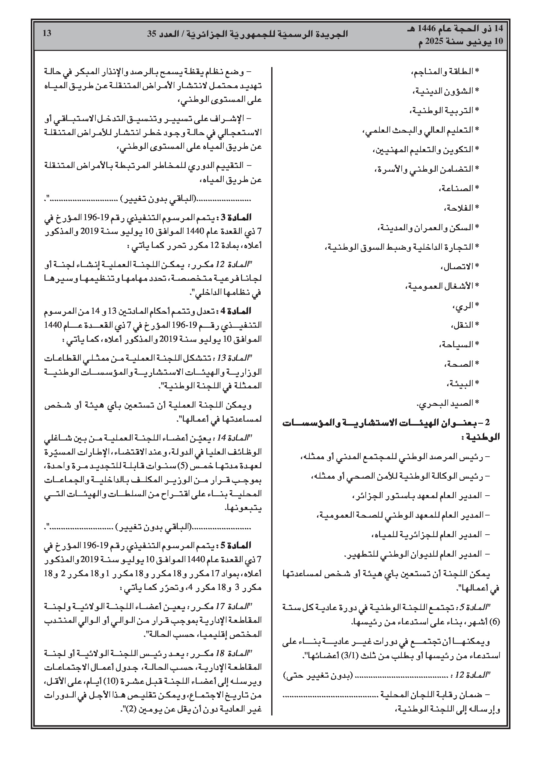 يتضمن هذا القسم مرسومًا رئاسيًا بشأن تحويل اعتمادات ميزانية الدولة ومرسومًا تنفيذيًا يعدل اللجنة الوطنية للوقاية من الأمراض المنقولة بالمياه ومكافحتها.