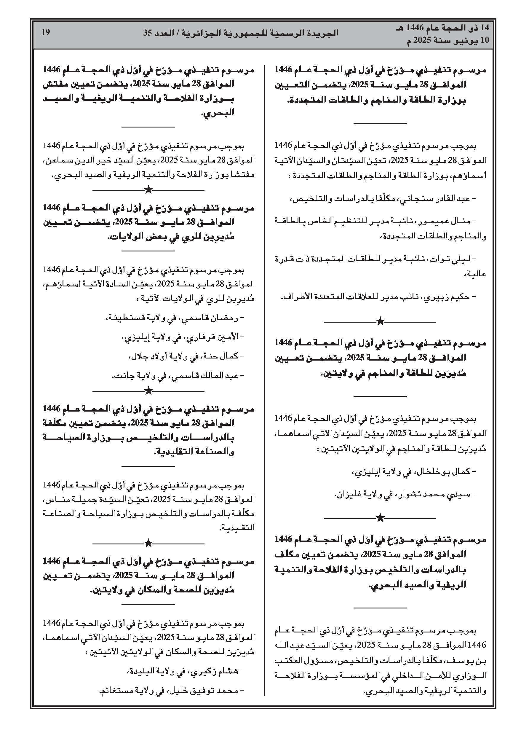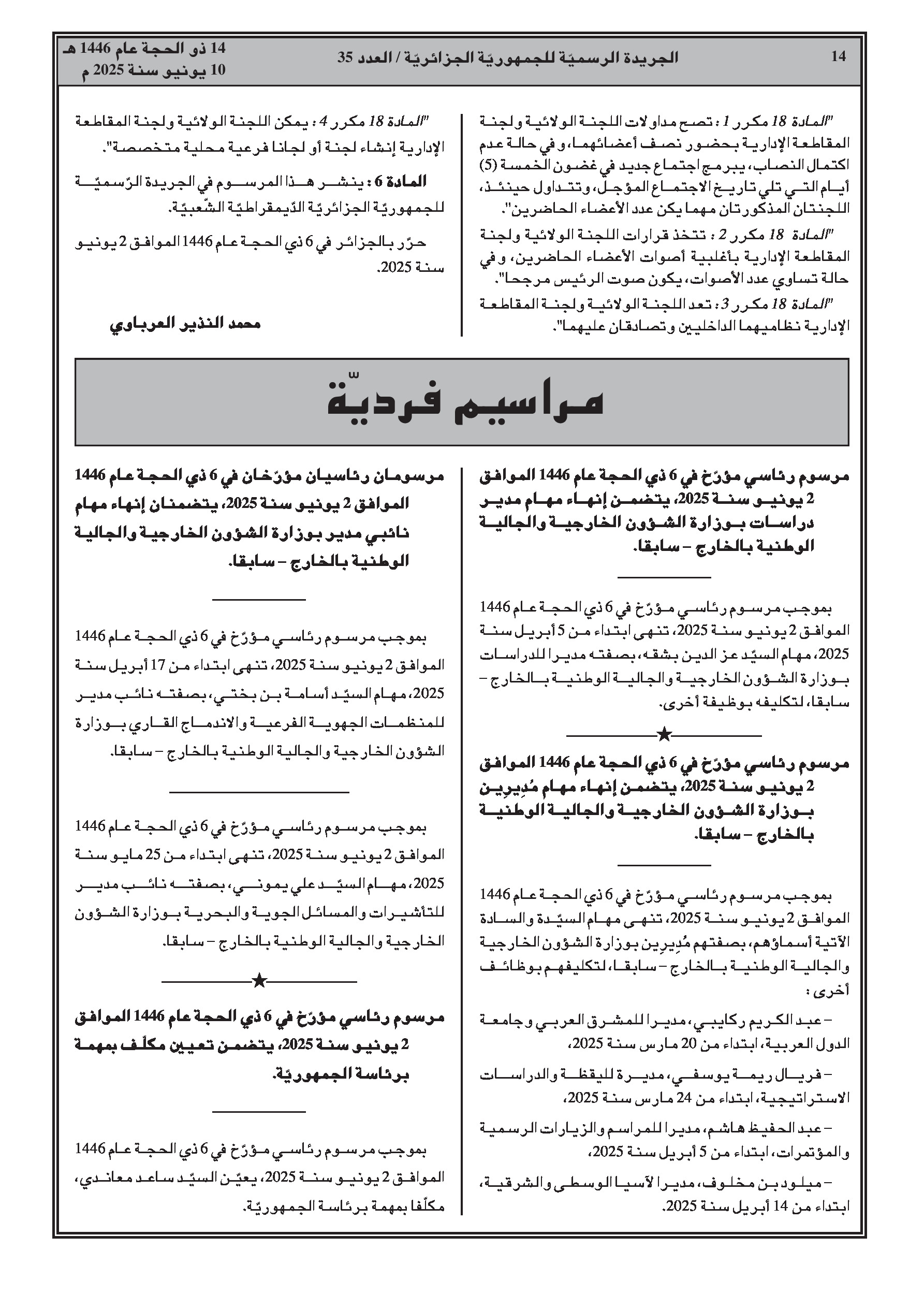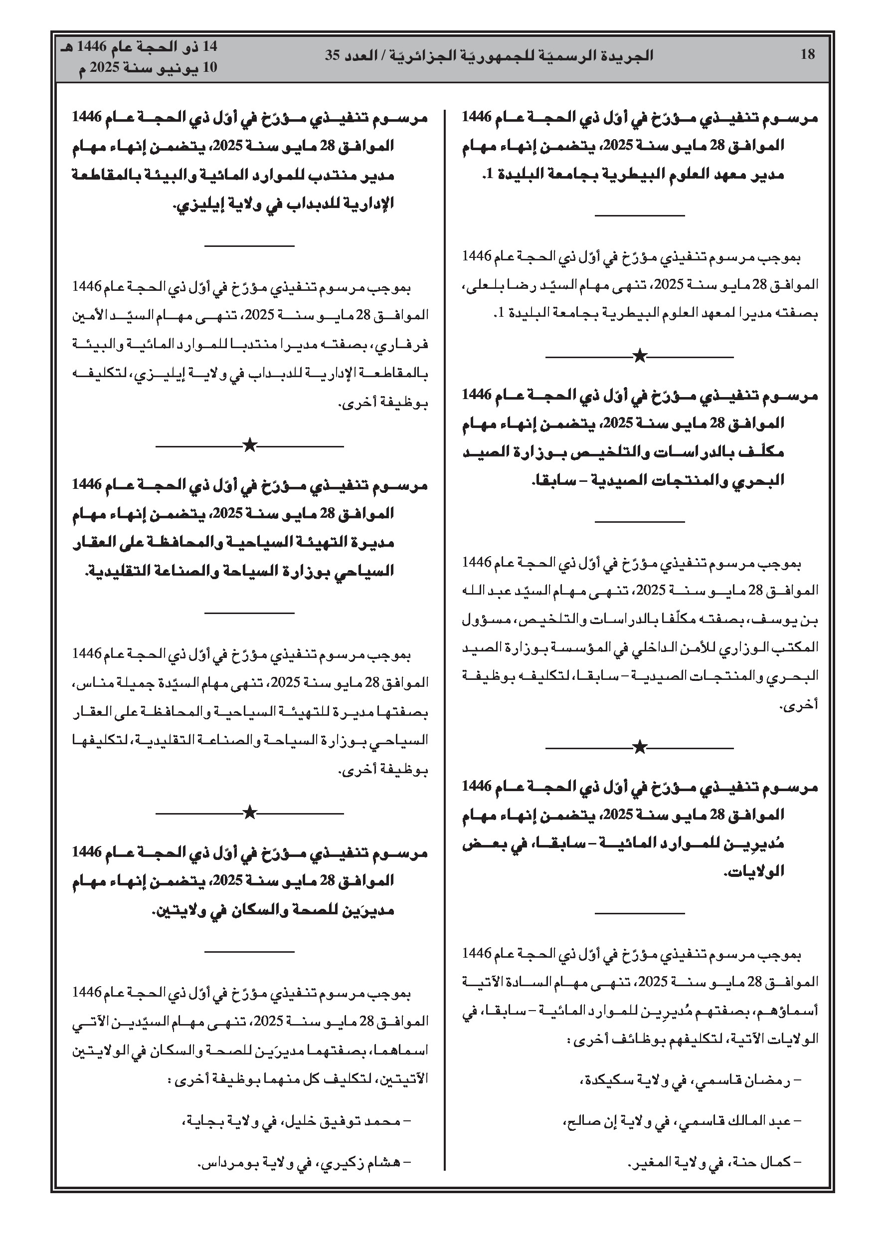 مراسيم متعددة تعلن عن تغييرات واسعة في الموظفين، تشمل إنهاء مهام وتعيينات جديدة لـ: مديرين، مدراء فرعيين، سفراء، وقناصل بوزارة الشؤون الخارجية؛ المدير العام لدار النشر الإسلامية 'العصر'؛ مفتش، مديرات فرعيات، أمناء عامين للجامعات، نواب مديري الجامعات، وعمداء كليات في قطاع التعليم العالي. بالإضافة إلى ذلك، لوحظت تغييرات على مستوى المديرين (إنهاء مهام وتعيينات) في قطاعات العلوم البيطرية، الصيد البحري، الموارد المائية، السياحة، الطاقة، الفلاحة، ومديريات الصحة الولائية.