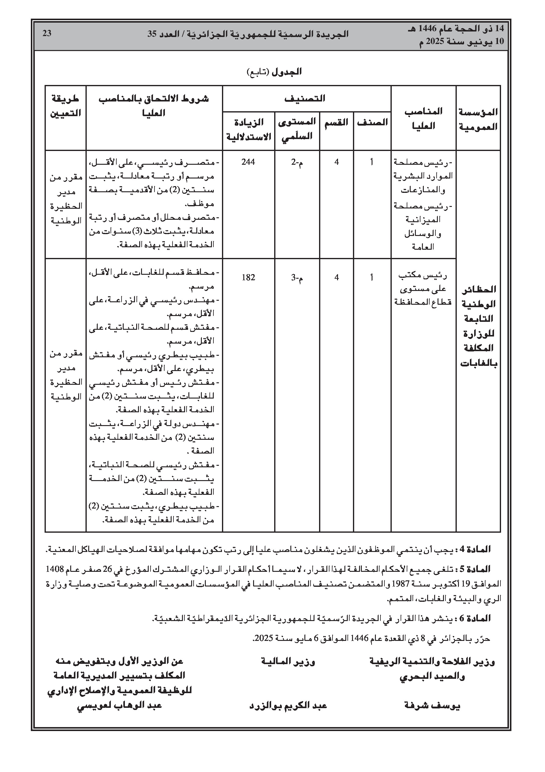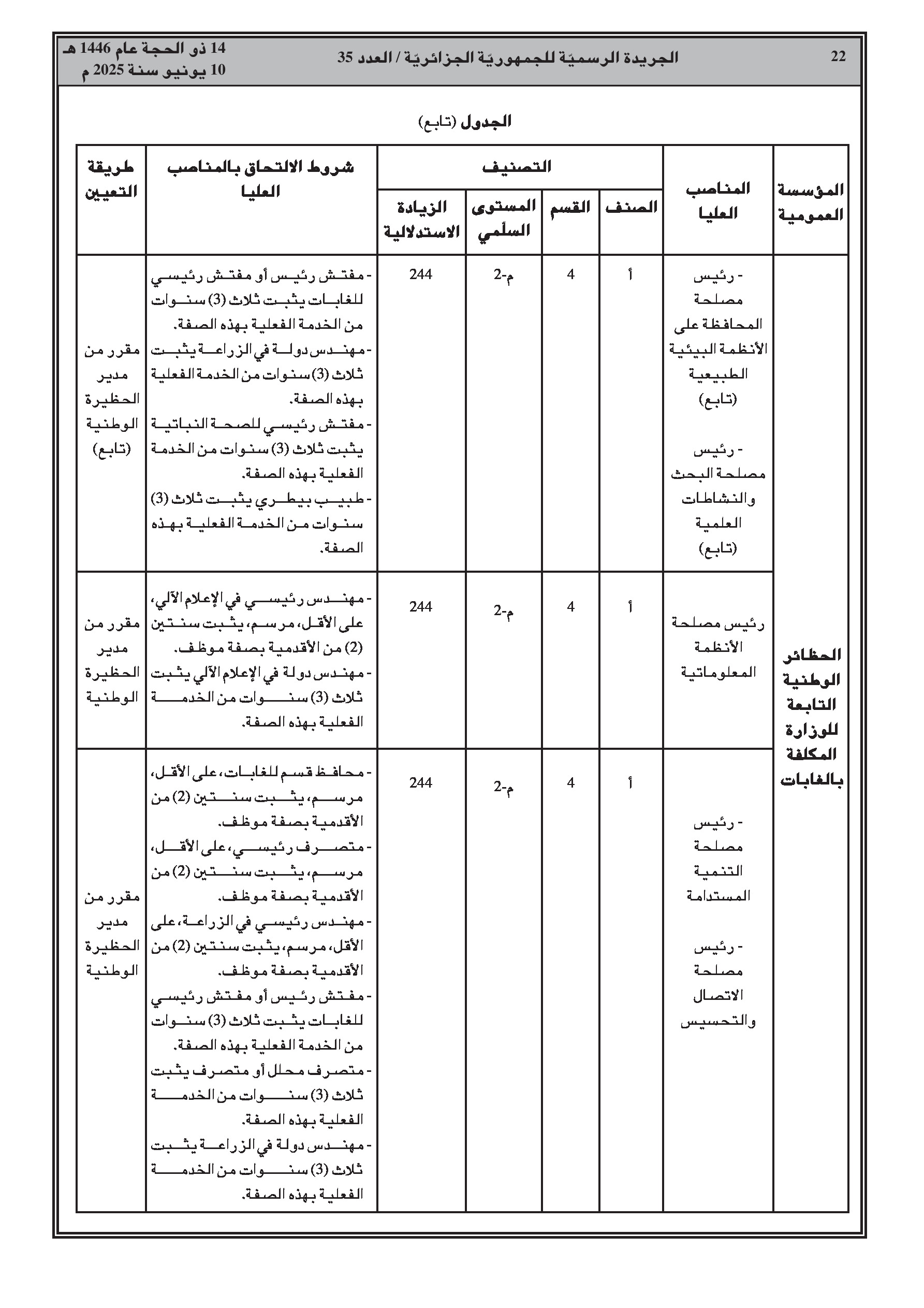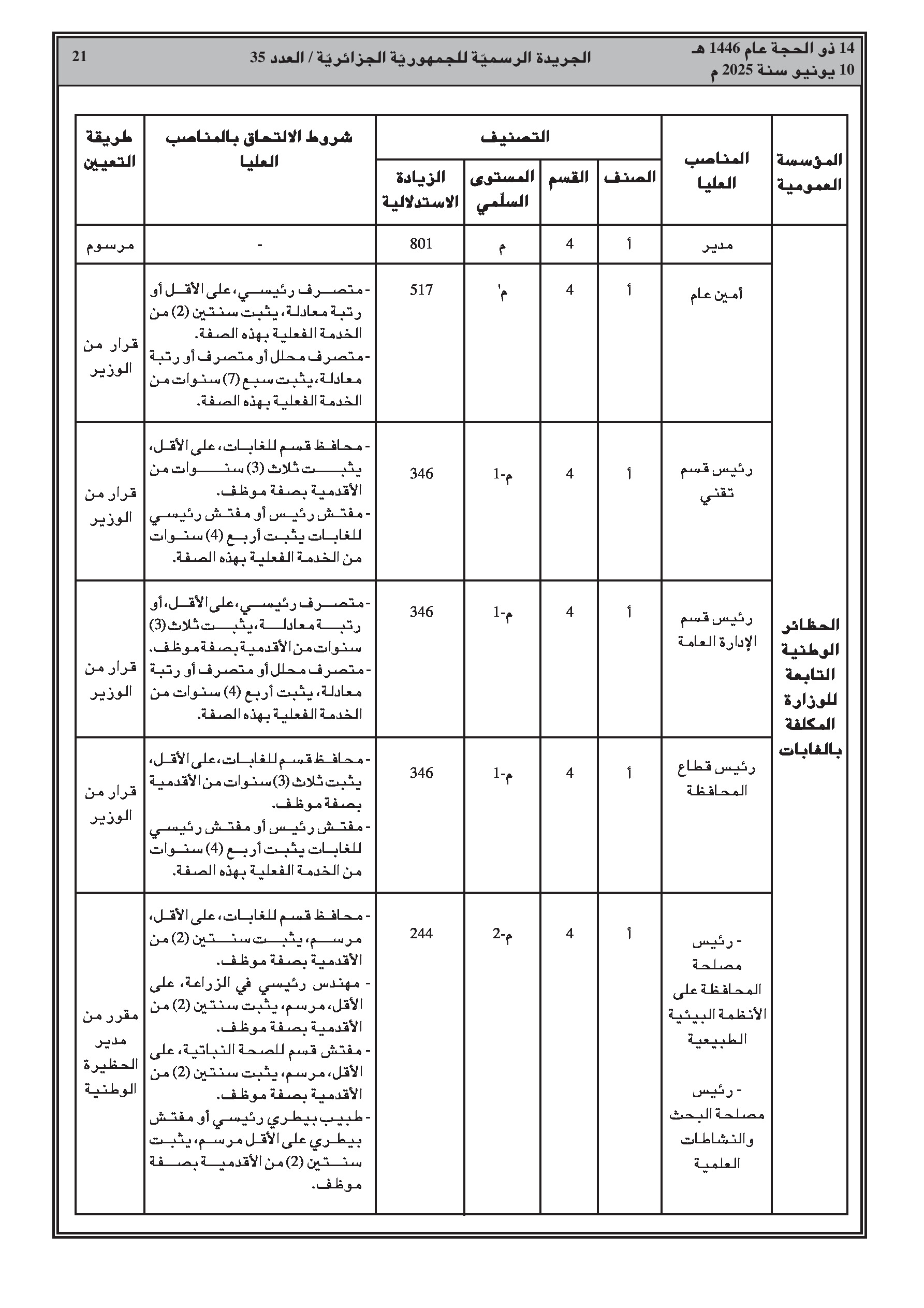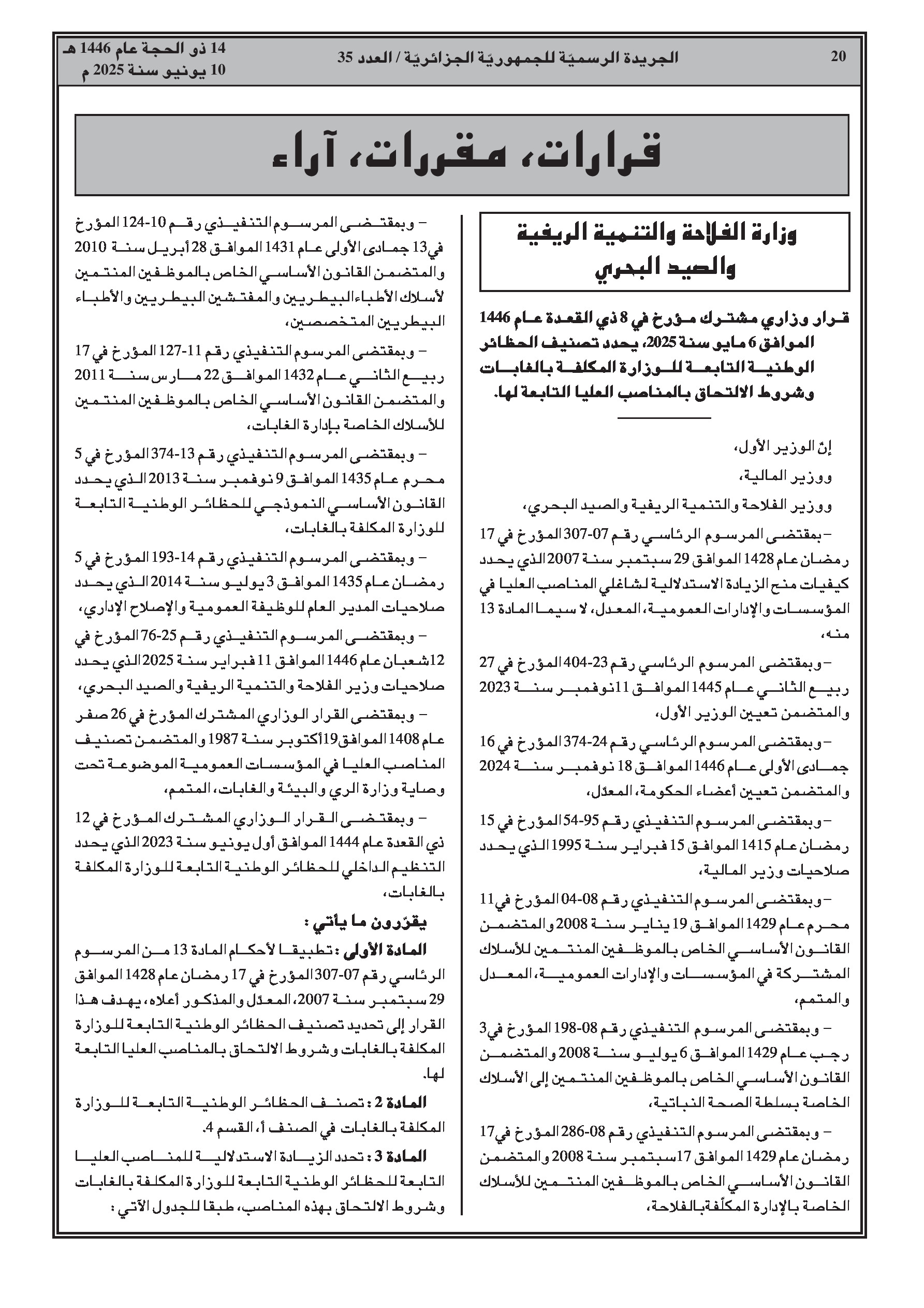 قرار وزاري مشترك (وزارة الفلاحة) يحدد تصنيف الحظائر الوطنية التابعة للوزارة المكلفة بالغابات وشروط الالتحاق بالمناصب العليا بها (صفحات 18-22). قرار يعدل قائمة أعضاء مجلس إدارة المدرسة الوطنية للغابات. قرار آخر يعين أعضاء المجلس العلمي للحظيرة الوطنية بلزمة (باتنة). وأخيراً، قرار يعدل أعضاء مجلس التوجيه للوكالة الوطنية للتغيرات المناخية.