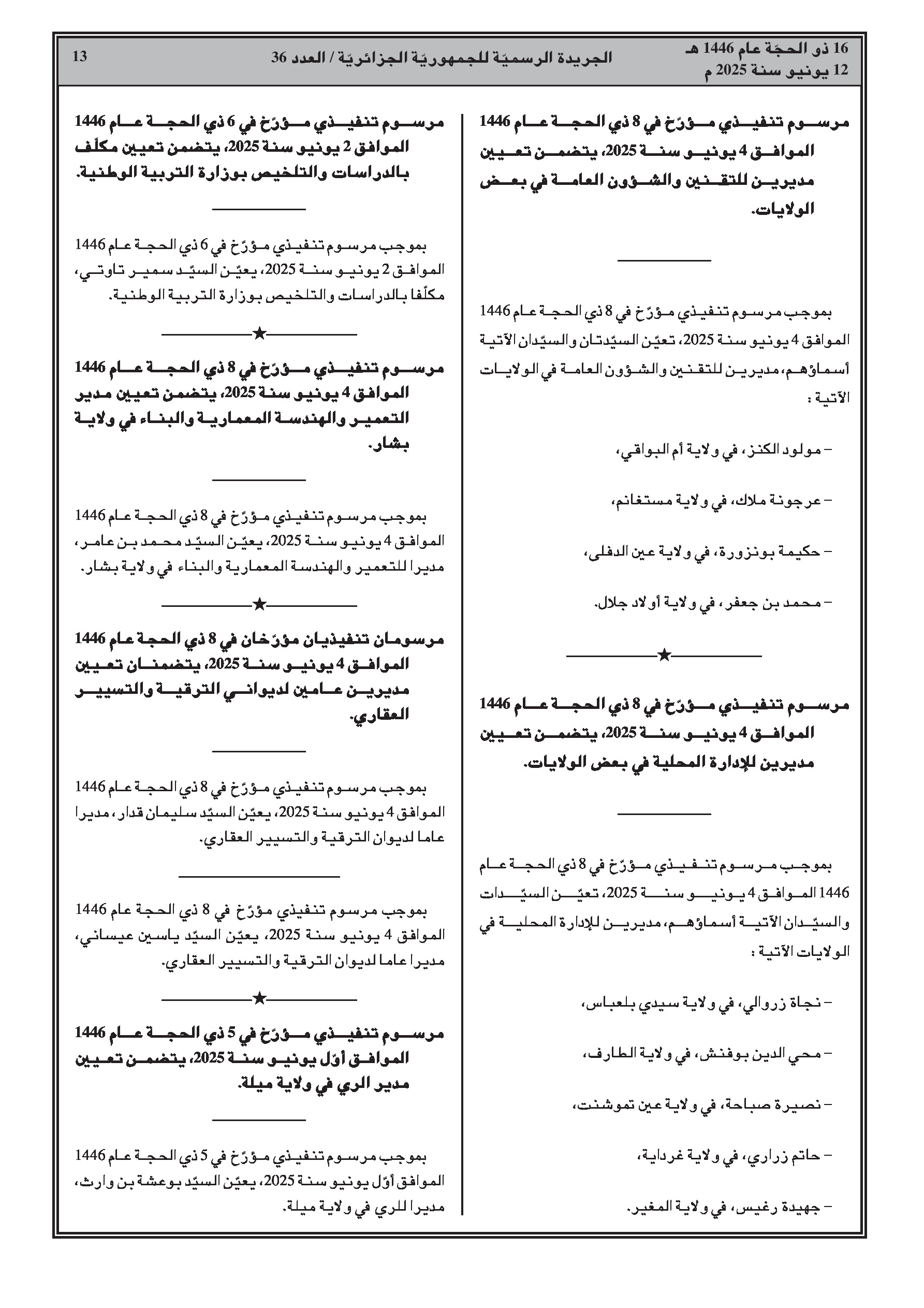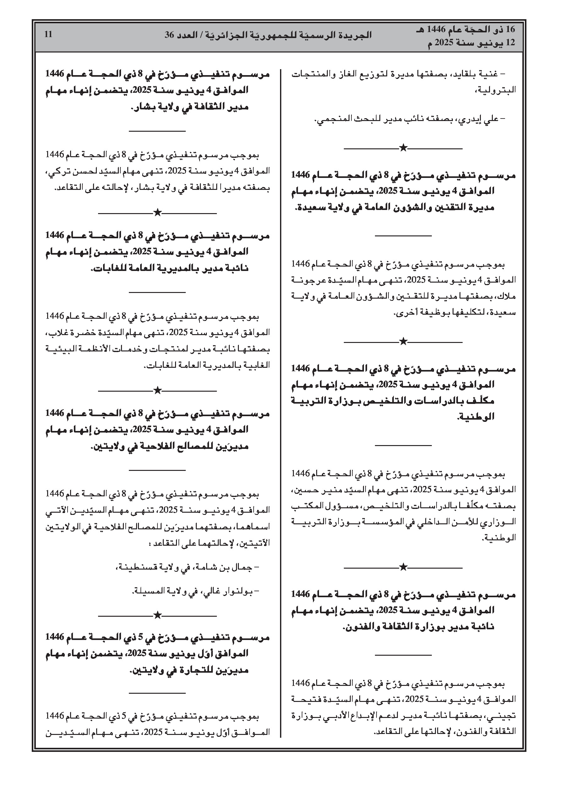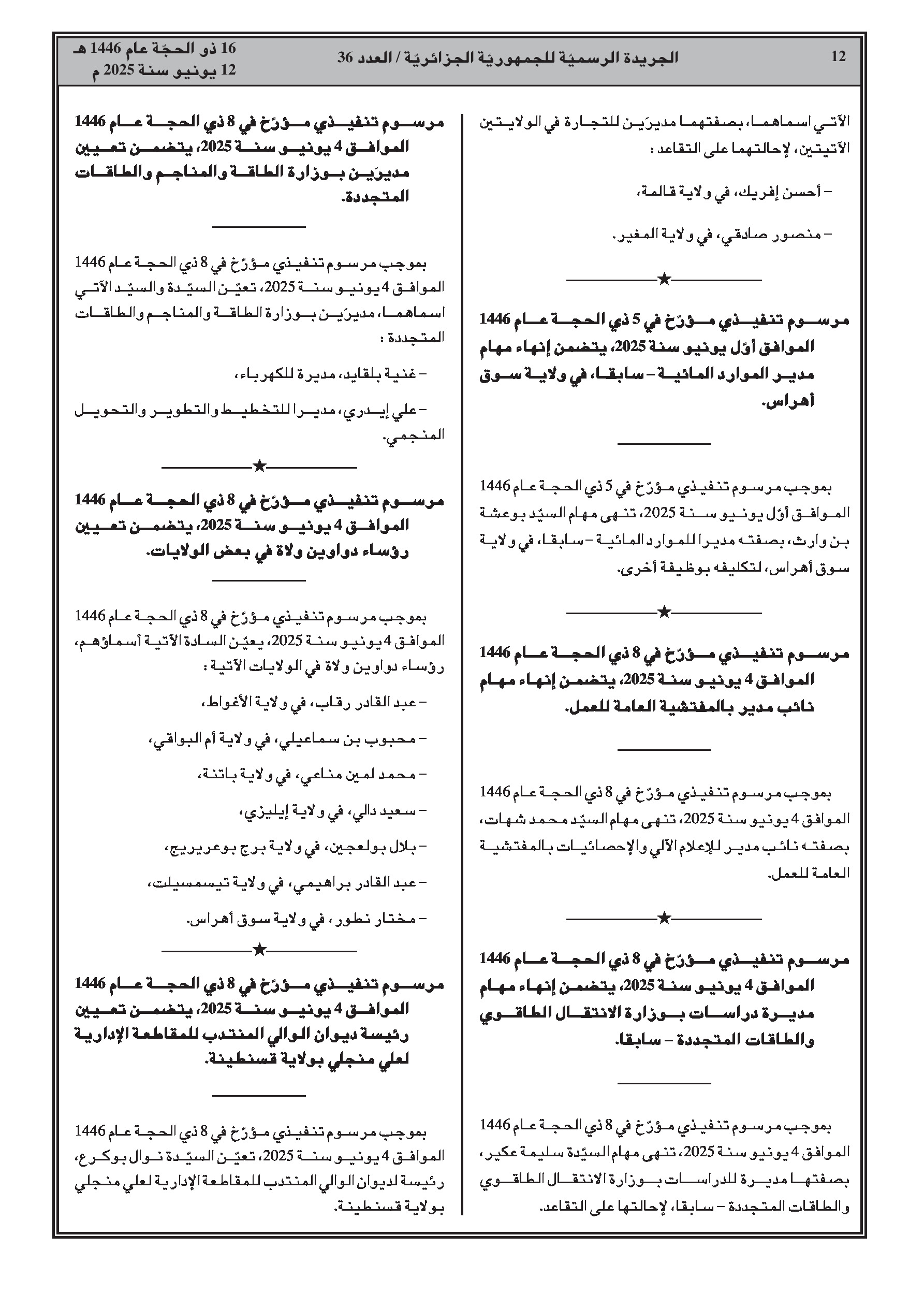 • إنهاء مهام الأمين العام للمركز الوطني للأرشيف. • تعيين مديرة الدراسات الوثائقية والمطبوعات بالأكاديمية الجزائرية للغة العربية. • تعيين رئيسة دراسات بالأمانة الإدارية والتقنية للمجلس الأعلى للشباب. • إنهاء مهام بوزارة الطاقة والمناجم (سابقا). • إنهاء مهام مديرة التنظيم والشؤون العامة لولاية سعيدة. • إنهاء مهام مكلف بالدراسات والتلخيص بوزارة التربية الوطنية. • إنهاء مهام نائبة مدير بوزارة الثقافة والفنون. • إنهاء مهام مدير الثقافة لولاية بشار. • إنهاء مهام نائبة مدير بالمديرية العامة للغابات. • إنهاء مهام مديري المصالح الفلاحية لولايات. • إنهاء مهام مديري التجارة لولايات. • إنهاء مهام المدير السابق للموارد المائية لولاية سوق أهراس. • إنهاء مهام نائب مدير بالمفتشية العامة للعمل. • إنهاء مهام مديرة دراسات بوزارة الانتقال الطاقوي والطاقات المتجددة (سابقا). • تعيين مديرين بوزارة الطاقة والمناجم والطاقات المتجددة. • تعيين رؤساء دواوين ولاة في بعض الولايات. • تعيين رئيس ديوان الوالي المنتدب للمقاطعة الإدارية علي منجلي بولاية قسنطينة. • تعيين مديري التنظيم والشؤون العامة في بعض الولايات. • تعيين مديري الإدارة المحلية في بعض الولايات. • تعيين مكلف بالدراسات والتلخيص بوزارة التربية الوطنية. • تعيين مدير التعمير والهندسة المعمارية والبناء لولاية بشار. • تعيين مديرين عامين لدواوين الترقية والتسيير العقاري. • تعيين مدير الري لولاية ميلة.