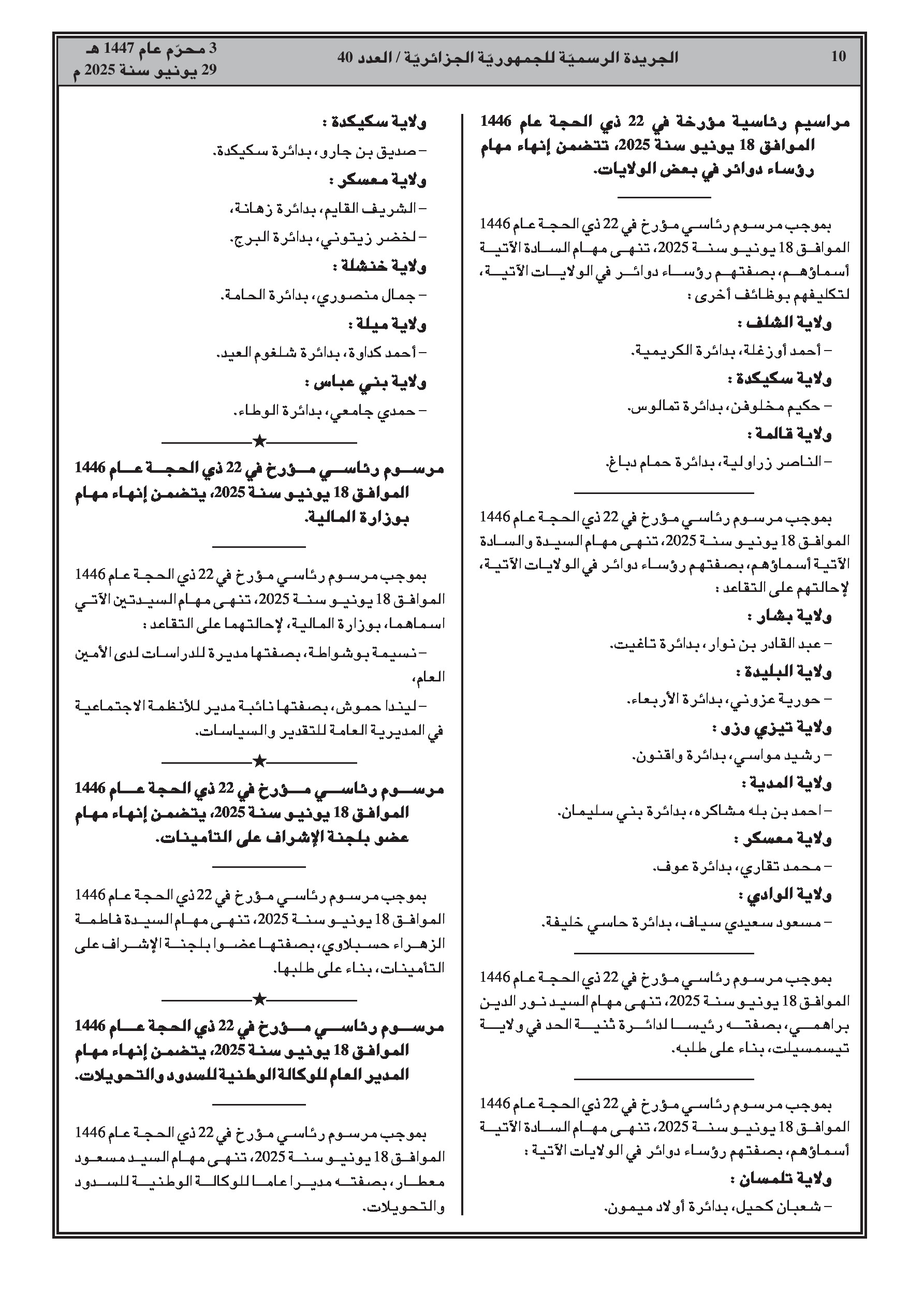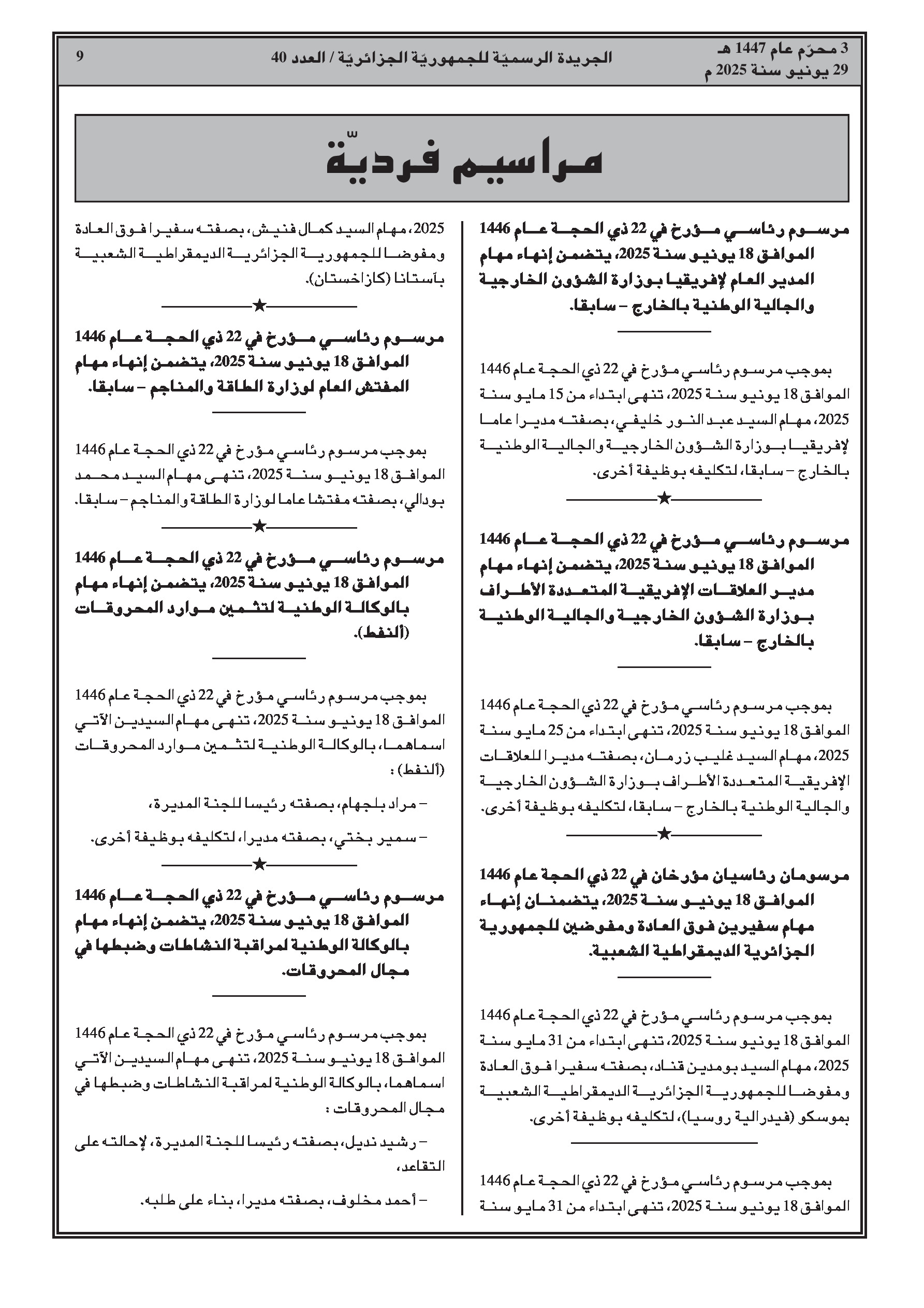 سلسلة من المراسيم الرئاسية تتضمن إنهاء مهام وتعيين عدد من المسؤولين السامين في مختلف الوزارات والهيئات الوطنية.