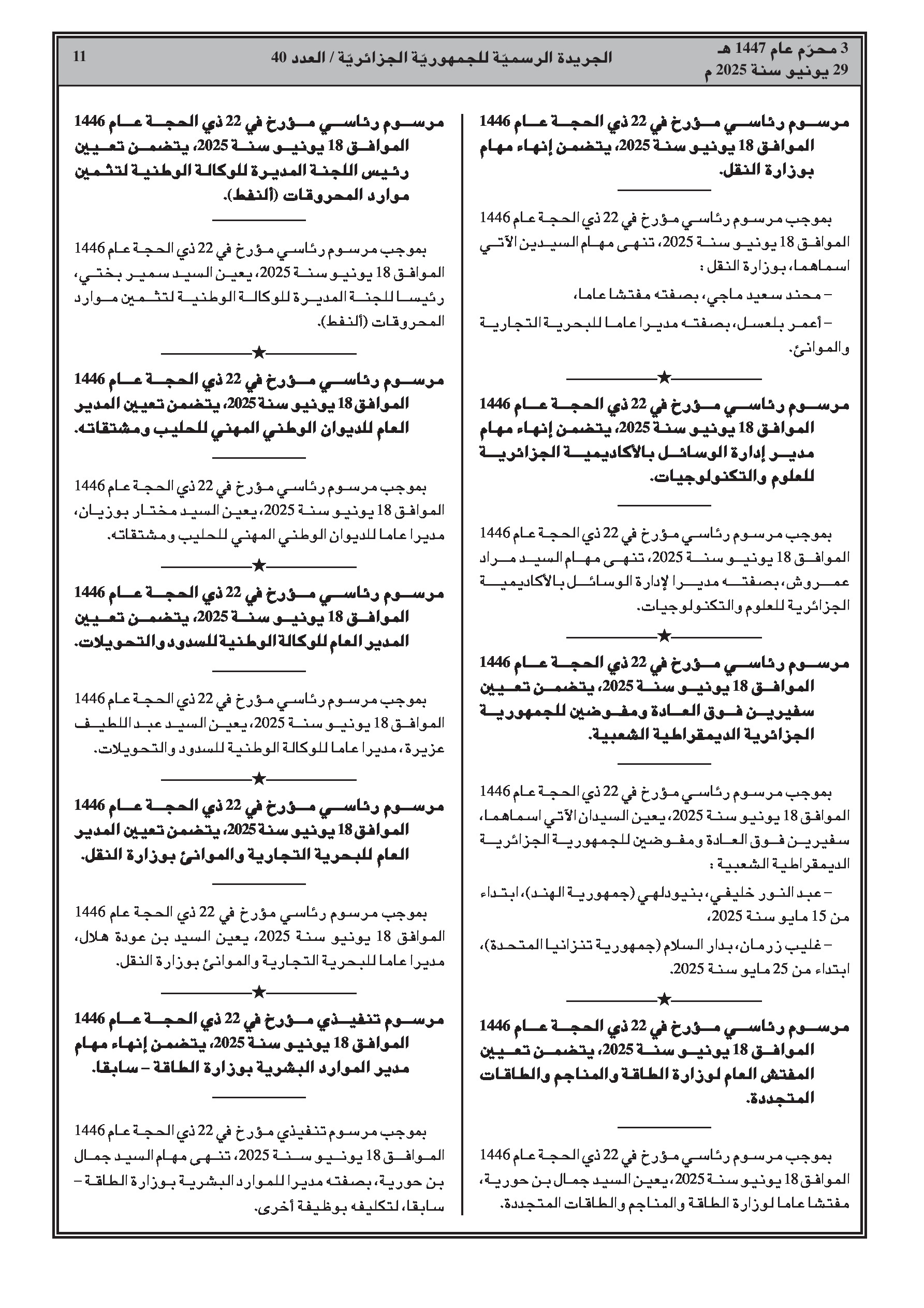 تم إنهاء مهام وتعيين مسؤولين في قطاعات الشؤون الخارجية (سفراء ومديرون)، الطاقة والمناجم (الوكالة الوطنية لتثمين موارد المحروقات، المفتشية العامة)، النقل (مدير عام البحرية التجارية والموانئ)، الموارد المائية (الوكالة الوطنية للسدود والتحويلات)، وغيرها من الإدارات.
