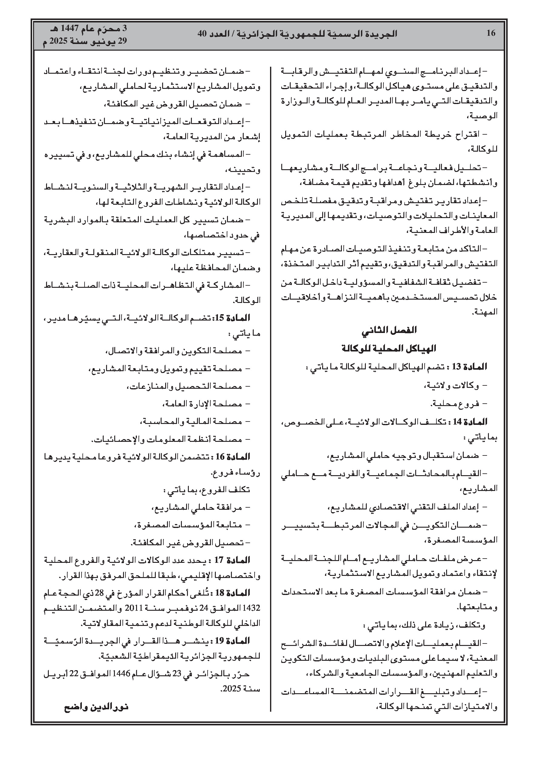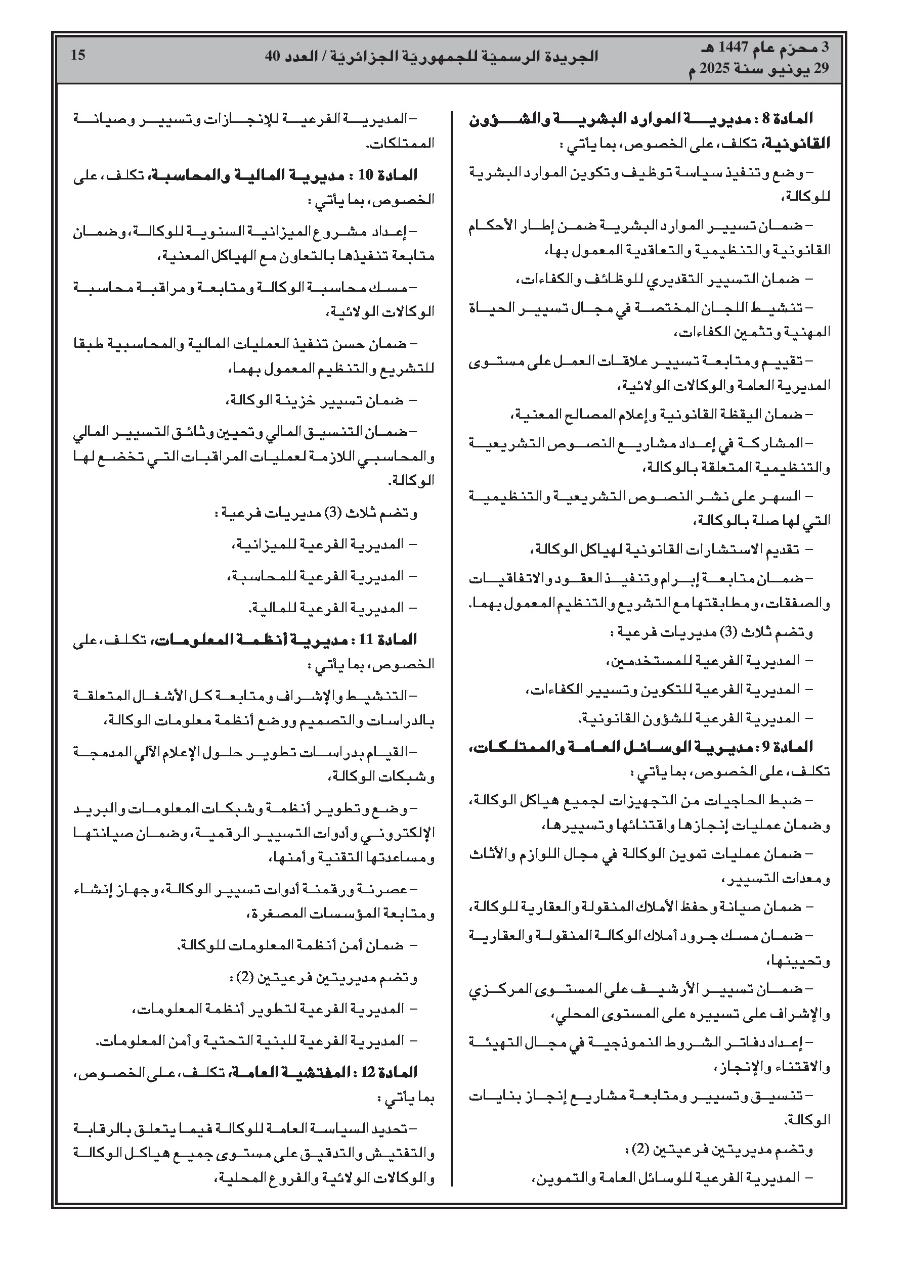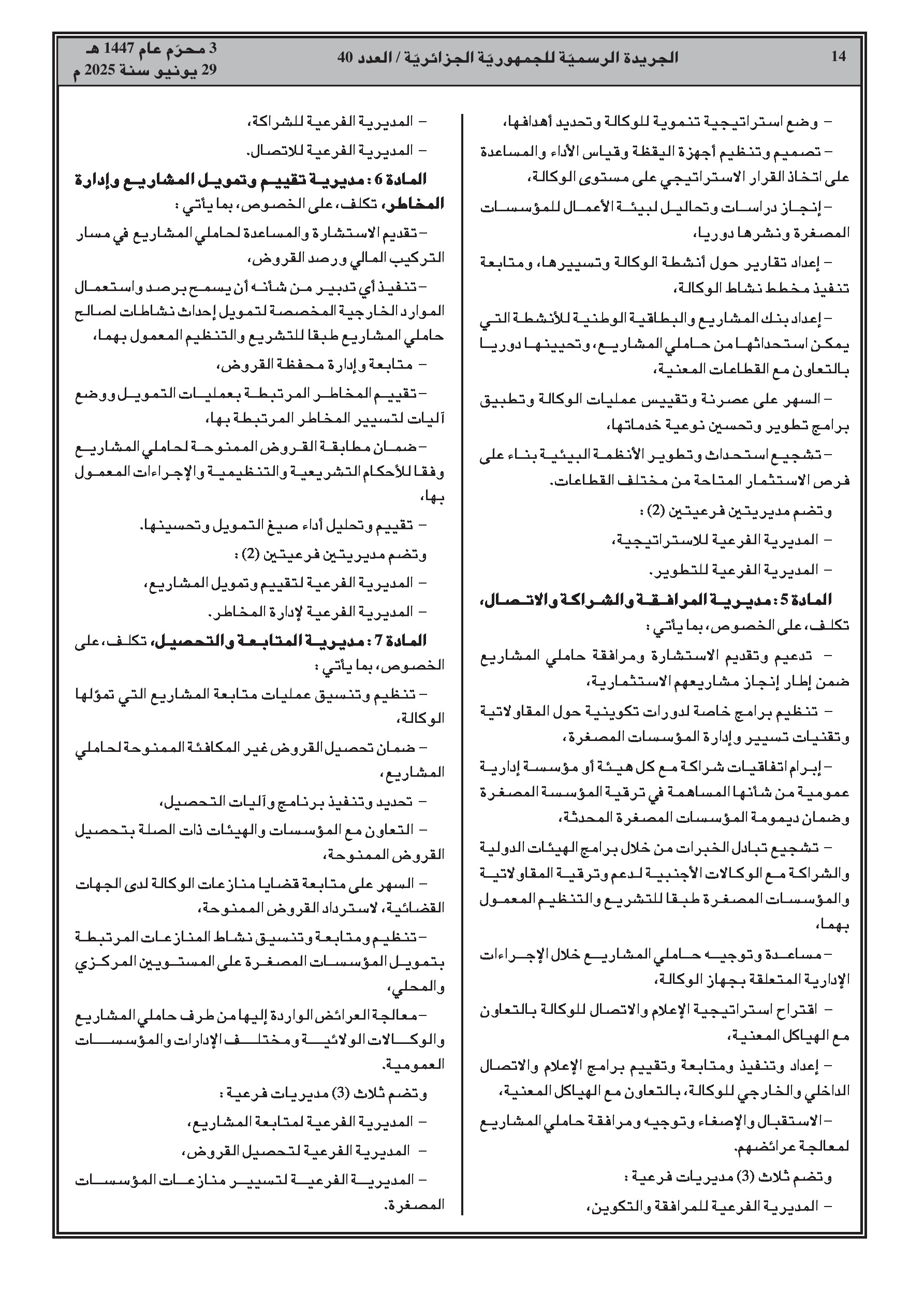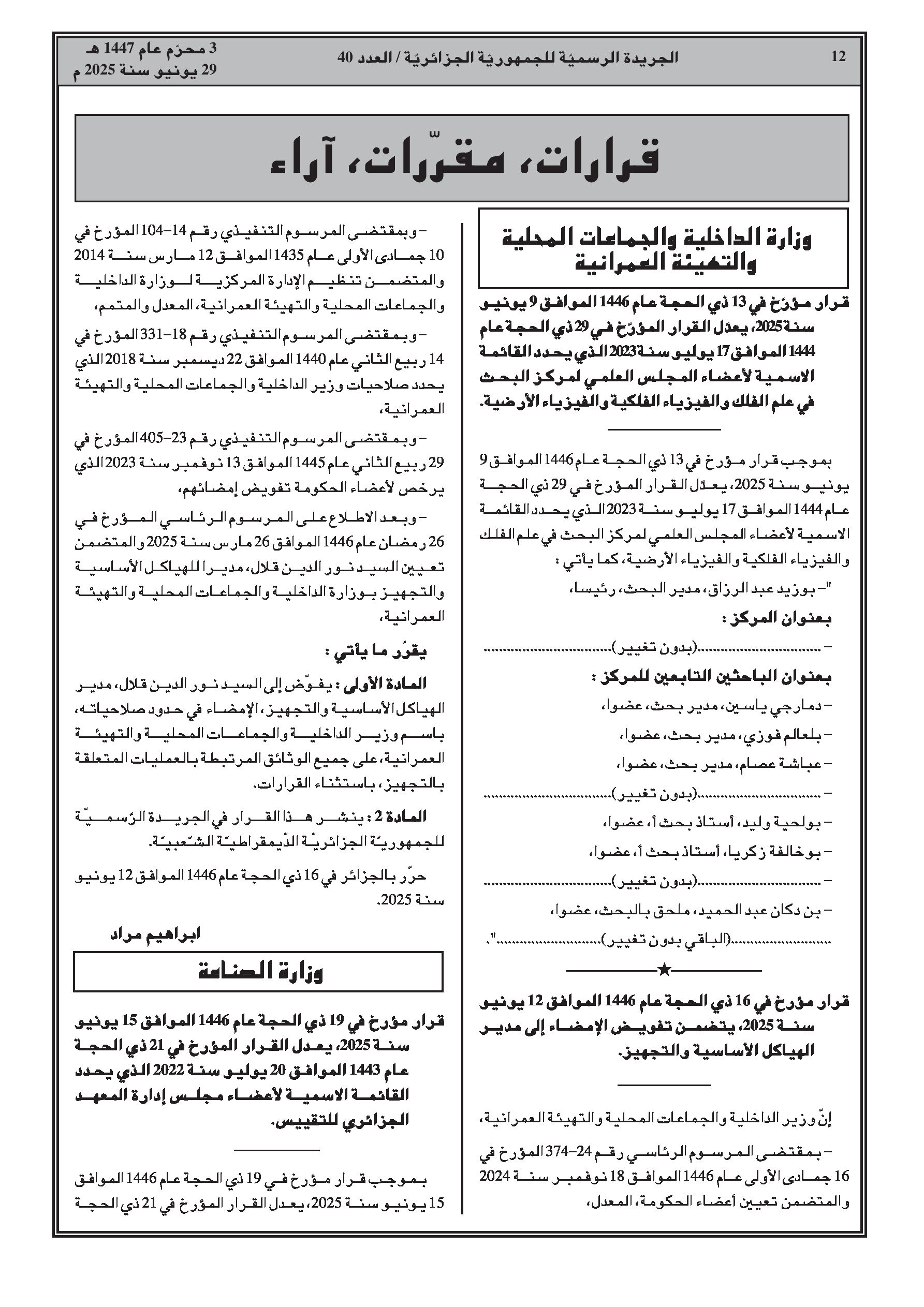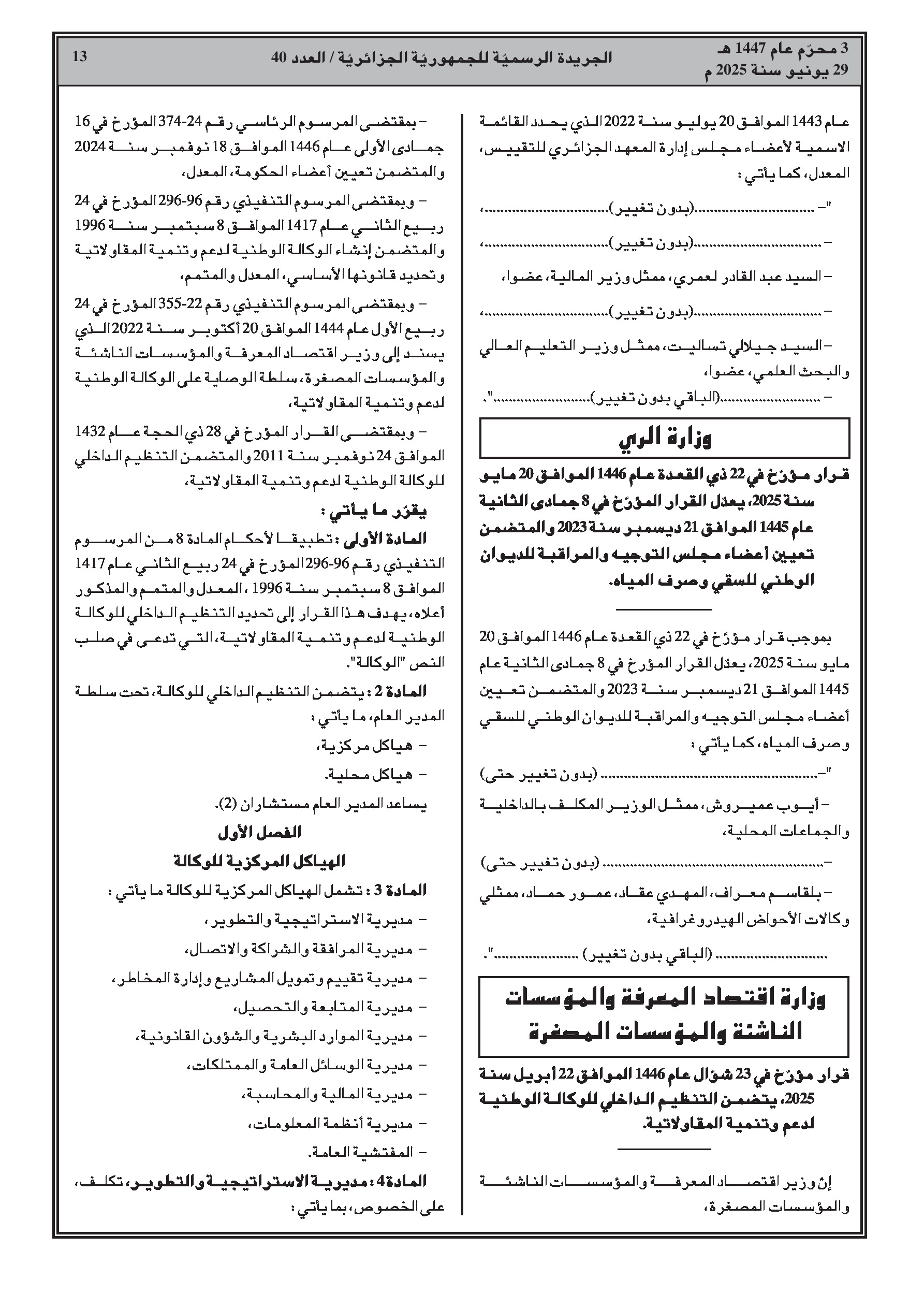 يحدد القرار التنظيم الداخلي للوكالة الوطنية لدعم وتنمية المقاولاتية، مفصلاً هياكلها المركزية والمحلية ومهامها. تم تعديل قوائم أعضاء مجالس إدارة كل من المعهد الجزائري للتقييس والديوان الوطني للسقي وصرف المياه، بالإضافة إلى المجلس العلمي لمركز البحث في علم الفلك والفيزياء الفلكية والجيوفيزياء.