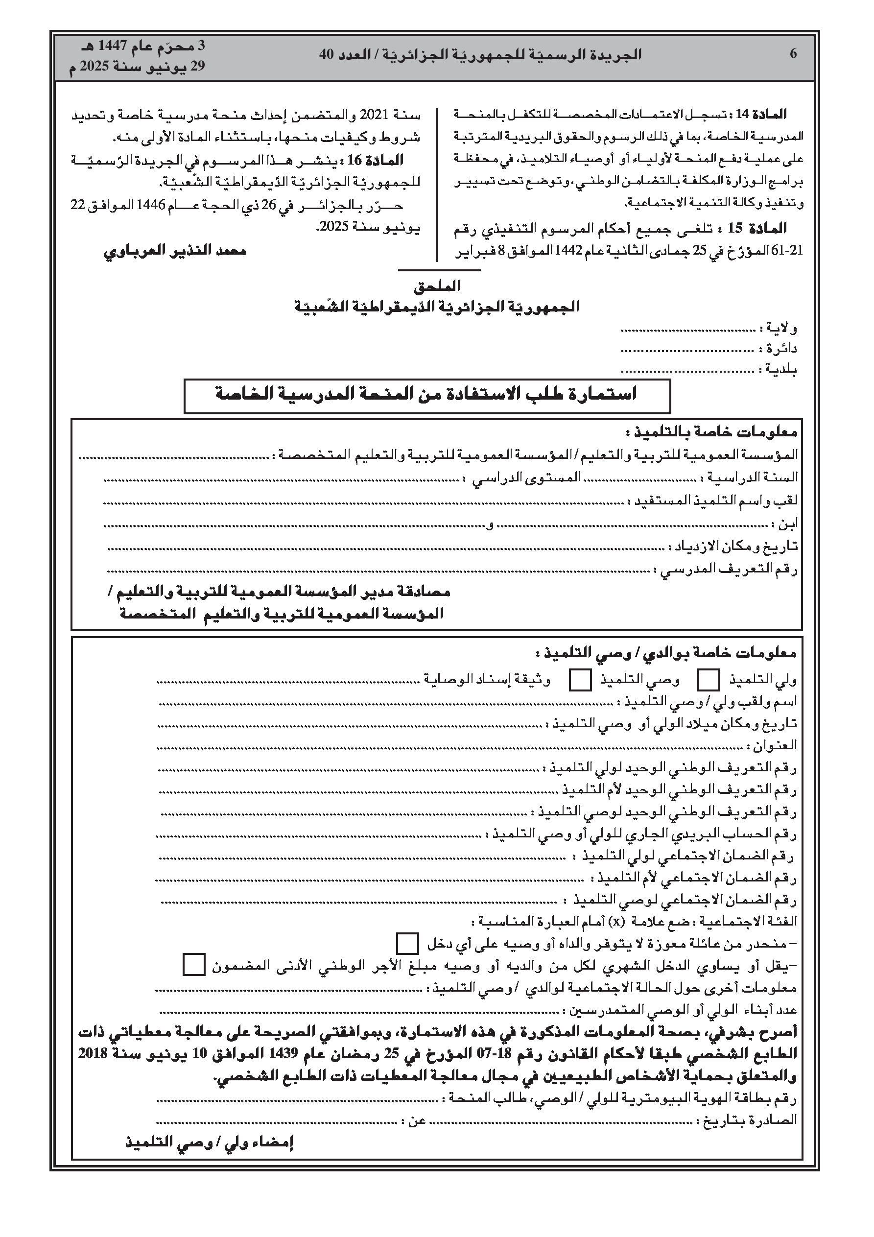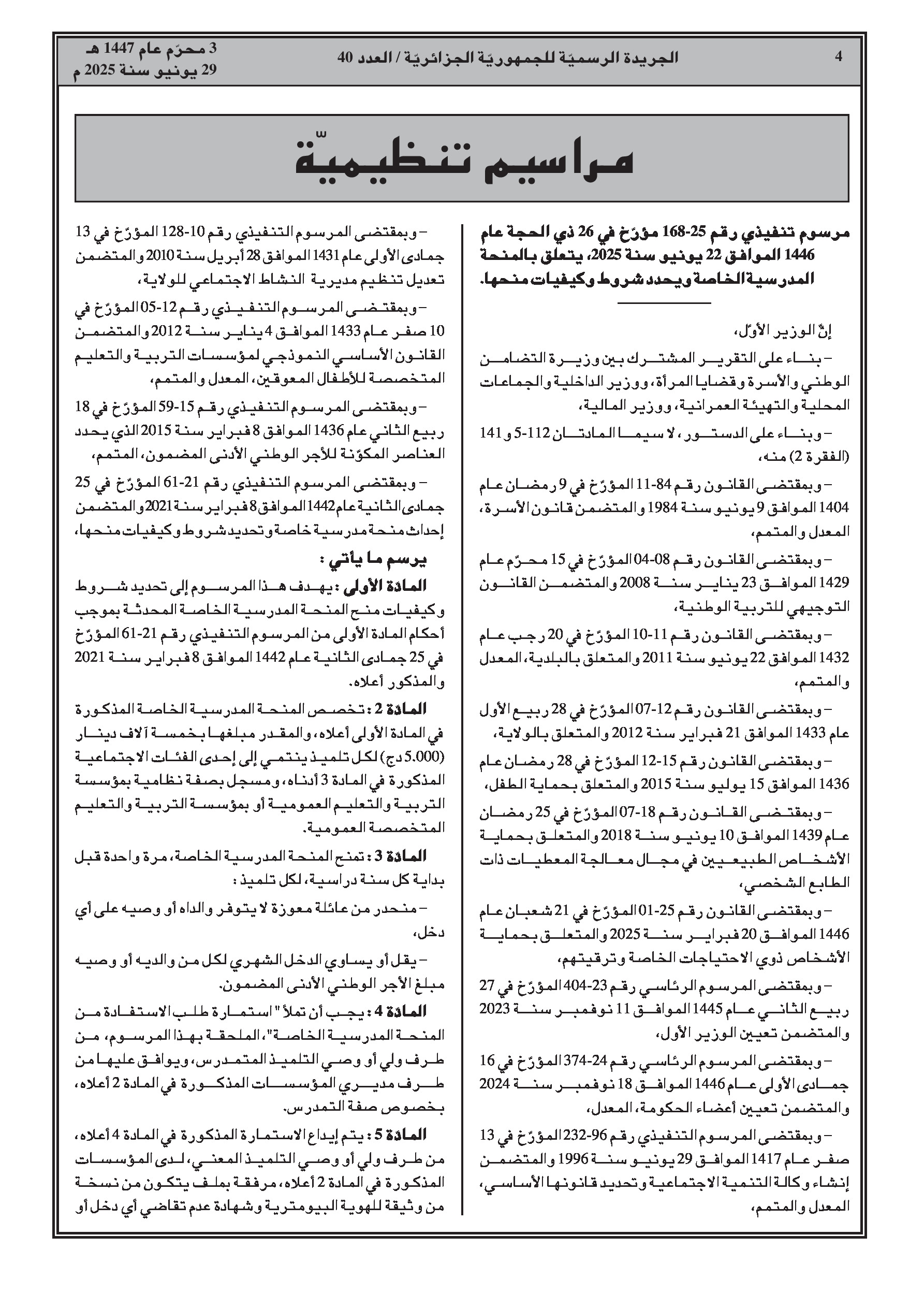 مرسوم تنفيذي يحدد شروط وكيفيات الاستفادة من المنحة المدرسية الخاصة التي تهدف إلى دعم الأسر المعوزة في بداية كل عام دراسي.