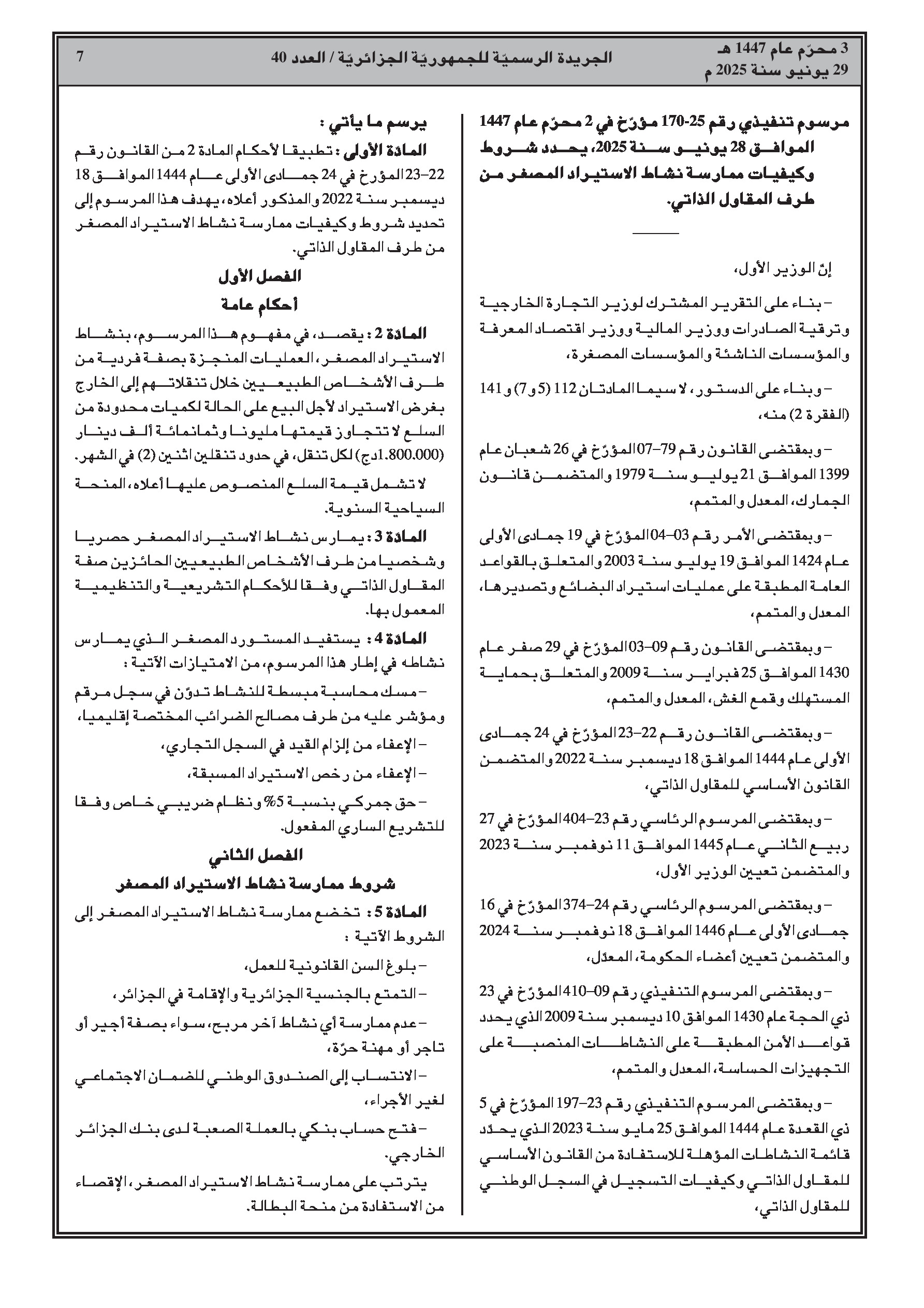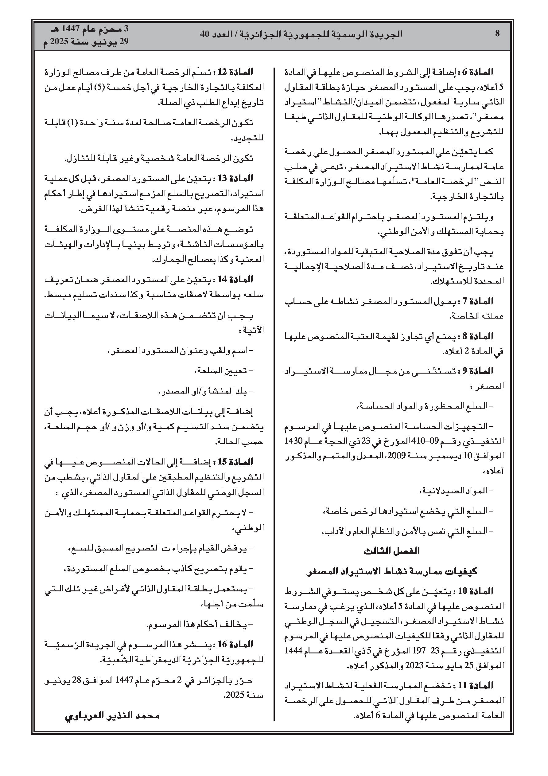 مرسوم تنفيذي يضع إطارًا قانونيًا لنشاط الاستيراد المصغر الذي يمارسه المقاولون الذاتيون بهدف بيع البضائع على حالتها، مما يضفي الطابع الرسمي على نشاط كان غير منظم سابقًا.