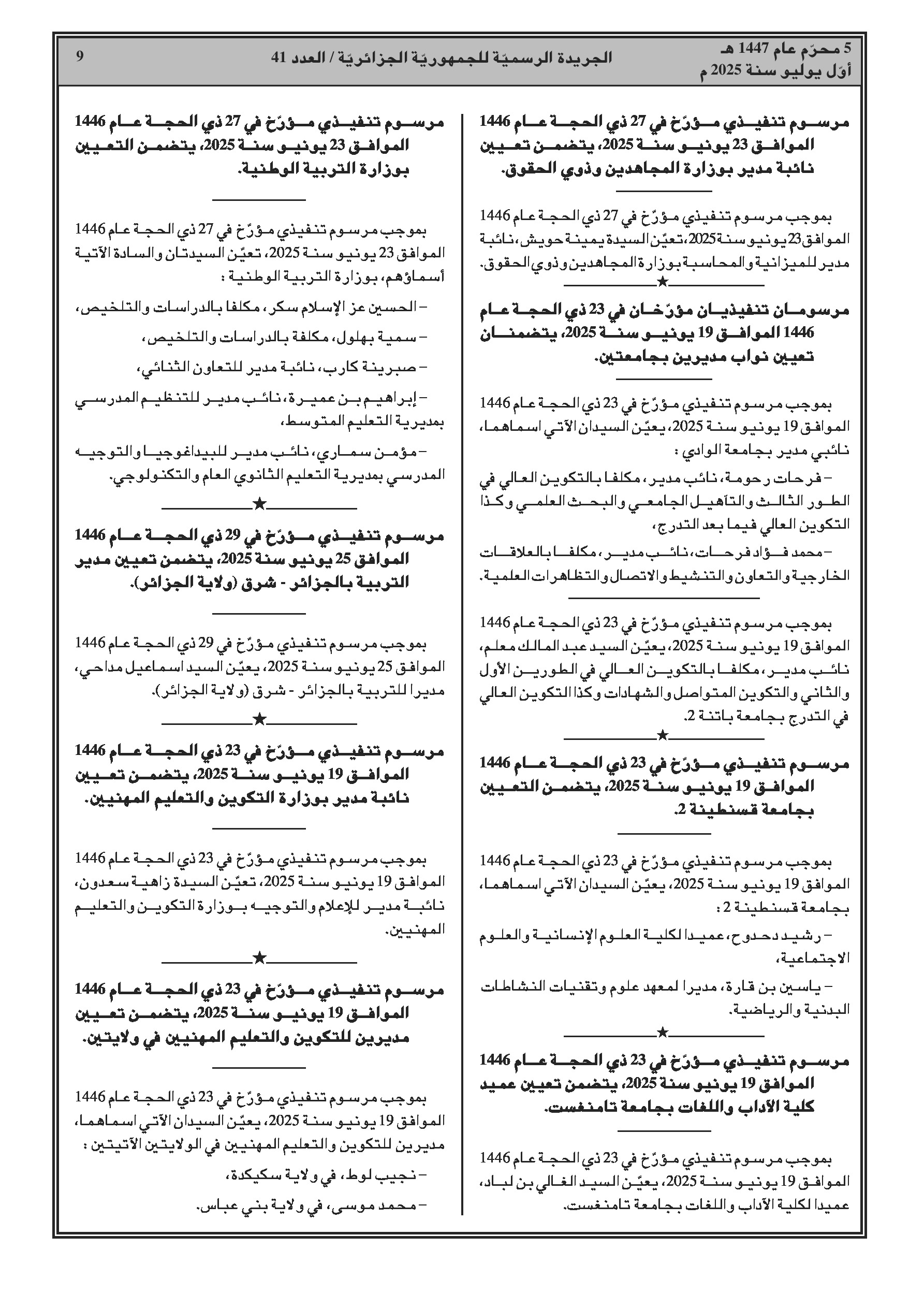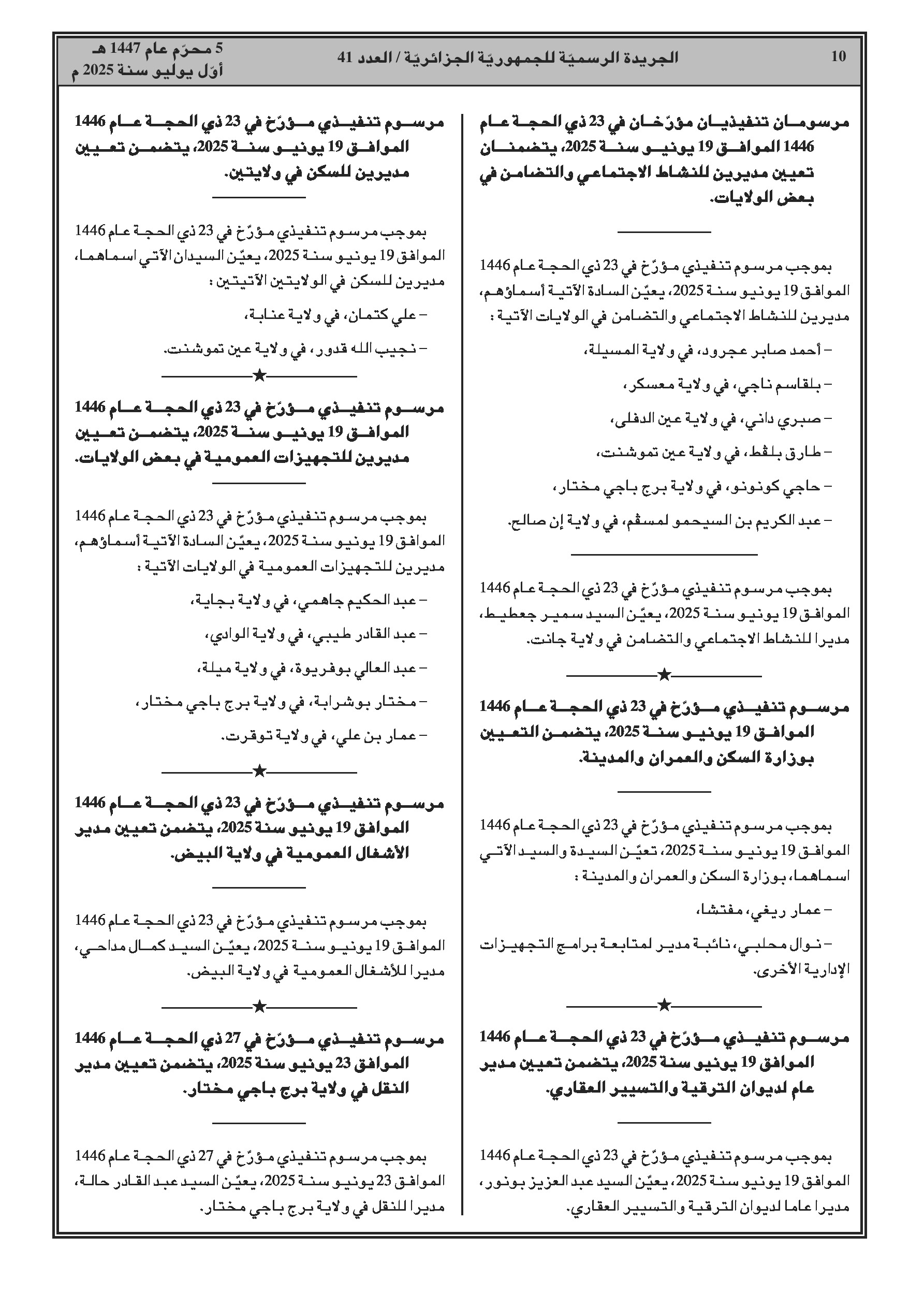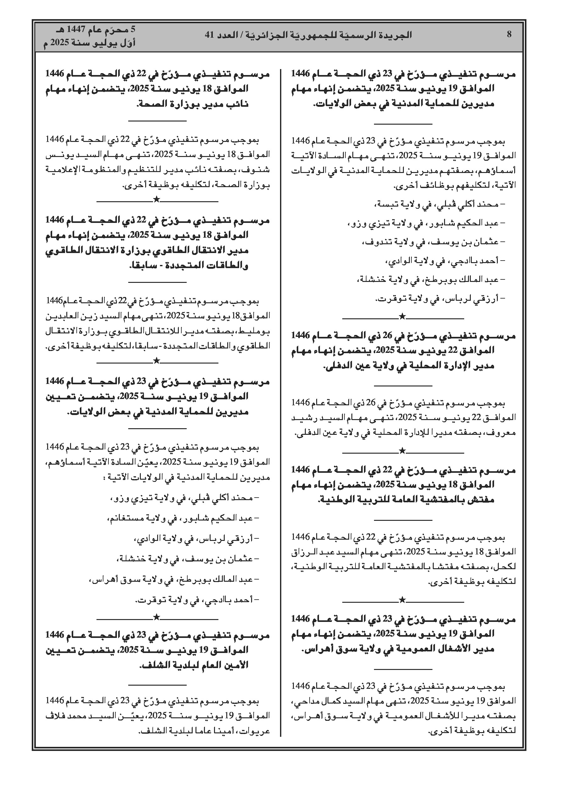 صدور عدة مراسيم رئاسية وتنفيذية تتضمن تعيين وإنهاء مهام مسؤولين سامين في مختلف القطاعات الحكومية.